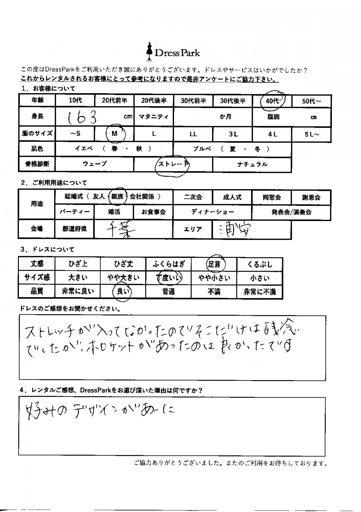 千葉県 Y.H様163㎝ Mサイズ舞浜・浦安・幕張 #40代#M/L#160~164㎝#結婚式(親族)#千葉県#舞浜・浦安・幕張 ◆レンタルしたドレスはこちら ◆レンタルしたサイズは:M ◆レンタルした日付:2026/03/08 ドレスの着用感 ◆点数: (4点) ◆丈感:足首 ◆サイズ感:丁度いい ◆品質:良い ◆骨格診断:ストレート ドレスの感想 ストレッチが入ってなかったので、そこだけは残念でしたが、ポケットがあったのは良かったです。 レンタルのご感想、DressParkをお選び頂いた理由 好みのデザインがあった。 CUSTOMER REVIEWS お客様の声 気になるカテゴリー別にご利用の感想をチェック! ◆AGE 年代で見る 10代 20代 30代 40代 50代~ ◆SIZE サイズで見る SS/S M/L 大きいサイズLL~ ◆HIGHT 身長で見る 140~149㎝ 150~154㎝ 155~159㎝ 160~164㎝ 165~169㎝ 170㎝以上 ◆マタニティ ~3か月 4~6か月 7~8か月 9~10か月 ◆肌色 イエベ ブルべ ◆骨格診断 ウェーブ ストレート ナチュラル ◆利用シーン 結婚式(友人) 結婚式(親族) 結婚式(会社関係) 二次会 成人式/同窓会 謝恩会 パーティー その他 CUSTOMER REVIEWS都道府県別お客様の声 都道府県別にのお客様の声をチェック! 北海道 青森県 岩手県 宮城県 秋田県 山形県 福島県 茨城県 栃木県 群馬県 埼玉県 千葉県 東京都 神奈川県 新潟県 富山県 石川県 福井県 山梨県 長野県 岐阜県 静岡県 愛知県 三重県 滋賀県 京都府 大阪府 兵庫県 奈良県 和歌山県 鳥取県 島根県 岡山県 広島県 山口県 徳島県 香川県 愛媛県 高知県 福岡県 佐賀県 長崎県 熊本県 大分県 宮崎県 鹿児島県 沖縄県 CUSTOMER REVIEWSエリア別お客様の声 都道府県別にのお客様の声をチェック! 札幌 仙台 名古屋 軽井沢 金沢 神戸・芦屋 博多 那覇 梅田・新大阪 難波・心斎橋 鎌倉・湘南 横浜・みなとみらい 舞浜・浦安・幕張 大宮・浦和 青山・表参道 六本木・麻布 渋谷・恵比寿 新宿 池袋 銀座・丸の内 お台場・汐留 鹿児島市 郡山市 福島市 東予 甲府・石和 LINEでお問い合わせ このサイトではJavaScriptを使用しています