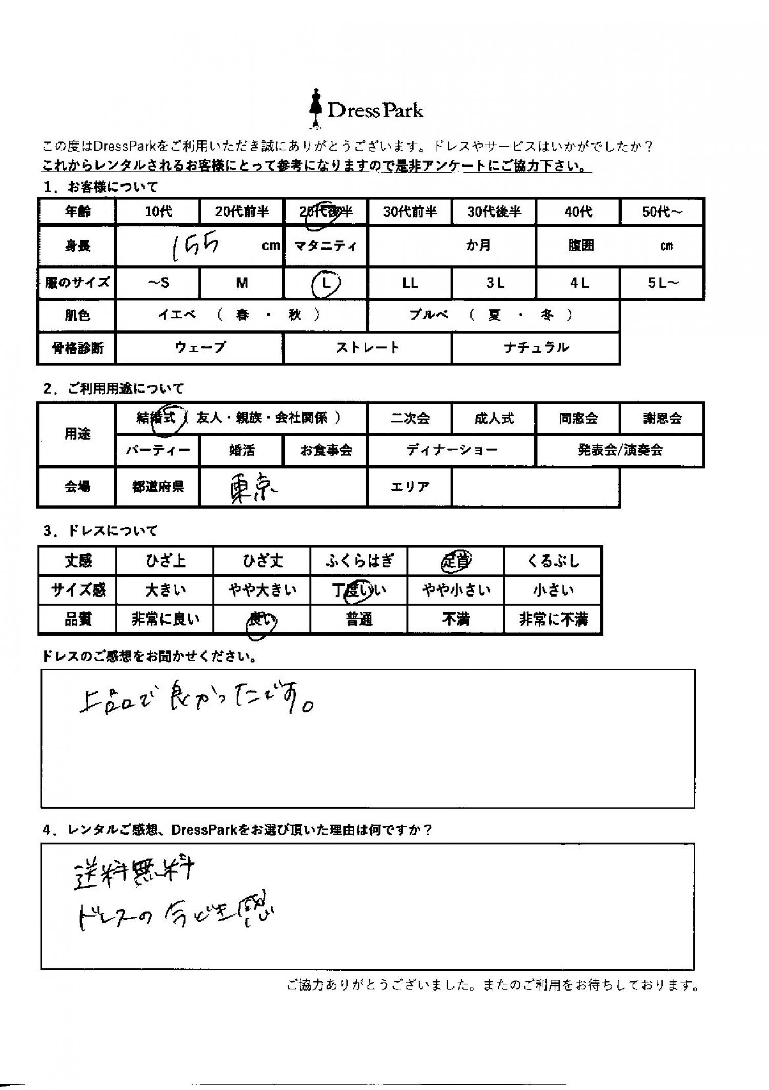 東京都 A.O様155㎝ Lサイズ #20代#M/L#155~159㎝#結婚式(友人)#東京都 ◆レンタルしたドレスはこちら ◆レンタルしたサイズは:L ◆レンタルした日付:2026/03/14 ドレスの着用感 ◆点数: (4点) ◆丈感:足首 ◆サイズ感:丁度いい ◆品質:良い ドレスの感想 上品でよかったです。 レンタルのご感想、DressParkをお選び頂いた理由 送料無料、ドレスの旬感。 CUSTOMER REVIEWS お客様の声 気になるカテゴリー別にご利用の感想をチェック! ◆AGE 年代で見る 10代 20代 30代 40代 50代~ ◆SIZE サイズで見る SS/S M/L 大きいサイズLL~ ◆HIGHT 身長で見る 140~149㎝ 150~154㎝ 155~159㎝ 160~164㎝ 165~169㎝ 170㎝以上 ◆マタニティ ~3か月 4~6か月 7~8か月 9~10か月 ◆肌色 イエベ ブルべ ◆骨格診断 ウェーブ ストレート ナチュラル ◆利用シーン 結婚式(友人) 結婚式(親族) 結婚式(会社関係) 二次会 成人式/同窓会 謝恩会 パーティー その他 CUSTOMER REVIEWS都道府県別お客様の声 都道府県別にのお客様の声をチェック! 北海道 青森県 岩手県 宮城県 秋田県 山形県 福島県 茨城県 栃木県 群馬県 埼玉県 千葉県 東京都 神奈川県 新潟県 富山県 石川県 福井県 山梨県 長野県 岐阜県 静岡県 愛知県 三重県 滋賀県 京都府 大阪府 兵庫県 奈良県 和歌山県 鳥取県 島根県 岡山県 広島県 山口県 徳島県 香川県 愛媛県 高知県 福岡県 佐賀県 長崎県 熊本県 大分県 宮崎県 鹿児島県 沖縄県 CUSTOMER REVIEWSエリア別お客様の声 都道府県別にのお客様の声をチェック! 札幌 仙台 名古屋 軽井沢 金沢 神戸・芦屋 博多 那覇 梅田・新大阪 難波・心斎橋 鎌倉・湘南 横浜・みなとみらい 舞浜・浦安・幕張 大宮・浦和 青山・表参道 六本木・麻布 渋谷・恵比寿 新宿 池袋 銀座・丸の内 お台場・汐留 鹿児島市 郡山市 福島市 東予 甲府・石和 LINEでお問い合わせ このサイトではJavaScriptを使用しています