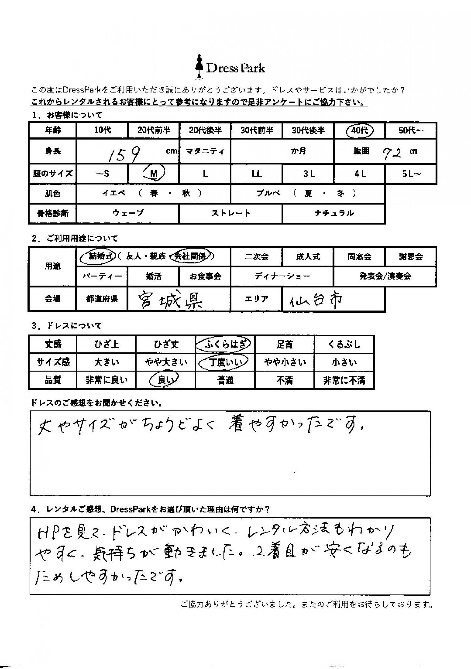 宮城県 R.O様159㎝ Mサイズ仙台 #40代#M/L#155~159㎝#結婚式(会社関係)#宮城県#仙台 ◆レンタルしたドレスはこちら ◆レンタルしたサイズは:M ◆レンタルした日付:2026/03/14 ドレスの着用感 ◆点数: (4点) ◆丈感:ふくらはぎ ◆サイズ感:丁度いい ◆品質:良い ドレスの感想 丈やサイズがちょうど良く、着やすかったです。 レンタルのご感想、DressParkをお選び頂いた理由 ホームページを見てドレスが可愛く、レンタル方法のわかりやすく気持ちが動きました。2着目が安くなるのも試しやすかったです。 CUSTOMER REVIEWS お客様の声 気になるカテゴリー別にご利用の感想をチェック! ◆AGE 年代で見る 10代 20代 30代 40代 50代~ ◆SIZE サイズで見る SS/S M/L 大きいサイズLL~ ◆HIGHT 身長で見る 140~149㎝ 150~154㎝ 155~159㎝ 160~164㎝ 165~169㎝ 170㎝以上 ◆マタニティ ~3か月 4~6か月 7~8か月 9~10か月 ◆肌色 イエベ ブルべ ◆骨格診断 ウェーブ ストレート ナチュラル ◆利用シーン 結婚式(友人) 結婚式(親族) 結婚式(会社関係) 二次会 成人式/同窓会 謝恩会 パーティー その他 CUSTOMER REVIEWS都道府県別お客様の声 都道府県別にのお客様の声をチェック! 北海道 青森県 岩手県 宮城県 秋田県 山形県 福島県 茨城県 栃木県 群馬県 埼玉県 千葉県 東京都 神奈川県 新潟県 富山県 石川県 福井県 山梨県 長野県 岐阜県 静岡県 愛知県 三重県 滋賀県 京都府 大阪府 兵庫県 奈良県 和歌山県 鳥取県 島根県 岡山県 広島県 山口県 徳島県 香川県 愛媛県 高知県 福岡県 佐賀県 長崎県 熊本県 大分県 宮崎県 鹿児島県 沖縄県 CUSTOMER REVIEWSエリア別お客様の声 都道府県別にのお客様の声をチェック! 札幌 仙台 名古屋 軽井沢 金沢 神戸・芦屋 博多 那覇 梅田・新大阪 難波・心斎橋 鎌倉・湘南 横浜・みなとみらい 舞浜・浦安・幕張 大宮・浦和 青山・表参道 六本木・麻布 渋谷・恵比寿 新宿 池袋 銀座・丸の内 お台場・汐留 鹿児島市 郡山市 福島市 東予 甲府・石和 LINEでお問い合わせ このサイトではJavaScriptを使用しています