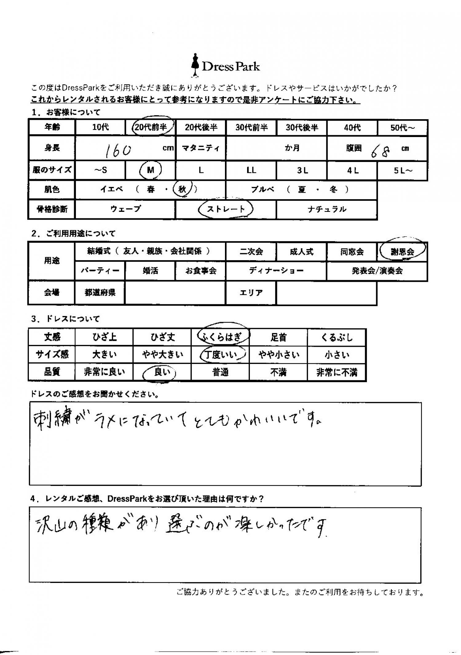 愛知県 N.F様160㎝ Mサイズ名古屋 #20代#M/L#160~164㎝#謝恩会#愛知県#名古屋 ◆レンタルしたドレスはこちら ◆レンタルしたサイズは:M ◆レンタルした日付:2026/03/12 ドレスの着用感 ◆点数: (4点) ◆丈感:ふくらはぎ ◆サイズ感:丁度いい ◆品質:良い ◆肌色:イエベ ◆骨格診断:ストレート ドレスの感想 刺繍がラメになっていてとても可愛いです。 レンタルのご感想、DressParkをお選び頂いた理由 たくさんの種類があり、選ぶのが楽しかったです。 CUSTOMER REVIEWS お客様の声 気になるカテゴリー別にご利用の感想をチェック! ◆AGE 年代で見る 10代 20代 30代 40代 50代~ ◆SIZE サイズで見る SS/S M/L 大きいサイズLL~ ◆HIGHT 身長で見る 140~149㎝ 150~154㎝ 155~159㎝ 160~164㎝ 165~169㎝ 170㎝以上 ◆マタニティ ~3か月 4~6か月 7~8か月 9~10か月 ◆肌色 イエベ ブルべ ◆骨格診断 ウェーブ ストレート ナチュラル ◆利用シーン 結婚式(友人) 結婚式(親族) 結婚式(会社関係) 二次会 成人式/同窓会 謝恩会 パーティー その他 CUSTOMER REVIEWS都道府県別お客様の声 都道府県別にのお客様の声をチェック! 北海道 青森県 岩手県 宮城県 秋田県 山形県 福島県 茨城県 栃木県 群馬県 埼玉県 千葉県 東京都 神奈川県 新潟県 富山県 石川県 福井県 山梨県 長野県 岐阜県 静岡県 愛知県 三重県 滋賀県 京都府 大阪府 兵庫県 奈良県 和歌山県 鳥取県 島根県 岡山県 広島県 山口県 徳島県 香川県 愛媛県 高知県 福岡県 佐賀県 長崎県 熊本県 大分県 宮崎県 鹿児島県 沖縄県 CUSTOMER REVIEWSエリア別お客様の声 都道府県別にのお客様の声をチェック! 札幌 仙台 名古屋 軽井沢 金沢 神戸・芦屋 博多 那覇 梅田・新大阪 難波・心斎橋 鎌倉・湘南 横浜・みなとみらい 舞浜・浦安・幕張 大宮・浦和 青山・表参道 六本木・麻布 渋谷・恵比寿 新宿 池袋 銀座・丸の内 お台場・汐留 鹿児島市 郡山市 福島市 東予 甲府・石和 LINEでお問い合わせ このサイトではJavaScriptを使用しています