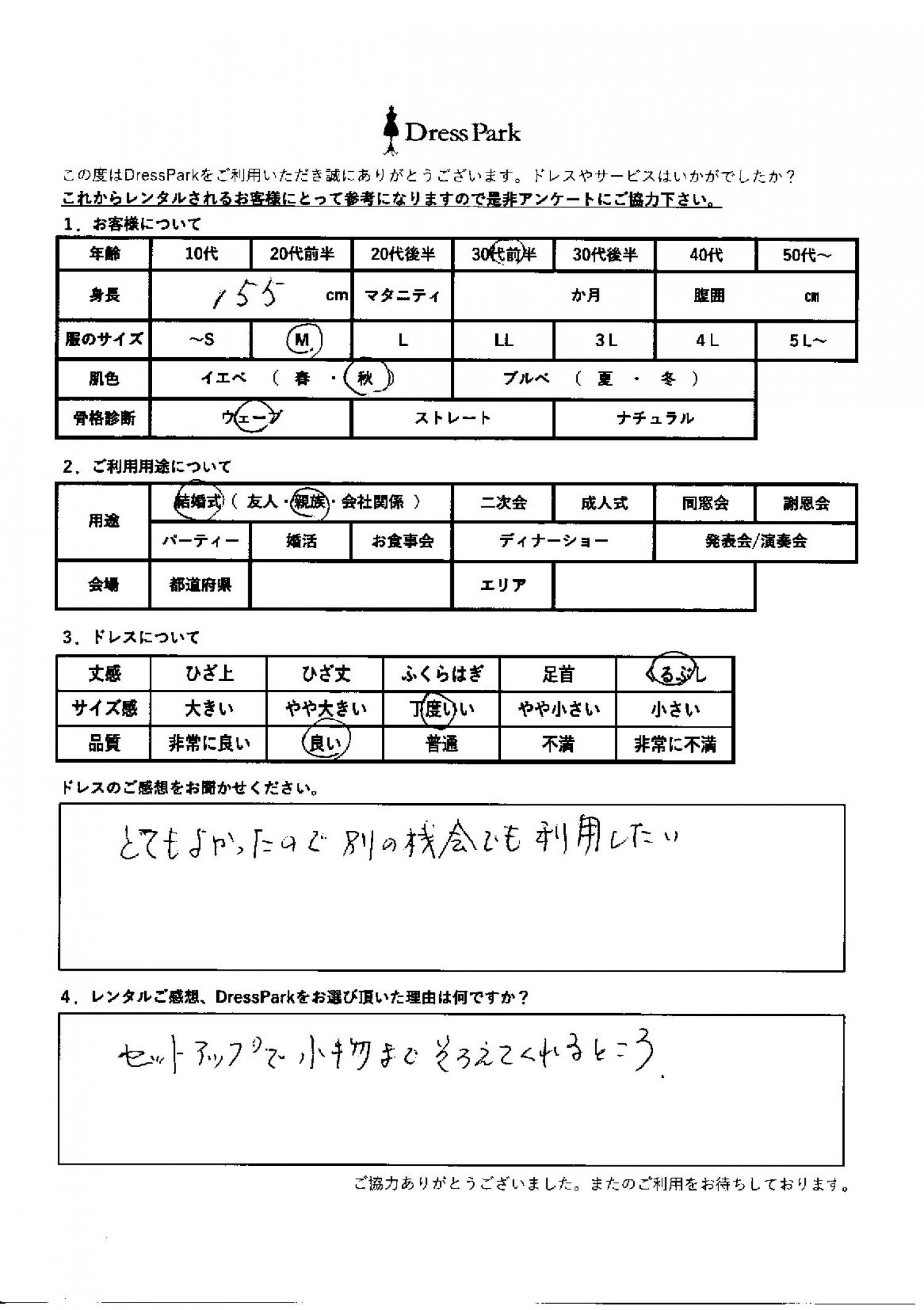 埼玉県 H.O様155㎝ Mサイズ #30代#M/L#155~159㎝#結婚式(親族)#埼玉県 ◆レンタルしたドレスはこちら ◆レンタルしたサイズは:M ◆レンタルした日付:2026/03/12 ドレスの着用感 ◆点数: (4点) ◆丈感:くるぶし ◆サイズ感:丁度いい ◆品質:良い ◆肌色:イエベ ◆骨格診断:ウェーブ ドレスの感想 とても良かったので、別の機会でも利用したい。 レンタルのご感想、DressParkをお選び頂いた理由 セットアップで小物まで揃えてくれるところ。 CUSTOMER REVIEWS お客様の声 気になるカテゴリー別にご利用の感想をチェック! ◆AGE 年代で見る 10代 20代 30代 40代 50代~ ◆SIZE サイズで見る SS/S M/L 大きいサイズLL~ ◆HIGHT 身長で見る 140~149㎝ 150~154㎝ 155~159㎝ 160~164㎝ 165~169㎝ 170㎝以上 ◆マタニティ ~3か月 4~6か月 7~8か月 9~10か月 ◆肌色 イエベ ブルべ ◆骨格診断 ウェーブ ストレート ナチュラル ◆利用シーン 結婚式(友人) 結婚式(親族) 結婚式(会社関係) 二次会 成人式/同窓会 謝恩会 パーティー その他 CUSTOMER REVIEWS都道府県別お客様の声 都道府県別にのお客様の声をチェック! 北海道 青森県 岩手県 宮城県 秋田県 山形県 福島県 茨城県 栃木県 群馬県 埼玉県 千葉県 東京都 神奈川県 新潟県 富山県 石川県 福井県 山梨県 長野県 岐阜県 静岡県 愛知県 三重県 滋賀県 京都府 大阪府 兵庫県 奈良県 和歌山県 鳥取県 島根県 岡山県 広島県 山口県 徳島県 香川県 愛媛県 高知県 福岡県 佐賀県 長崎県 熊本県 大分県 宮崎県 鹿児島県 沖縄県 CUSTOMER REVIEWSエリア別お客様の声 都道府県別にのお客様の声をチェック! 札幌 仙台 名古屋 軽井沢 金沢 神戸・芦屋 博多 那覇 梅田・新大阪 難波・心斎橋 鎌倉・湘南 横浜・みなとみらい 舞浜・浦安・幕張 大宮・浦和 青山・表参道 六本木・麻布 渋谷・恵比寿 新宿 池袋 銀座・丸の内 お台場・汐留 鹿児島市 郡山市 福島市 東予 甲府・石和 LINEでお問い合わせ このサイトではJavaScriptを使用しています