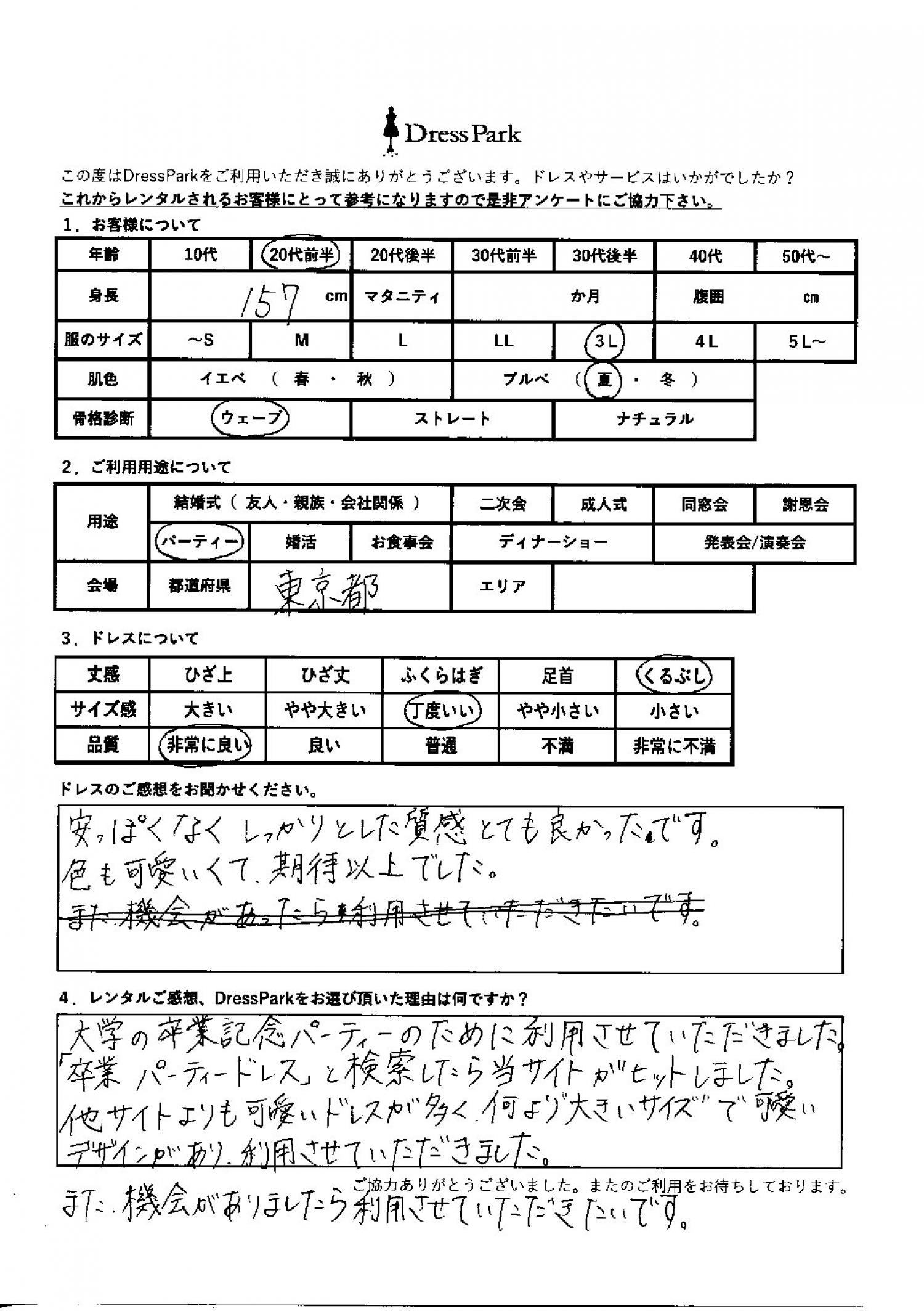 大学の卒業記念パーティーのために利用させていただきました。「卒業 パーティードレス」と検索したら、当サイトがヒットしました。他サイトよりもかわいいドレスが多く、何より大きいサイズで可愛いデザインがあり利用させていただきました。また機会がありましたら利用させていただきたいです。