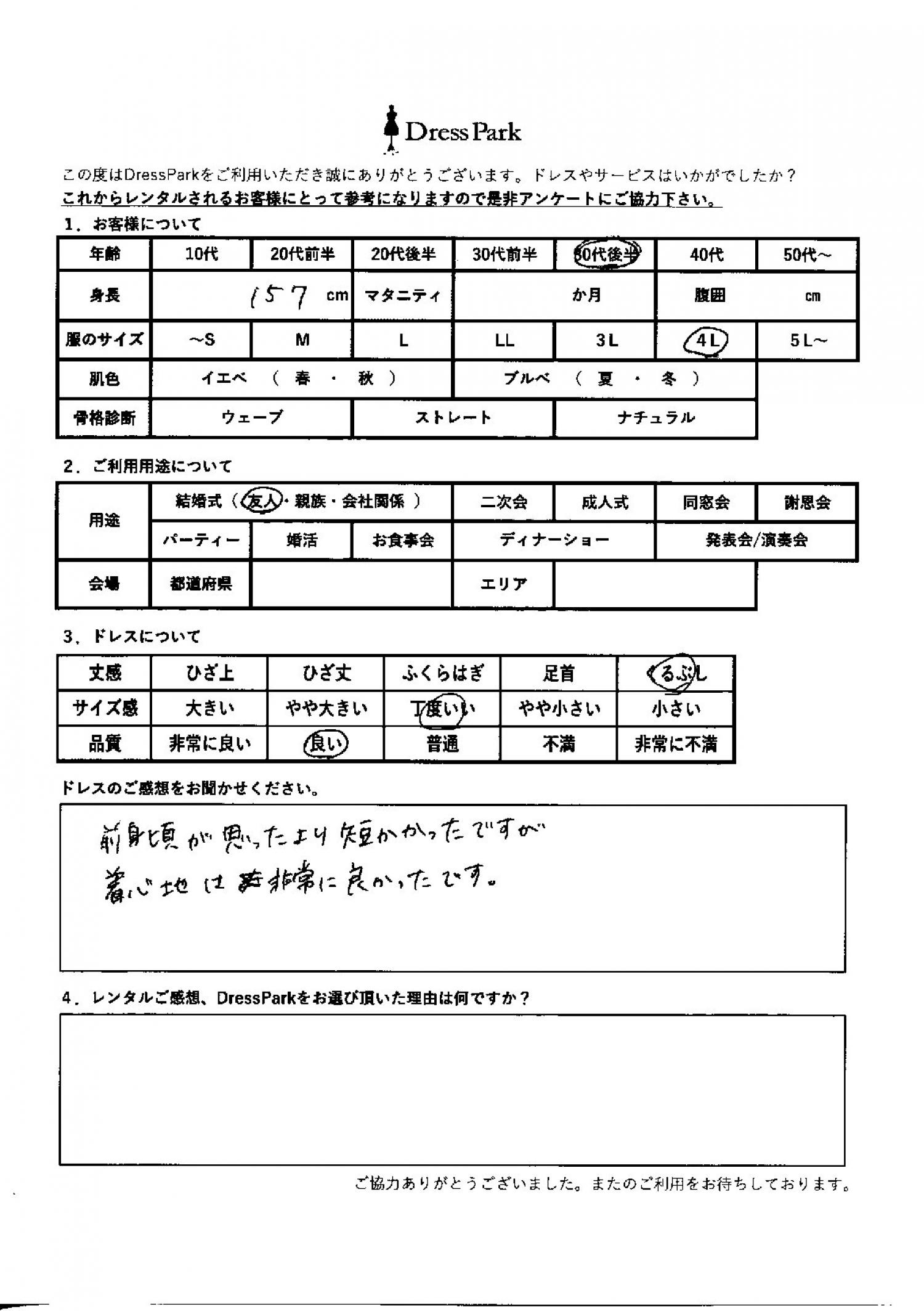 奈良県 Y.K様157㎝ 4Lサイズ #30代#大きいサイズLL~#155~159㎝#結婚式(友人)#奈良県 ◆レンタルしたドレスはこちら ◆レンタルしたサイズは:4L ◆レンタルした日付:2026/03/15 ドレスの着用感 ◆点数: (4点) ◆丈感:くるぶし ◆サイズ感:丁度いい ◆品質:良い ドレスの感想 前身頃が思ったより短かったですが、着心地は非常に良かったです。 CUSTOMER REVIEWS お客様の声 気になるカテゴリー別にご利用の感想をチェック! ◆AGE 年代で見る 10代 20代 30代 40代 50代~ ◆SIZE サイズで見る SS/S M/L 大きいサイズLL~ ◆HIGHT 身長で見る 140~149㎝ 150~154㎝ 155~159㎝ 160~164㎝ 165~169㎝ 170㎝以上 ◆マタニティ ~3か月 4~6か月 7~8か月 9~10か月 ◆肌色 イエベ ブルべ ◆骨格診断 ウェーブ ストレート ナチュラル ◆利用シーン 結婚式(友人) 結婚式(親族) 結婚式(会社関係) 二次会 成人式/同窓会 謝恩会 パーティー その他 CUSTOMER REVIEWS都道府県別お客様の声 都道府県別にのお客様の声をチェック! 北海道 青森県 岩手県 宮城県 秋田県 山形県 福島県 茨城県 栃木県 群馬県 埼玉県 千葉県 東京都 神奈川県 新潟県 富山県 石川県 福井県 山梨県 長野県 岐阜県 静岡県 愛知県 三重県 滋賀県 京都府 大阪府 兵庫県 奈良県 和歌山県 鳥取県 島根県 岡山県 広島県 山口県 徳島県 香川県 愛媛県 高知県 福岡県 佐賀県 長崎県 熊本県 大分県 宮崎県 鹿児島県 沖縄県 CUSTOMER REVIEWSエリア別お客様の声 都道府県別にのお客様の声をチェック! 札幌 仙台 名古屋 軽井沢 金沢 神戸・芦屋 博多 那覇 梅田・新大阪 難波・心斎橋 鎌倉・湘南 横浜・みなとみらい 舞浜・浦安・幕張 大宮・浦和 青山・表参道 六本木・麻布 渋谷・恵比寿 新宿 池袋 銀座・丸の内 お台場・汐留 鹿児島市 郡山市 福島市 東予 甲府・石和 LINEでお問い合わせ このサイトではJavaScriptを使用しています