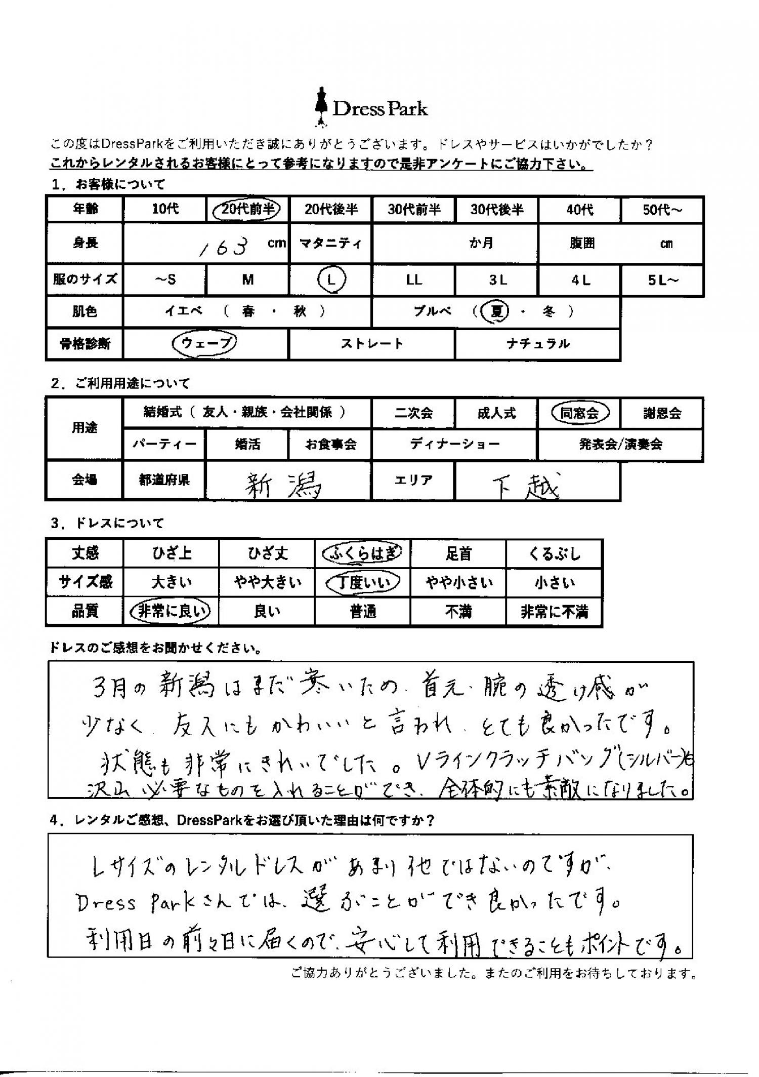 3月の新潟はまだ寒いため、首元、腕の透け感が少なく、友人にもかわいいと言われとても良かったです。状態も非常にきれいでした。Vラインクラッチバック(シルバー)もたくさん必要なものを入れることができ、全体的にも素敵になりました。レンタルのご感想、