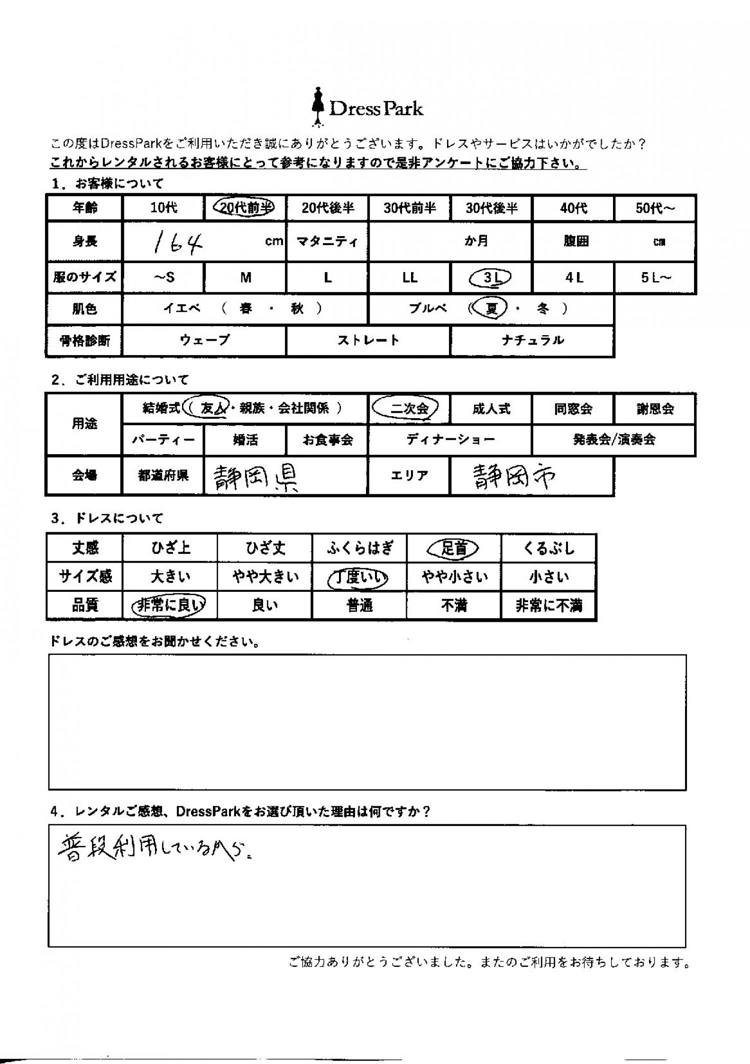 静岡県 M.M様164㎝ 3Lサイズ #20代#大きいサイズLL~#160~164㎝#結婚式(友人)#静岡県 ◆レンタルしたドレスはこちら ◆レンタルしたサイズは:5L ◆レンタルした日付:2026/03/15 ドレスの着用感 ◆点数: (5点) ◆丈感:足首 ◆サイズ感:丁度いい ◆品質:非常に良い ◆肌色:ブルべ レンタルのご感想、DressParkをお選び頂いた理由 普段利用しているから。 CUSTOMER REVIEWS お客様の声 気になるカテゴリー別にご利用の感想をチェック! ◆AGE 年代で見る 10代 20代 30代 40代 50代~ ◆SIZE サイズで見る SS/S M/L 大きいサイズLL~ ◆HIGHT 身長で見る 140~149㎝ 150~154㎝ 155~159㎝ 160~164㎝ 165~169㎝ 170㎝以上 ◆マタニティ ~3か月 4~6か月 7~8か月 9~10か月 ◆肌色 イエベ ブルべ ◆骨格診断 ウェーブ ストレート ナチュラル ◆利用シーン 結婚式(友人) 結婚式(親族) 結婚式(会社関係) 二次会 成人式/同窓会 謝恩会 パーティー その他 CUSTOMER REVIEWS都道府県別お客様の声 都道府県別にのお客様の声をチェック! 北海道 青森県 岩手県 宮城県 秋田県 山形県 福島県 茨城県 栃木県 群馬県 埼玉県 千葉県 東京都 神奈川県 新潟県 富山県 石川県 福井県 山梨県 長野県 岐阜県 静岡県 愛知県 三重県 滋賀県 京都府 大阪府 兵庫県 奈良県 和歌山県 鳥取県 島根県 岡山県 広島県 山口県 徳島県 香川県 愛媛県 高知県 福岡県 佐賀県 長崎県 熊本県 大分県 宮崎県 鹿児島県 沖縄県 CUSTOMER REVIEWSエリア別お客様の声 都道府県別にのお客様の声をチェック! 札幌 仙台 名古屋 軽井沢 金沢 神戸・芦屋 博多 那覇 梅田・新大阪 難波・心斎橋 鎌倉・湘南 横浜・みなとみらい 舞浜・浦安・幕張 大宮・浦和 青山・表参道 六本木・麻布 渋谷・恵比寿 新宿 池袋 銀座・丸の内 お台場・汐留 鹿児島市 郡山市 福島市 東予 甲府・石和 LINEでお問い合わせ このサイトではJavaScriptを使用しています