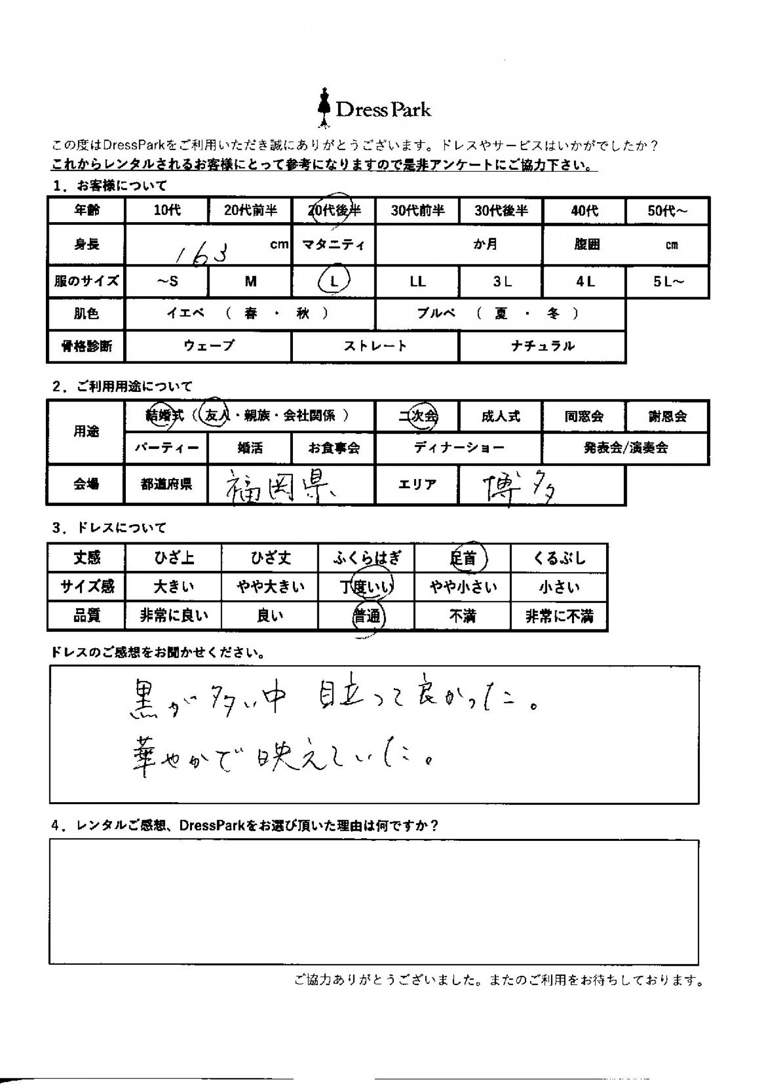 福岡県 Y.U様163㎝ Lサイズ博多 #20代#M/L#160~164㎝#結婚式(友人)#福岡県#博多 ◆レンタルしたドレスはこちら ◆レンタルしたサイズは:M ◆レンタルした日付:2026/03/14 ドレスの着用感 ◆点数: (5点) ◆丈感:足首 ◆サイズ感:丁度いい ◆品質:普通 ドレスの感想 黒が多い中目立ってよかった。華やかで映えていた。 CUSTOMER REVIEWS お客様の声 気になるカテゴリー別にご利用の感想をチェック! ◆AGE 年代で見る 10代 20代 30代 40代 50代~ ◆SIZE サイズで見る SS/S M/L 大きいサイズLL~ ◆HIGHT 身長で見る 140~149㎝ 150~154㎝ 155~159㎝ 160~164㎝ 165~169㎝ 170㎝以上 ◆マタニティ ~3か月 4~6か月 7~8か月 9~10か月 ◆肌色 イエベ ブルべ ◆骨格診断 ウェーブ ストレート ナチュラル ◆利用シーン 結婚式(友人) 結婚式(親族) 結婚式(会社関係) 二次会 成人式/同窓会 謝恩会 パーティー その他 CUSTOMER REVIEWS都道府県別お客様の声 都道府県別にのお客様の声をチェック! 北海道 青森県 岩手県 宮城県 秋田県 山形県 福島県 茨城県 栃木県 群馬県 埼玉県 千葉県 東京都 神奈川県 新潟県 富山県 石川県 福井県 山梨県 長野県 岐阜県 静岡県 愛知県 三重県 滋賀県 京都府 大阪府 兵庫県 奈良県 和歌山県 鳥取県 島根県 岡山県 広島県 山口県 徳島県 香川県 愛媛県 高知県 福岡県 佐賀県 長崎県 熊本県 大分県 宮崎県 鹿児島県 沖縄県 CUSTOMER REVIEWSエリア別お客様の声 都道府県別にのお客様の声をチェック! 札幌 仙台 名古屋 軽井沢 金沢 神戸・芦屋 博多 那覇 梅田・新大阪 難波・心斎橋 鎌倉・湘南 横浜・みなとみらい 舞浜・浦安・幕張 大宮・浦和 青山・表参道 六本木・麻布 渋谷・恵比寿 新宿 池袋 銀座・丸の内 お台場・汐留 鹿児島市 郡山市 福島市 東予 甲府・石和 LINEでお問い合わせ このサイトではJavaScriptを使用しています