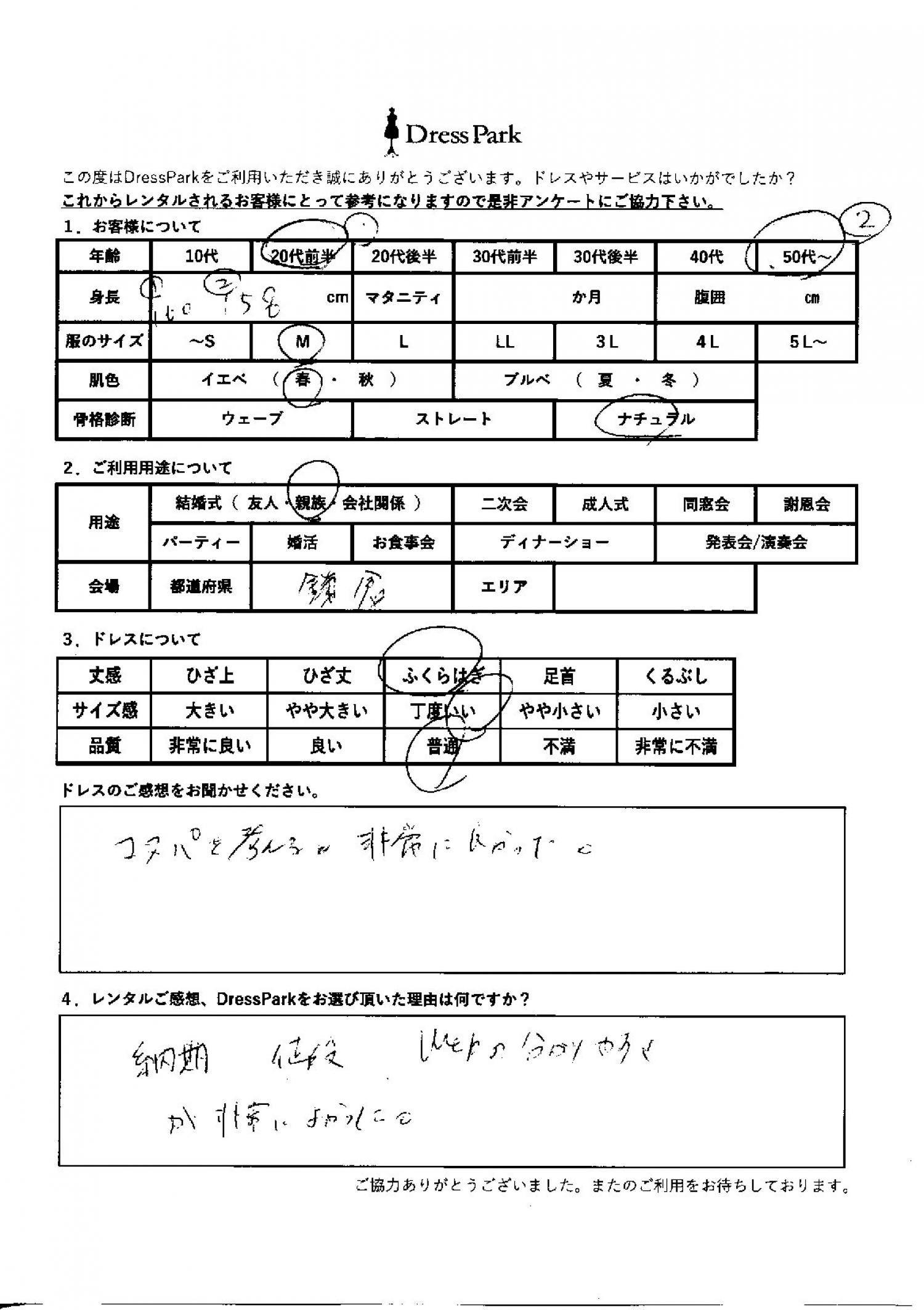 神奈川県 M.K様160㎝ Mサイズ鎌倉・湘南 #20代#M/L#160~164㎝#結婚式(親族)#神奈川県#鎌倉・湘南 ◆レンタルしたドレスはこちら ◆レンタルしたサイズは:M ◆レンタルした日付:2026/03/16 ドレスの着用感 ◆点数: (5点) ◆丈感:ふくらはぎ ◆サイズ感:丁度いい ◆品質:普通 ◆肌色:イエベ ◆骨格診断:ナチュラル ドレスの感想 コスパを考えると非常に良かった。 レンタルのご感想、DressParkをお選び頂いた理由 納期、値段、ウェブのわかりやすさが非常に良かった。 CUSTOMER REVIEWS お客様の声 気になるカテゴリー別にご利用の感想をチェック! ◆AGE 年代で見る 10代 20代 30代 40代 50代~ ◆SIZE サイズで見る SS/S M/L 大きいサイズLL~ ◆HIGHT 身長で見る 140~149㎝ 150~154㎝ 155~159㎝ 160~164㎝ 165~169㎝ 170㎝以上 ◆マタニティ ~3か月 4~6か月 7~8か月 9~10か月 ◆肌色 イエベ ブルべ ◆骨格診断 ウェーブ ストレート ナチュラル ◆利用シーン 結婚式(友人) 結婚式(親族) 結婚式(会社関係) 二次会 成人式/同窓会 謝恩会 パーティー その他 CUSTOMER REVIEWS都道府県別お客様の声 都道府県別にのお客様の声をチェック! 北海道 青森県 岩手県 宮城県 秋田県 山形県 福島県 茨城県 栃木県 群馬県 埼玉県 千葉県 東京都 神奈川県 新潟県 富山県 石川県 福井県 山梨県 長野県 岐阜県 静岡県 愛知県 三重県 滋賀県 京都府 大阪府 兵庫県 奈良県 和歌山県 鳥取県 島根県 岡山県 広島県 山口県 徳島県 香川県 愛媛県 高知県 福岡県 佐賀県 長崎県 熊本県 大分県 宮崎県 鹿児島県 沖縄県 CUSTOMER REVIEWSエリア別お客様の声 都道府県別にのお客様の声をチェック! 札幌 仙台 名古屋 軽井沢 金沢 神戸・芦屋 博多 那覇 梅田・新大阪 難波・心斎橋 鎌倉・湘南 横浜・みなとみらい 舞浜・浦安・幕張 大宮・浦和 青山・表参道 六本木・麻布 渋谷・恵比寿 新宿 池袋 銀座・丸の内 お台場・汐留 鹿児島市 郡山市 福島市 東予 甲府・石和 LINEでお問い合わせ このサイトではJavaScriptを使用しています