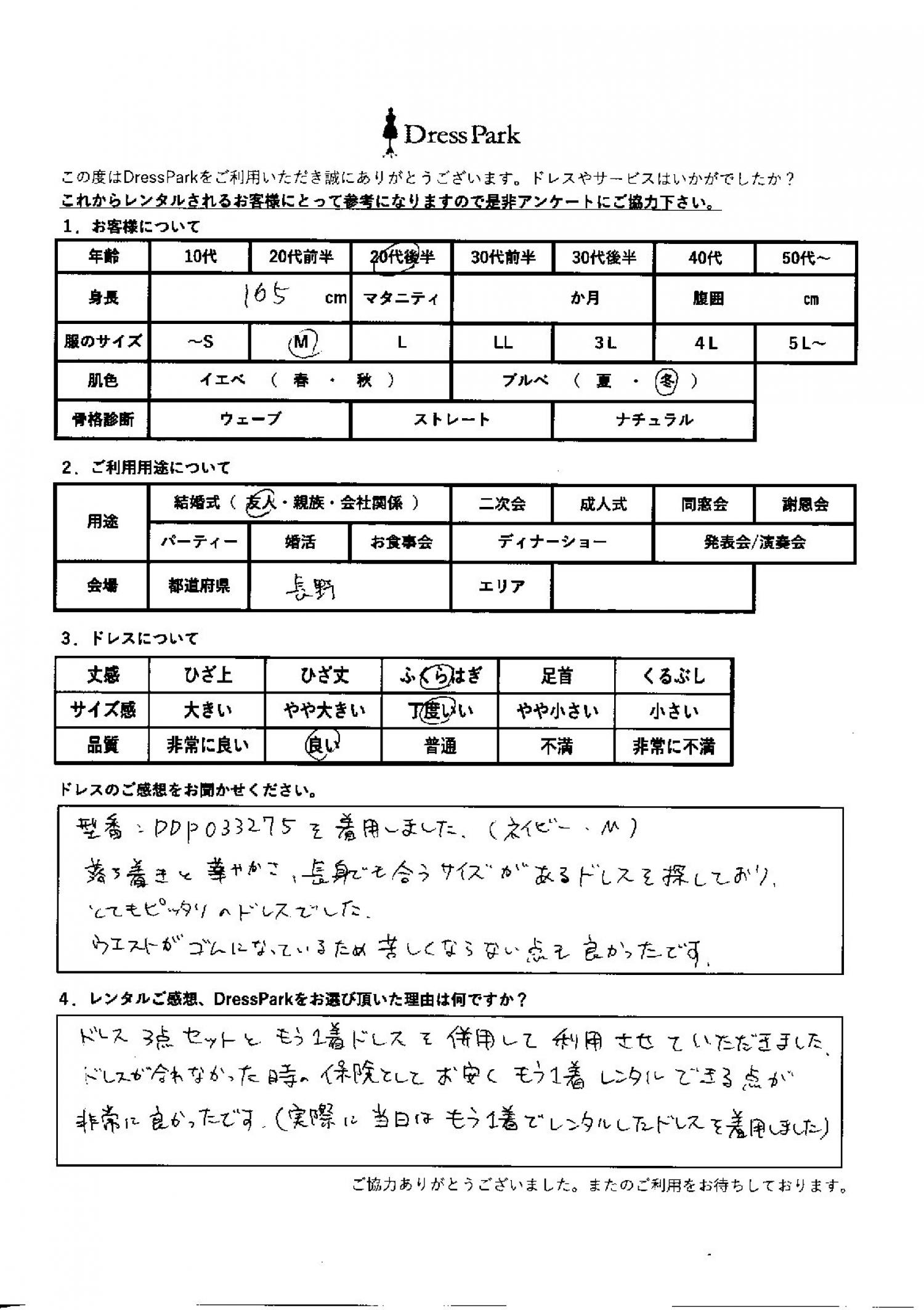 落ち着きと華やかさ、長身でも合うサイズがあるドレスを探しており、とてもぴったりのドレスでした。ウェストがゴムになっているため苦しくならない点も良かったです。レンタルのご感想、