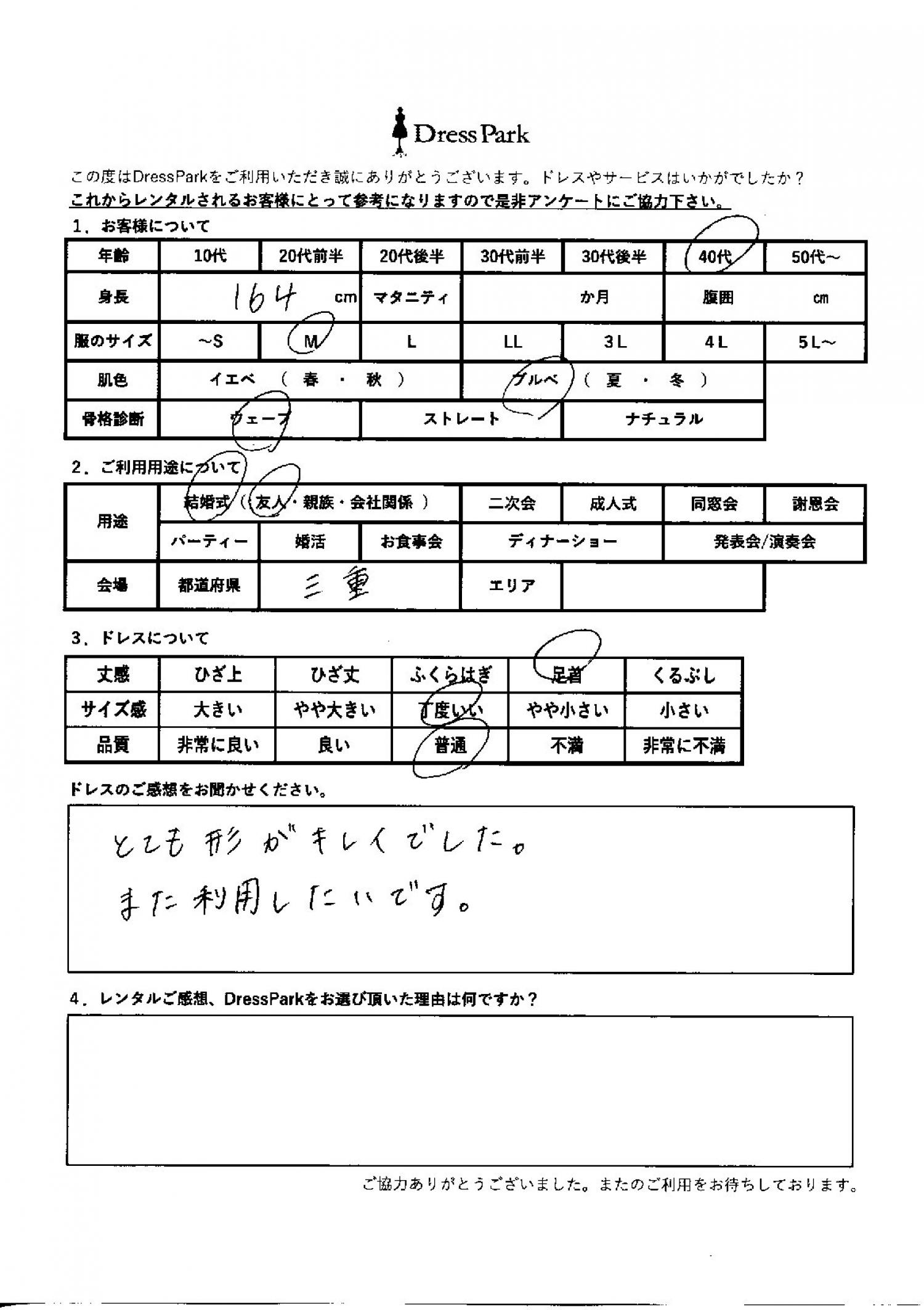 三重県 C.S様164㎝ Mサイズ #40代#M/L#160~164㎝#結婚式(友人)#三重県 ◆レンタルしたドレスはこちら ◆レンタルしたサイズは:M ◆レンタルした日付:2026/03/20 ドレスの着用感 ◆点数: (4点) ◆丈感:足首 ◆サイズ感:丁度いい ◆品質:普通 ◆肌色:ブルべ ◆骨格診断:ウェーブ ドレスの感想 とても形が綺麗でした。また利用したいです。 CUSTOMER REVIEWS お客様の声 気になるカテゴリー別にご利用の感想をチェック! ◆AGE 年代で見る 10代 20代 30代 40代 50代~ ◆SIZE サイズで見る SS/S M/L 大きいサイズLL~ ◆HIGHT 身長で見る 140~149㎝ 150~154㎝ 155~159㎝ 160~164㎝ 165~169㎝ 170㎝以上 ◆マタニティ ~3か月 4~6か月 7~8か月 9~10か月 ◆肌色 イエベ ブルべ ◆骨格診断 ウェーブ ストレート ナチュラル ◆利用シーン 結婚式(友人) 結婚式(親族) 結婚式(会社関係) 二次会 成人式/同窓会 謝恩会 パーティー その他 CUSTOMER REVIEWS都道府県別お客様の声 都道府県別にのお客様の声をチェック! 北海道 青森県 岩手県 宮城県 秋田県 山形県 福島県 茨城県 栃木県 群馬県 埼玉県 千葉県 東京都 神奈川県 新潟県 富山県 石川県 福井県 山梨県 長野県 岐阜県 静岡県 愛知県 三重県 滋賀県 京都府 大阪府 兵庫県 奈良県 和歌山県 鳥取県 島根県 岡山県 広島県 山口県 徳島県 香川県 愛媛県 高知県 福岡県 佐賀県 長崎県 熊本県 大分県 宮崎県 鹿児島県 沖縄県 CUSTOMER REVIEWSエリア別お客様の声 都道府県別にのお客様の声をチェック! 札幌 仙台 名古屋 軽井沢 金沢 神戸・芦屋 博多 那覇 梅田・新大阪 難波・心斎橋 鎌倉・湘南 横浜・みなとみらい 舞浜・浦安・幕張 大宮・浦和 青山・表参道 六本木・麻布 渋谷・恵比寿 新宿 池袋 銀座・丸の内 お台場・汐留 鹿児島市 郡山市 福島市 東予 甲府・石和 LINEでお問い合わせ このサイトではJavaScriptを使用しています