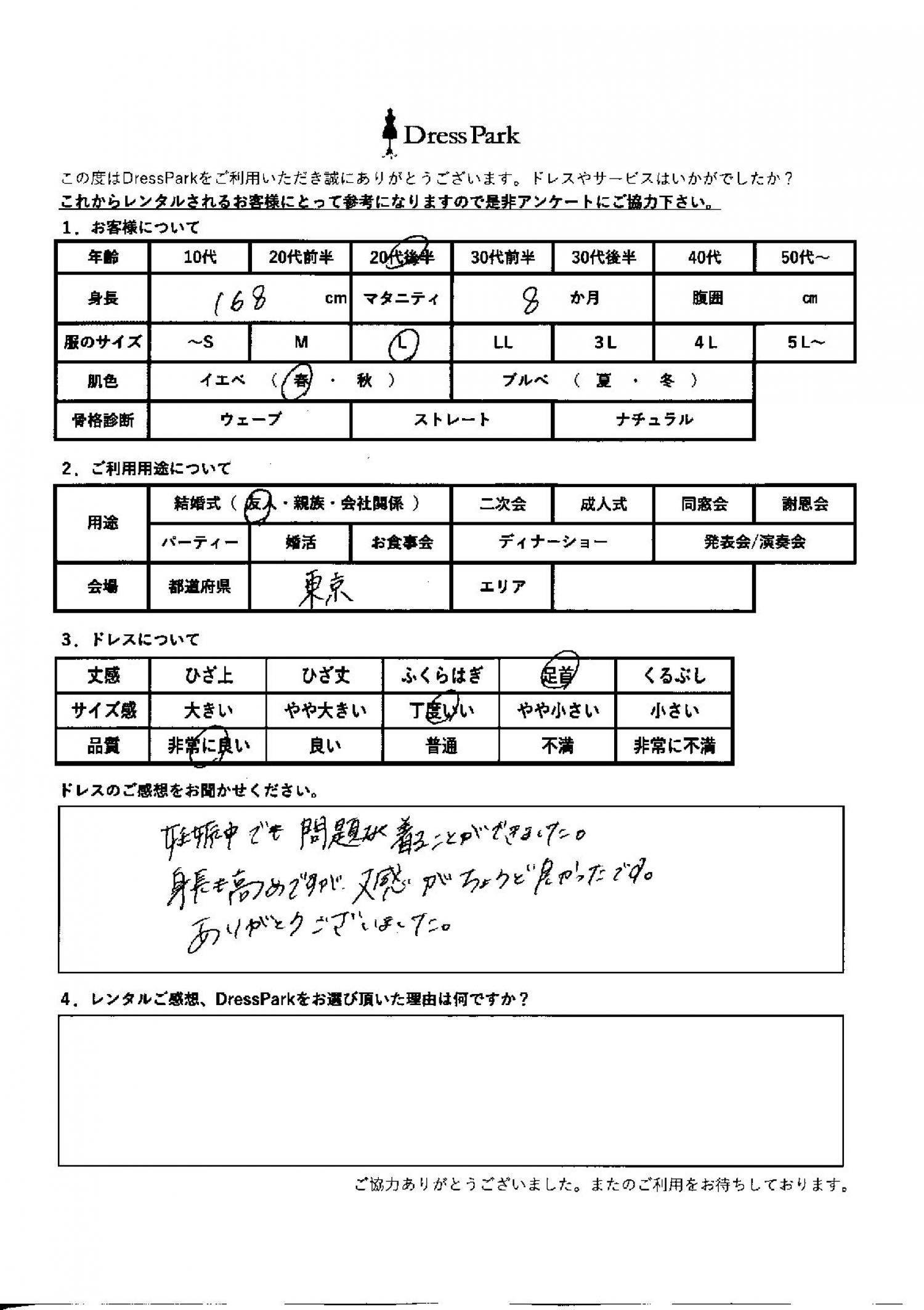 東京都 S.N様168㎝ Lサイズ マタニティ #20代#M/L#165~169㎝#結婚式(友人)#東京都 ◆レンタルしたドレスはこちら ◆レンタルしたサイズは:L ◆レンタルした日付:2026/03/20 ドレスの着用感 ◆点数: (5点) ◆丈感:足首 ◆サイズ感:丁度いい ◆品質:非常に良い ◆マタニティ:8ヶ月 ◆肌色:イエベ ドレスの感想 妊娠中でも問題なく着ることができました。身長も高めですが、丈感がちょうど良かったです。ありがとうございました。 CUSTOMER REVIEWS お客様の声 気になるカテゴリー別にご利用の感想をチェック! ◆AGE 年代で見る 10代 20代 30代 40代 50代~ ◆SIZE サイズで見る SS/S M/L 大きいサイズLL~ ◆HIGHT 身長で見る 140~149㎝ 150~154㎝ 155~159㎝ 160~164㎝ 165~169㎝ 170㎝以上 ◆マタニティ ~3か月 4~6か月 7~8か月 9~10か月 ◆肌色 イエベ ブルべ ◆骨格診断 ウェーブ ストレート ナチュラル ◆利用シーン 結婚式(友人) 結婚式(親族) 結婚式(会社関係) 二次会 成人式/同窓会 謝恩会 パーティー その他 CUSTOMER REVIEWS都道府県別お客様の声 都道府県別にのお客様の声をチェック! 北海道 青森県 岩手県 宮城県 秋田県 山形県 福島県 茨城県 栃木県 群馬県 埼玉県 千葉県 東京都 神奈川県 新潟県 富山県 石川県 福井県 山梨県 長野県 岐阜県 静岡県 愛知県 三重県 滋賀県 京都府 大阪府 兵庫県 奈良県 和歌山県 鳥取県 島根県 岡山県 広島県 山口県 徳島県 香川県 愛媛県 高知県 福岡県 佐賀県 長崎県 熊本県 大分県 宮崎県 鹿児島県 沖縄県 CUSTOMER REVIEWSエリア別お客様の声 都道府県別にのお客様の声をチェック! 札幌 仙台 名古屋 軽井沢 金沢 神戸・芦屋 博多 那覇 梅田・新大阪 難波・心斎橋 鎌倉・湘南 横浜・みなとみらい 舞浜・浦安・幕張 大宮・浦和 青山・表参道 六本木・麻布 渋谷・恵比寿 新宿 池袋 銀座・丸の内 お台場・汐留 鹿児島市 郡山市 福島市 東予 甲府・石和 LINEでお問い合わせ このサイトではJavaScriptを使用しています
