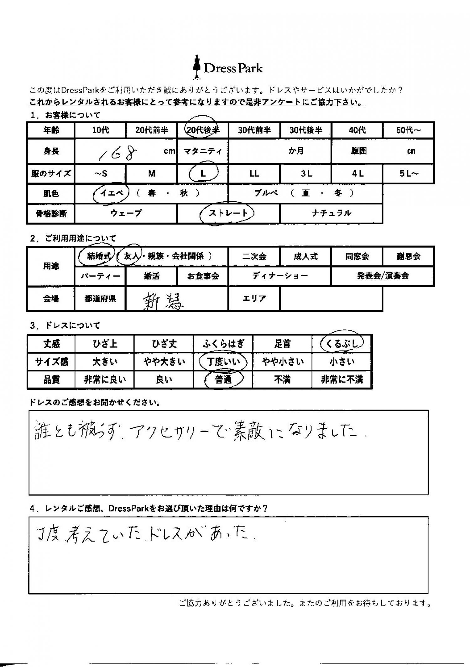 新潟県 M.N様168㎝ Lサイズ #20代#M/L#165~169㎝#結婚式(友人)#新潟県 ◆レンタルしたドレスはこちら ◆レンタルしたサイズは:L ◆レンタルした日付:2026/03/20 ドレスの着用感 ◆点数: (4点) ◆丈感:くるぶし ◆サイズ感:丁度いい ◆品質:普通 ◆肌色:イエベ ◆骨格診断:ストレート ドレスの感想 誰ともかぶらずアクセサリーで素敵になりました。 レンタルのご感想、DressParkをお選び頂いた理由 ちょうど考えていたドレスがあった。 CUSTOMER REVIEWS お客様の声 気になるカテゴリー別にご利用の感想をチェック! ◆AGE 年代で見る 10代 20代 30代 40代 50代~ ◆SIZE サイズで見る SS/S M/L 大きいサイズLL~ ◆HIGHT 身長で見る 140~149㎝ 150~154㎝ 155~159㎝ 160~164㎝ 165~169㎝ 170㎝以上 ◆マタニティ ~3か月 4~6か月 7~8か月 9~10か月 ◆肌色 イエベ ブルべ ◆骨格診断 ウェーブ ストレート ナチュラル ◆利用シーン 結婚式(友人) 結婚式(親族) 結婚式(会社関係) 二次会 成人式/同窓会 謝恩会 パーティー その他 CUSTOMER REVIEWS都道府県別お客様の声 都道府県別にのお客様の声をチェック! 北海道 青森県 岩手県 宮城県 秋田県 山形県 福島県 茨城県 栃木県 群馬県 埼玉県 千葉県 東京都 神奈川県 新潟県 富山県 石川県 福井県 山梨県 長野県 岐阜県 静岡県 愛知県 三重県 滋賀県 京都府 大阪府 兵庫県 奈良県 和歌山県 鳥取県 島根県 岡山県 広島県 山口県 徳島県 香川県 愛媛県 高知県 福岡県 佐賀県 長崎県 熊本県 大分県 宮崎県 鹿児島県 沖縄県 CUSTOMER REVIEWSエリア別お客様の声 都道府県別にのお客様の声をチェック! 札幌 仙台 名古屋 軽井沢 金沢 神戸・芦屋 博多 那覇 梅田・新大阪 難波・心斎橋 鎌倉・湘南 横浜・みなとみらい 舞浜・浦安・幕張 大宮・浦和 青山・表参道 六本木・麻布 渋谷・恵比寿 新宿 池袋 銀座・丸の内 お台場・汐留 鹿児島市 郡山市 福島市 東予 甲府・石和 LINEでお問い合わせ このサイトではJavaScriptを使用しています