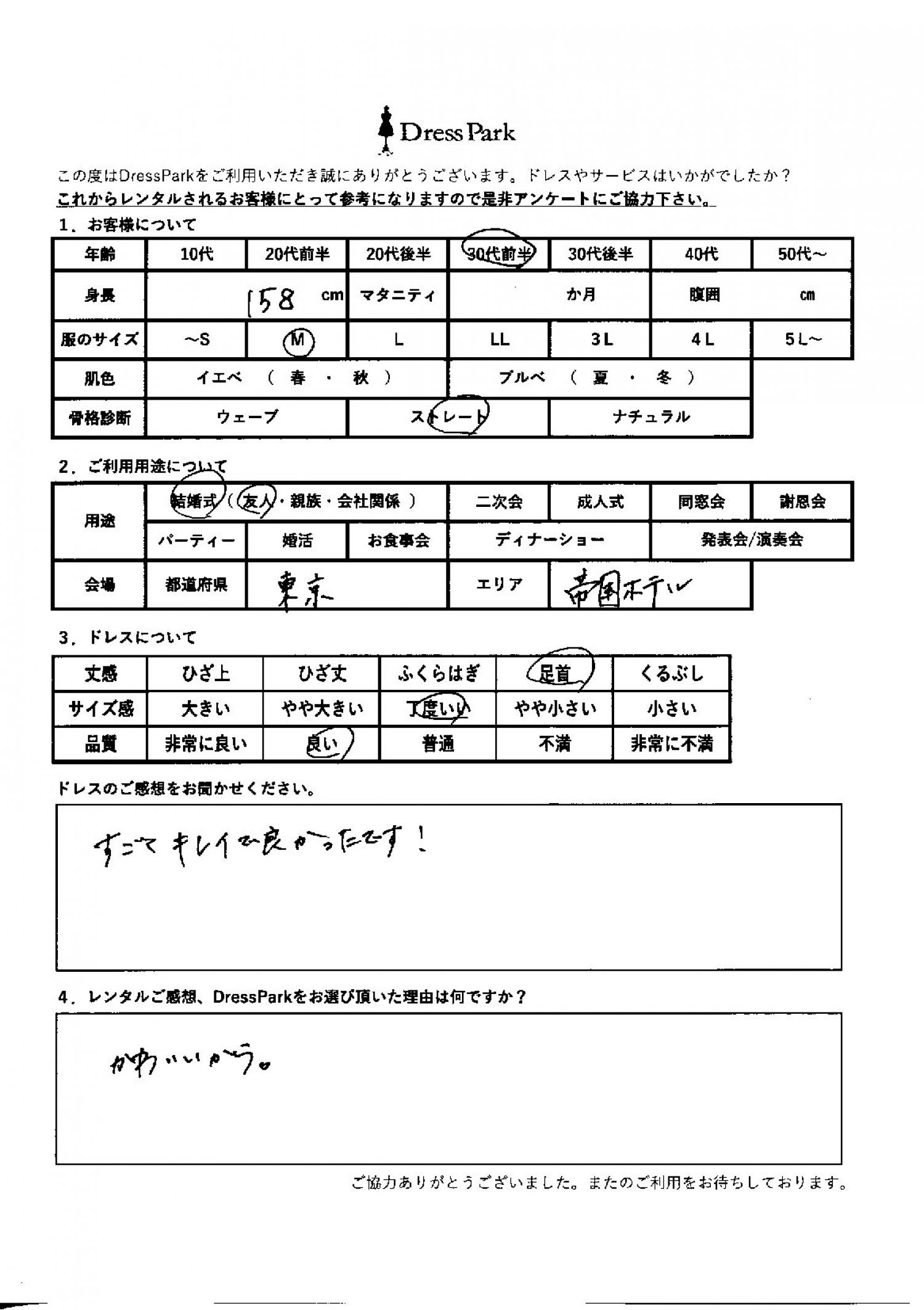 東京都 R.O様158㎝ Mサイズ銀座・丸の内 #30代#M/L#155~159㎝#結婚式(友人)#東京都#銀座・丸の内 ◆レンタルしたドレスはこちら ◆レンタルしたサイズは:M ◆レンタルした日付:2026/03/20 ドレスの着用感 ◆点数: (4点) ◆丈感:足首 ◆サイズ感:丁度いい ◆品質:良い ◆骨格診断:ストレート ドレスの感想 すごく綺麗でよかったです! レンタルのご感想、DressParkをお選び頂いた理由 かわいいから CUSTOMER REVIEWS お客様の声 気になるカテゴリー別にご利用の感想をチェック! ◆AGE 年代で見る 10代 20代 30代 40代 50代~ ◆SIZE サイズで見る SS/S M/L 大きいサイズLL~ ◆HIGHT 身長で見る 140~149㎝ 150~154㎝ 155~159㎝ 160~164㎝ 165~169㎝ 170㎝以上 ◆マタニティ ~3か月 4~6か月 7~8か月 9~10か月 ◆肌色 イエベ ブルべ ◆骨格診断 ウェーブ ストレート ナチュラル ◆利用シーン 結婚式(友人) 結婚式(親族) 結婚式(会社関係) 二次会 成人式/同窓会 謝恩会 パーティー その他 CUSTOMER REVIEWS都道府県別お客様の声 都道府県別にのお客様の声をチェック! 北海道 青森県 岩手県 宮城県 秋田県 山形県 福島県 茨城県 栃木県 群馬県 埼玉県 千葉県 東京都 神奈川県 新潟県 富山県 石川県 福井県 山梨県 長野県 岐阜県 静岡県 愛知県 三重県 滋賀県 京都府 大阪府 兵庫県 奈良県 和歌山県 鳥取県 島根県 岡山県 広島県 山口県 徳島県 香川県 愛媛県 高知県 福岡県 佐賀県 長崎県 熊本県 大分県 宮崎県 鹿児島県 沖縄県 CUSTOMER REVIEWSエリア別お客様の声 都道府県別にのお客様の声をチェック! 札幌 仙台 名古屋 軽井沢 金沢 神戸・芦屋 博多 那覇 梅田・新大阪 難波・心斎橋 鎌倉・湘南 横浜・みなとみらい 舞浜・浦安・幕張 大宮・浦和 青山・表参道 六本木・麻布 渋谷・恵比寿 新宿 池袋 銀座・丸の内 お台場・汐留 鹿児島市 郡山市 福島市 東予 甲府・石和 LINEでお問い合わせ このサイトではJavaScriptを使用しています