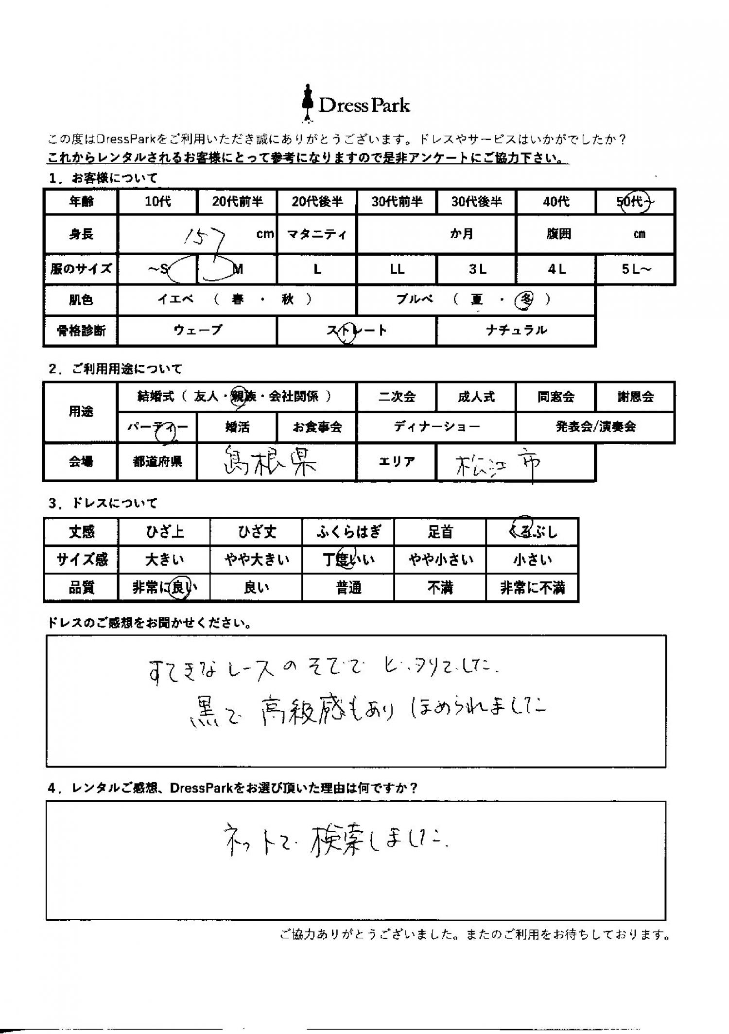 島根県 J.M様157㎝ Mサイズ #50代~#M/L#155~159㎝#結婚式(親族)#島根県 ◆レンタルしたドレスはこちら ◆レンタルしたサイズは:M ◆レンタルした日付:2026/03/20 ドレスの着用感 ◆点数: (5点) ◆丈感:くるぶし ◆サイズ感:丁度いい ◆品質:非常に良い ◆肌色:ブルべ ◆骨格診断:ストレート ドレスの感想 素敵なレースの袖でぴったりでした。黒で高級感もあり褒められました。 レンタルのご感想、DressParkをお選び頂いた理由 ネットで検索しました。 CUSTOMER REVIEWS お客様の声 気になるカテゴリー別にご利用の感想をチェック! ◆AGE 年代で見る 10代 20代 30代 40代 50代~ ◆SIZE サイズで見る SS/S M/L 大きいサイズLL~ ◆HIGHT 身長で見る 140~149㎝ 150~154㎝ 155~159㎝ 160~164㎝ 165~169㎝ 170㎝以上 ◆マタニティ ~3か月 4~6か月 7~8か月 9~10か月 ◆肌色 イエベ ブルべ ◆骨格診断 ウェーブ ストレート ナチュラル ◆利用シーン 結婚式(友人) 結婚式(親族) 結婚式(会社関係) 二次会 成人式/同窓会 謝恩会 パーティー その他 CUSTOMER REVIEWS都道府県別お客様の声 都道府県別にのお客様の声をチェック! 北海道 青森県 岩手県 宮城県 秋田県 山形県 福島県 茨城県 栃木県 群馬県 埼玉県 千葉県 東京都 神奈川県 新潟県 富山県 石川県 福井県 山梨県 長野県 岐阜県 静岡県 愛知県 三重県 滋賀県 京都府 大阪府 兵庫県 奈良県 和歌山県 鳥取県 島根県 岡山県 広島県 山口県 徳島県 香川県 愛媛県 高知県 福岡県 佐賀県 長崎県 熊本県 大分県 宮崎県 鹿児島県 沖縄県 CUSTOMER REVIEWSエリア別お客様の声 都道府県別にのお客様の声をチェック! 札幌 仙台 名古屋 軽井沢 金沢 神戸・芦屋 博多 那覇 梅田・新大阪 難波・心斎橋 鎌倉・湘南 横浜・みなとみらい 舞浜・浦安・幕張 大宮・浦和 青山・表参道 六本木・麻布 渋谷・恵比寿 新宿 池袋 銀座・丸の内 お台場・汐留 鹿児島市 郡山市 福島市 東予 甲府・石和 LINEでお問い合わせ このサイトではJavaScriptを使用しています