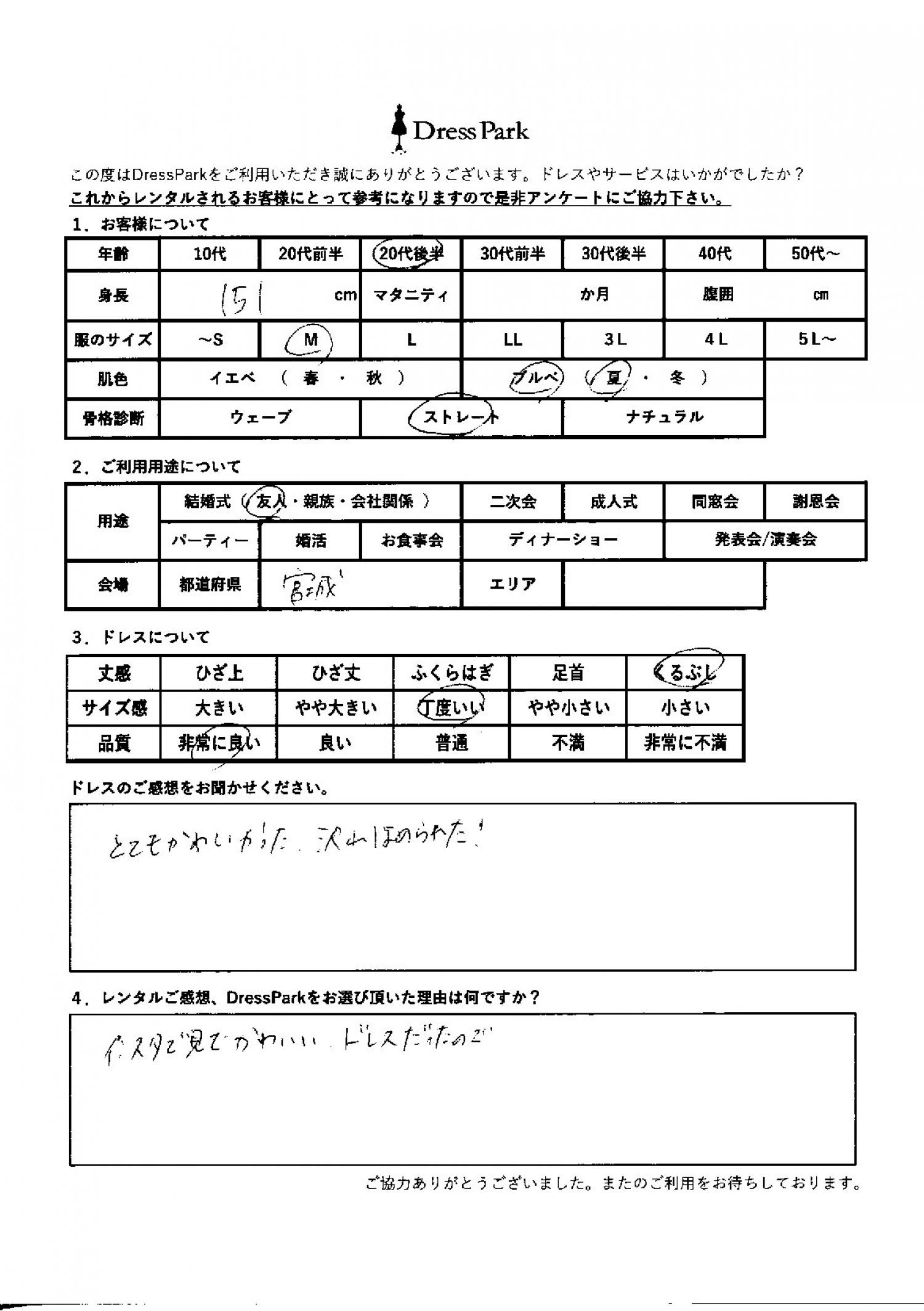 宮城県 I.Y様151㎝ Mサイズ #20代#M/L#150~154㎝#結婚式(友人)#宮城県 ◆レンタルしたドレスはこちら ◆レンタルしたサイズは:M ◆レンタルした日付:2026/03/20 ドレスの着用感 ◆点数: (5点) ◆丈感:くるぶし ◆サイズ感:丁度いい ◆品質:非常に良い ◆肌色:ブルべ ◆骨格診断:ストレート ドレスの感想 とても可愛かった。たくさん褒められた! レンタルのご感想、DressParkをお選び頂いた理由 インスタで見て可愛いドレスだったので。 CUSTOMER REVIEWS お客様の声 気になるカテゴリー別にご利用の感想をチェック! ◆AGE 年代で見る 10代 20代 30代 40代 50代~ ◆SIZE サイズで見る SS/S M/L 大きいサイズLL~ ◆HIGHT 身長で見る 140~149㎝ 150~154㎝ 155~159㎝ 160~164㎝ 165~169㎝ 170㎝以上 ◆マタニティ ~3か月 4~6か月 7~8か月 9~10か月 ◆肌色 イエベ ブルべ ◆骨格診断 ウェーブ ストレート ナチュラル ◆利用シーン 結婚式(友人) 結婚式(親族) 結婚式(会社関係) 二次会 成人式/同窓会 謝恩会 パーティー その他 CUSTOMER REVIEWS都道府県別お客様の声 都道府県別にのお客様の声をチェック! 北海道 青森県 岩手県 宮城県 秋田県 山形県 福島県 茨城県 栃木県 群馬県 埼玉県 千葉県 東京都 神奈川県 新潟県 富山県 石川県 福井県 山梨県 長野県 岐阜県 静岡県 愛知県 三重県 滋賀県 京都府 大阪府 兵庫県 奈良県 和歌山県 鳥取県 島根県 岡山県 広島県 山口県 徳島県 香川県 愛媛県 高知県 福岡県 佐賀県 長崎県 熊本県 大分県 宮崎県 鹿児島県 沖縄県 CUSTOMER REVIEWSエリア別お客様の声 都道府県別にのお客様の声をチェック! 札幌 仙台 名古屋 軽井沢 金沢 神戸・芦屋 博多 那覇 梅田・新大阪 難波・心斎橋 鎌倉・湘南 横浜・みなとみらい 舞浜・浦安・幕張 大宮・浦和 青山・表参道 六本木・麻布 渋谷・恵比寿 新宿 池袋 銀座・丸の内 お台場・汐留 鹿児島市 郡山市 福島市 東予 甲府・石和 LINEでお問い合わせ このサイトではJavaScriptを使用しています