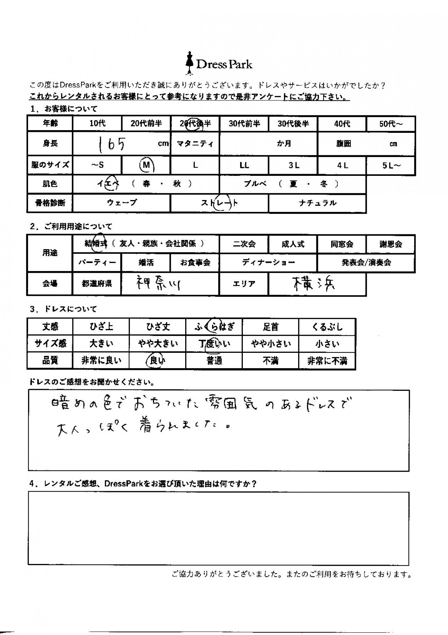 神奈川県 S.K様165㎝ Mサイズ横浜・みなとみらい #20代#M/L#165~169㎝#結婚式(友人)#神奈川県#横浜・みなとみらい ◆レンタルしたドレスはこちら ◆レンタルしたサイズは:M ◆レンタルした日付:2026/03/20 ドレスの着用感 ◆点数: (4点) ◆丈感:ふくらはぎ ◆サイズ感:丁度いい ◆品質:良い ◆肌色:イエベ ◆骨格診断:ストレート ドレスの感想 暗めの色で落ち着いた雰囲気のあるドレスで大人っぽく着られました。 CUSTOMER REVIEWS お客様の声 気になるカテゴリー別にご利用の感想をチェック! ◆AGE 年代で見る 10代 20代 30代 40代 50代~ ◆SIZE サイズで見る SS/S M/L 大きいサイズLL~ ◆HIGHT 身長で見る 140~149㎝ 150~154㎝ 155~159㎝ 160~164㎝ 165~169㎝ 170㎝以上 ◆マタニティ ~3か月 4~6か月 7~8か月 9~10か月 ◆肌色 イエベ ブルべ ◆骨格診断 ウェーブ ストレート ナチュラル ◆利用シーン 結婚式(友人) 結婚式(親族) 結婚式(会社関係) 二次会 成人式/同窓会 謝恩会 パーティー その他 CUSTOMER REVIEWS都道府県別お客様の声 都道府県別にのお客様の声をチェック! 北海道 青森県 岩手県 宮城県 秋田県 山形県 福島県 茨城県 栃木県 群馬県 埼玉県 千葉県 東京都 神奈川県 新潟県 富山県 石川県 福井県 山梨県 長野県 岐阜県 静岡県 愛知県 三重県 滋賀県 京都府 大阪府 兵庫県 奈良県 和歌山県 鳥取県 島根県 岡山県 広島県 山口県 徳島県 香川県 愛媛県 高知県 福岡県 佐賀県 長崎県 熊本県 大分県 宮崎県 鹿児島県 沖縄県 CUSTOMER REVIEWSエリア別お客様の声 都道府県別にのお客様の声をチェック! 札幌 仙台 名古屋 軽井沢 金沢 神戸・芦屋 博多 那覇 梅田・新大阪 難波・心斎橋 鎌倉・湘南 横浜・みなとみらい 舞浜・浦安・幕張 大宮・浦和 青山・表参道 六本木・麻布 渋谷・恵比寿 新宿 池袋 銀座・丸の内 お台場・汐留 鹿児島市 郡山市 福島市 東予 甲府・石和 LINEでお問い合わせ このサイトではJavaScriptを使用しています