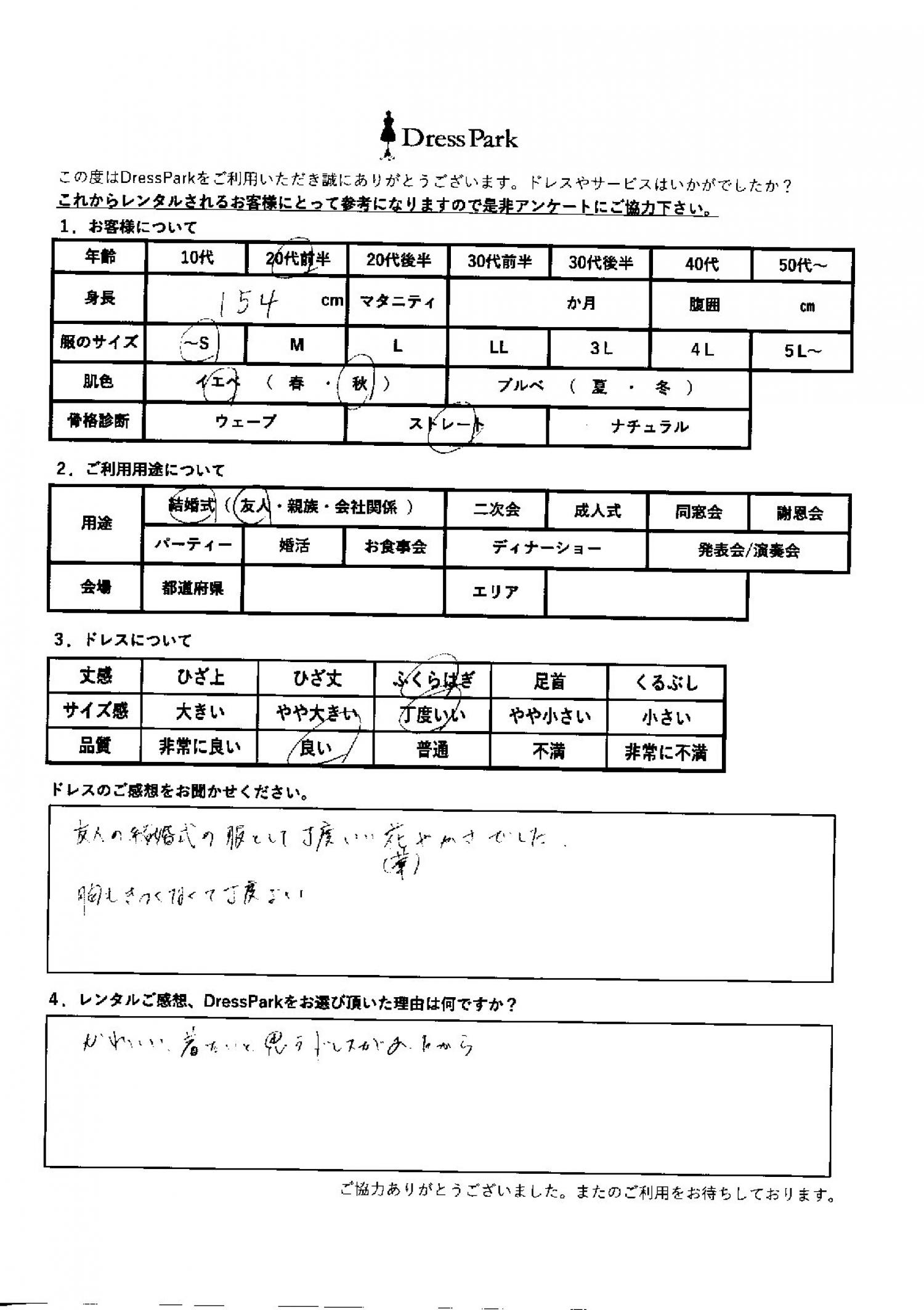 静岡県 A.K様154㎝ ~Sサイズ #20代#SS/S#150~154㎝#結婚式(友人)#静岡県 ◆レンタルしたドレスはこちら ◆レンタルしたサイズは:M ◆レンタルした日付:2026/03/21 ドレスの着用感 ◆点数: (4点) ◆丈感:ふくらはぎ ◆サイズ感:丁度いい ◆品質:良い ◆肌色:イエベ ◆骨格診断:ストレート ドレスの感想 友人の結婚式の服としてちょうど良い華やかさでした。胸もきつくなくてちょうど良い。 レンタルのご感想、DressParkをお選び頂いた理由 かわいい、着たいと思うドレスがあったから。 CUSTOMER REVIEWS お客様の声 気になるカテゴリー別にご利用の感想をチェック! ◆AGE 年代で見る 10代 20代 30代 40代 50代~ ◆SIZE サイズで見る SS/S M/L 大きいサイズLL~ ◆HIGHT 身長で見る 140~149㎝ 150~154㎝ 155~159㎝ 160~164㎝ 165~169㎝ 170㎝以上 ◆マタニティ ~3か月 4~6か月 7~8か月 9~10か月 ◆肌色 イエベ ブルべ ◆骨格診断 ウェーブ ストレート ナチュラル ◆利用シーン 結婚式(友人) 結婚式(親族) 結婚式(会社関係) 二次会 成人式/同窓会 謝恩会 パーティー その他 CUSTOMER REVIEWS都道府県別お客様の声 都道府県別にのお客様の声をチェック! 北海道 青森県 岩手県 宮城県 秋田県 山形県 福島県 茨城県 栃木県 群馬県 埼玉県 千葉県 東京都 神奈川県 新潟県 富山県 石川県 福井県 山梨県 長野県 岐阜県 静岡県 愛知県 三重県 滋賀県 京都府 大阪府 兵庫県 奈良県 和歌山県 鳥取県 島根県 岡山県 広島県 山口県 徳島県 香川県 愛媛県 高知県 福岡県 佐賀県 長崎県 熊本県 大分県 宮崎県 鹿児島県 沖縄県 CUSTOMER REVIEWSエリア別お客様の声 都道府県別にのお客様の声をチェック! 札幌 仙台 名古屋 軽井沢 金沢 神戸・芦屋 博多 那覇 梅田・新大阪 難波・心斎橋 鎌倉・湘南 横浜・みなとみらい 舞浜・浦安・幕張 大宮・浦和 青山・表参道 六本木・麻布 渋谷・恵比寿 新宿 池袋 銀座・丸の内 お台場・汐留 鹿児島市 郡山市 福島市 東予 甲府・石和 LINEでお問い合わせ このサイトではJavaScriptを使用しています