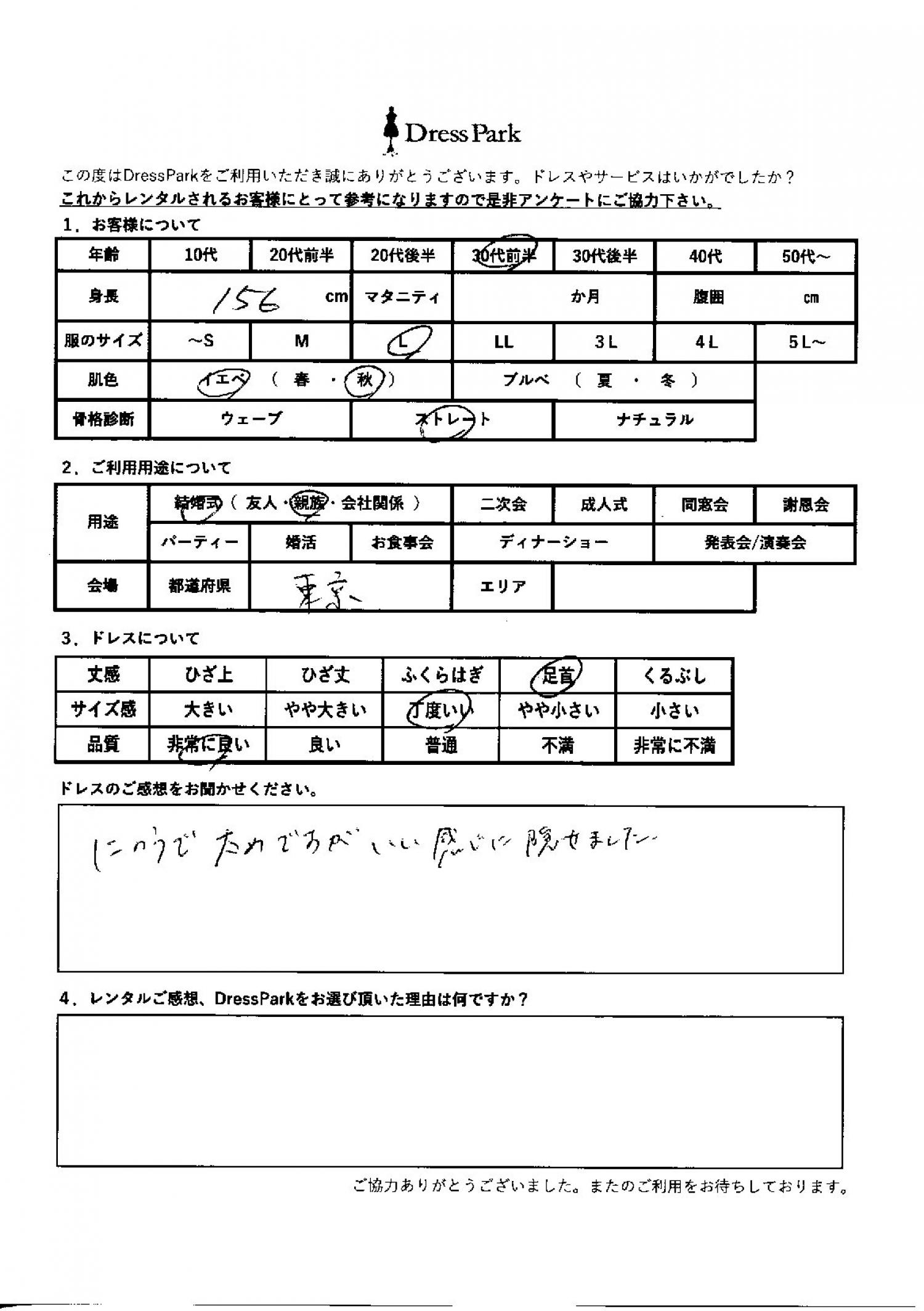 東京都 H.O様156㎝ Lサイズ #30代#M/L#155~159㎝#結婚式(親族)#東京都 ◆レンタルしたドレスはこちら ◆レンタルしたサイズは:L ◆レンタルした日付:2026/03/21 ドレスの着用感 ◆点数: (5点) ◆丈感:足首 ◆サイズ感:丁度いい ◆品質:非常に良い ◆肌色:イエベ ◆骨格診断:ストレート ドレスの感想 二の腕太めですが、いい感じに隠せました。 CUSTOMER REVIEWS お客様の声 気になるカテゴリー別にご利用の感想をチェック! ◆AGE 年代で見る 10代 20代 30代 40代 50代~ ◆SIZE サイズで見る SS/S M/L 大きいサイズLL~ ◆HIGHT 身長で見る 140~149㎝ 150~154㎝ 155~159㎝ 160~164㎝ 165~169㎝ 170㎝以上 ◆マタニティ ~3か月 4~6か月 7~8か月 9~10か月 ◆肌色 イエベ ブルべ ◆骨格診断 ウェーブ ストレート ナチュラル ◆利用シーン 結婚式(友人) 結婚式(親族) 結婚式(会社関係) 二次会 成人式/同窓会 謝恩会 パーティー その他 CUSTOMER REVIEWS都道府県別お客様の声 都道府県別にのお客様の声をチェック! 北海道 青森県 岩手県 宮城県 秋田県 山形県 福島県 茨城県 栃木県 群馬県 埼玉県 千葉県 東京都 神奈川県 新潟県 富山県 石川県 福井県 山梨県 長野県 岐阜県 静岡県 愛知県 三重県 滋賀県 京都府 大阪府 兵庫県 奈良県 和歌山県 鳥取県 島根県 岡山県 広島県 山口県 徳島県 香川県 愛媛県 高知県 福岡県 佐賀県 長崎県 熊本県 大分県 宮崎県 鹿児島県 沖縄県 CUSTOMER REVIEWSエリア別お客様の声 都道府県別にのお客様の声をチェック! 札幌 仙台 名古屋 軽井沢 金沢 神戸・芦屋 博多 那覇 梅田・新大阪 難波・心斎橋 鎌倉・湘南 横浜・みなとみらい 舞浜・浦安・幕張 大宮・浦和 青山・表参道 六本木・麻布 渋谷・恵比寿 新宿 池袋 銀座・丸の内 お台場・汐留 鹿児島市 郡山市 福島市 東予 甲府・石和 LINEでお問い合わせ このサイトではJavaScriptを使用しています