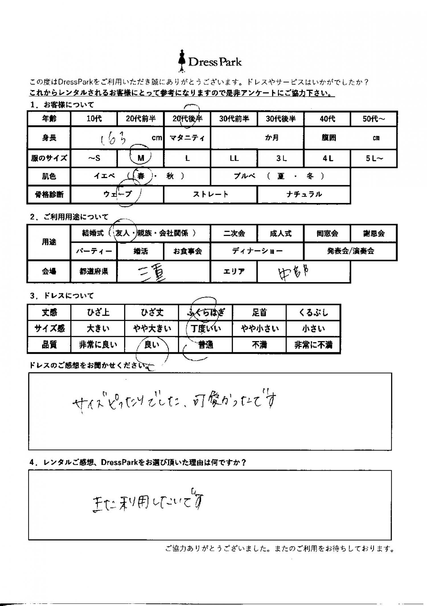 三重県 H.N様163㎝ Mサイズ #20代#M/L#160~164㎝#結婚式(友人)#三重県 ◆レンタルしたドレスはこちら ◆レンタルしたサイズは:M ◆レンタルした日付:2026/03/21 ドレスの着用感 ◆点数: (4点) ◆丈感:ふくらはぎ ◆サイズ感:丁度いい ◆品質:良い ◆肌色:イエベ ◆骨格診断:ウェーブ ドレスの感想 サイズぴったりでした。かわいかったです。 レンタルのご感想、DressParkをお選び頂いた理由 また利用したいです。 CUSTOMER REVIEWS お客様の声 気になるカテゴリー別にご利用の感想をチェック! ◆AGE 年代で見る 10代 20代 30代 40代 50代~ ◆SIZE サイズで見る SS/S M/L 大きいサイズLL~ ◆HIGHT 身長で見る 140~149㎝ 150~154㎝ 155~159㎝ 160~164㎝ 165~169㎝ 170㎝以上 ◆マタニティ ~3か月 4~6か月 7~8か月 9~10か月 ◆肌色 イエベ ブルべ ◆骨格診断 ウェーブ ストレート ナチュラル ◆利用シーン 結婚式(友人) 結婚式(親族) 結婚式(会社関係) 二次会 成人式/同窓会 謝恩会 パーティー その他 CUSTOMER REVIEWS都道府県別お客様の声 都道府県別にのお客様の声をチェック! 北海道 青森県 岩手県 宮城県 秋田県 山形県 福島県 茨城県 栃木県 群馬県 埼玉県 千葉県 東京都 神奈川県 新潟県 富山県 石川県 福井県 山梨県 長野県 岐阜県 静岡県 愛知県 三重県 滋賀県 京都府 大阪府 兵庫県 奈良県 和歌山県 鳥取県 島根県 岡山県 広島県 山口県 徳島県 香川県 愛媛県 高知県 福岡県 佐賀県 長崎県 熊本県 大分県 宮崎県 鹿児島県 沖縄県 CUSTOMER REVIEWSエリア別お客様の声 都道府県別にのお客様の声をチェック! 札幌 仙台 名古屋 軽井沢 金沢 神戸・芦屋 博多 那覇 梅田・新大阪 難波・心斎橋 鎌倉・湘南 横浜・みなとみらい 舞浜・浦安・幕張 大宮・浦和 青山・表参道 六本木・麻布 渋谷・恵比寿 新宿 池袋 銀座・丸の内 お台場・汐留 鹿児島市 郡山市 福島市 東予 甲府・石和 LINEでお問い合わせ このサイトではJavaScriptを使用しています