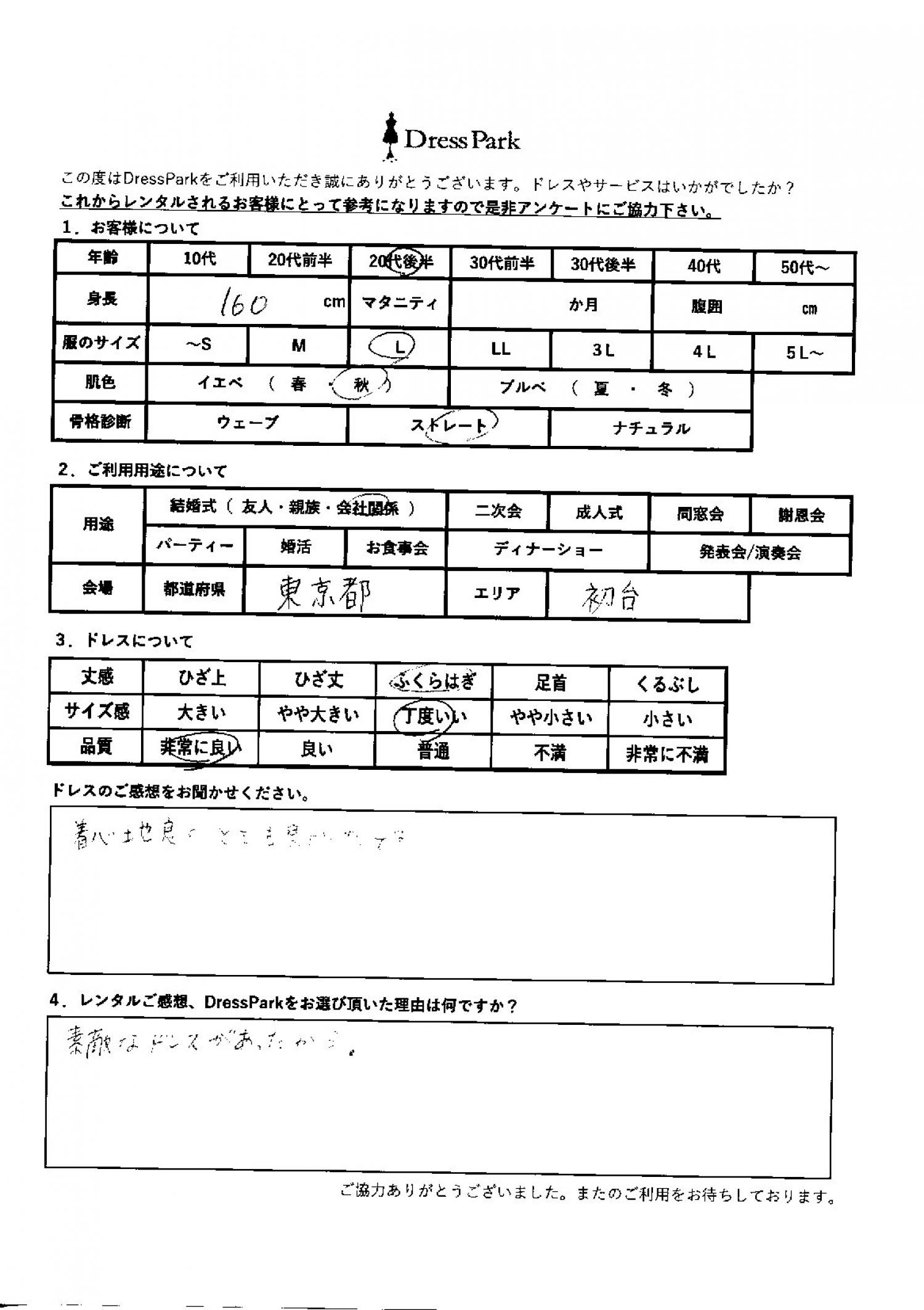 東京都 M.K様160㎝ Lサイズ新宿 #20代#M/L#160~164㎝#結婚式(会社関係)#東京都#新宿 ◆レンタルしたドレスはこちら ◆レンタルしたサイズは:L ◆レンタルした日付:2026/03/21 ドレスの着用感 ◆点数: (5点) ◆丈感:ふくらはぎ ◆サイズ感:丁度いい ◆品質:非常に良い ◆肌色:イエベ ◆骨格診断:ストレート ドレスの感想 着心地良くとても良かったです。 レンタルのご感想、DressParkをお選び頂いた理由 素敵なドレスがあったから。 CUSTOMER REVIEWS お客様の声 気になるカテゴリー別にご利用の感想をチェック! ◆AGE 年代で見る 10代 20代 30代 40代 50代~ ◆SIZE サイズで見る SS/S M/L 大きいサイズLL~ ◆HIGHT 身長で見る 140~149㎝ 150~154㎝ 155~159㎝ 160~164㎝ 165~169㎝ 170㎝以上 ◆マタニティ ~3か月 4~6か月 7~8か月 9~10か月 ◆肌色 イエベ ブルべ ◆骨格診断 ウェーブ ストレート ナチュラル ◆利用シーン 結婚式(友人) 結婚式(親族) 結婚式(会社関係) 二次会 成人式/同窓会 謝恩会 パーティー その他 CUSTOMER REVIEWS都道府県別お客様の声 都道府県別にのお客様の声をチェック! 北海道 青森県 岩手県 宮城県 秋田県 山形県 福島県 茨城県 栃木県 群馬県 埼玉県 千葉県 東京都 神奈川県 新潟県 富山県 石川県 福井県 山梨県 長野県 岐阜県 静岡県 愛知県 三重県 滋賀県 京都府 大阪府 兵庫県 奈良県 和歌山県 鳥取県 島根県 岡山県 広島県 山口県 徳島県 香川県 愛媛県 高知県 福岡県 佐賀県 長崎県 熊本県 大分県 宮崎県 鹿児島県 沖縄県 CUSTOMER REVIEWSエリア別お客様の声 都道府県別にのお客様の声をチェック! 札幌 仙台 名古屋 軽井沢 金沢 神戸・芦屋 博多 那覇 梅田・新大阪 難波・心斎橋 鎌倉・湘南 横浜・みなとみらい 舞浜・浦安・幕張 大宮・浦和 青山・表参道 六本木・麻布 渋谷・恵比寿 新宿 池袋 銀座・丸の内 お台場・汐留 鹿児島市 郡山市 福島市 東予 甲府・石和 LINEでお問い合わせ このサイトではJavaScriptを使用しています