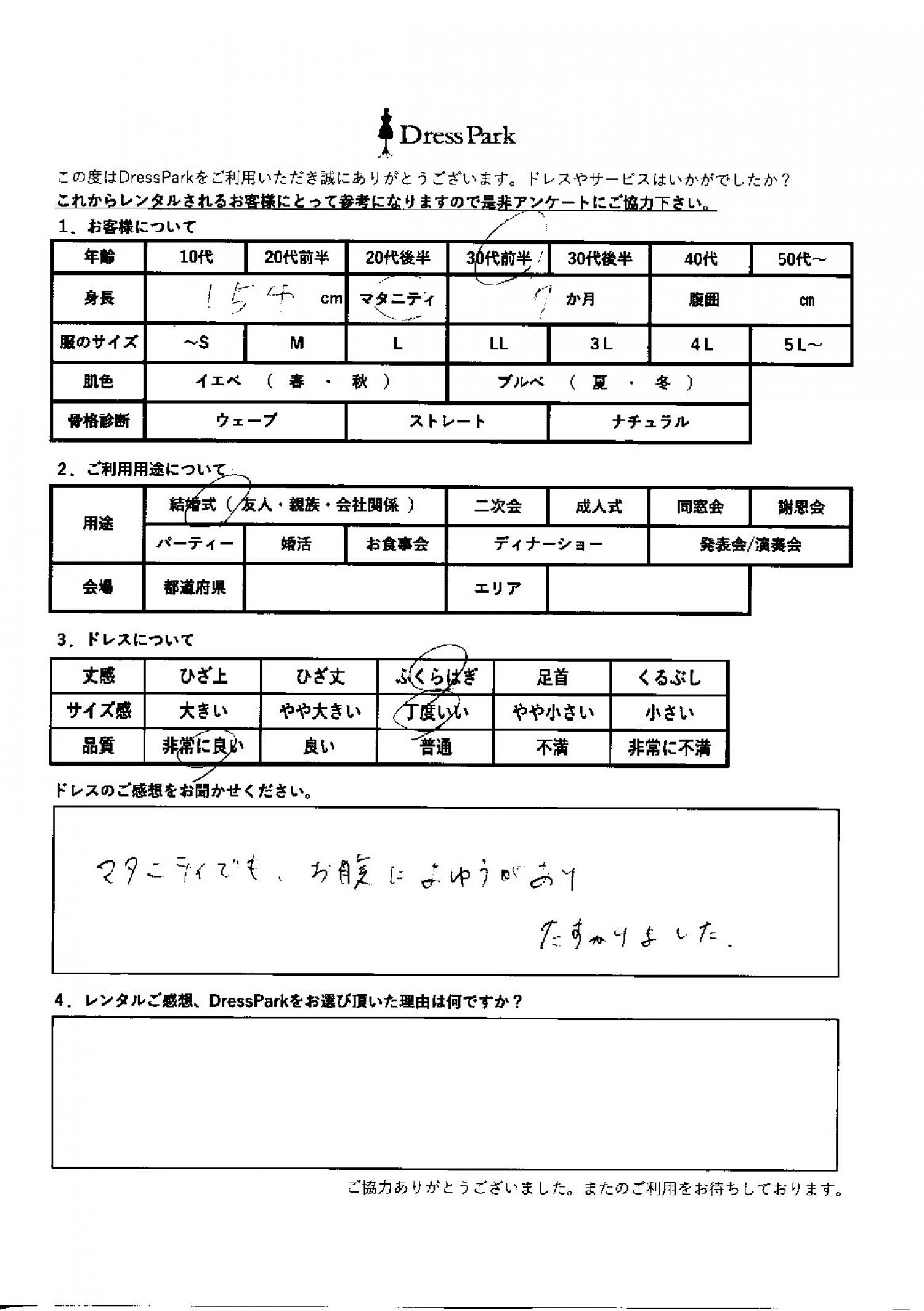 東京都 Y.Y様154㎝ Mサイズ マタニティ #30代#M/L#150~154㎝#結婚式(友人)#東京都 ◆レンタルしたドレスはこちら ◆レンタルしたサイズは:M ◆レンタルした日付:2026/03/21 ドレスの着用感 ◆点数: (5点) ◆丈感:ふくらはぎ ◆サイズ感:丁度いい ◆品質:非常に良い ◆マタニティ:7ヶ月 ドレスの感想 マタニティーでもお腹に余裕があり助かりました。 CUSTOMER REVIEWS お客様の声 気になるカテゴリー別にご利用の感想をチェック! ◆AGE 年代で見る 10代 20代 30代 40代 50代~ ◆SIZE サイズで見る SS/S M/L 大きいサイズLL~ ◆HIGHT 身長で見る 140~149㎝ 150~154㎝ 155~159㎝ 160~164㎝ 165~169㎝ 170㎝以上 ◆マタニティ ~3か月 4~6か月 7~8か月 9~10か月 ◆肌色 イエベ ブルべ ◆骨格診断 ウェーブ ストレート ナチュラル ◆利用シーン 結婚式(友人) 結婚式(親族) 結婚式(会社関係) 二次会 成人式/同窓会 謝恩会 パーティー その他 CUSTOMER REVIEWS都道府県別お客様の声 都道府県別にのお客様の声をチェック! 北海道 青森県 岩手県 宮城県 秋田県 山形県 福島県 茨城県 栃木県 群馬県 埼玉県 千葉県 東京都 神奈川県 新潟県 富山県 石川県 福井県 山梨県 長野県 岐阜県 静岡県 愛知県 三重県 滋賀県 京都府 大阪府 兵庫県 奈良県 和歌山県 鳥取県 島根県 岡山県 広島県 山口県 徳島県 香川県 愛媛県 高知県 福岡県 佐賀県 長崎県 熊本県 大分県 宮崎県 鹿児島県 沖縄県 CUSTOMER REVIEWSエリア別お客様の声 都道府県別にのお客様の声をチェック! 札幌 仙台 名古屋 軽井沢 金沢 神戸・芦屋 博多 那覇 梅田・新大阪 難波・心斎橋 鎌倉・湘南 横浜・みなとみらい 舞浜・浦安・幕張 大宮・浦和 青山・表参道 六本木・麻布 渋谷・恵比寿 新宿 池袋 銀座・丸の内 お台場・汐留 鹿児島市 郡山市 福島市 東予 甲府・石和 LINEでお問い合わせ このサイトではJavaScriptを使用しています