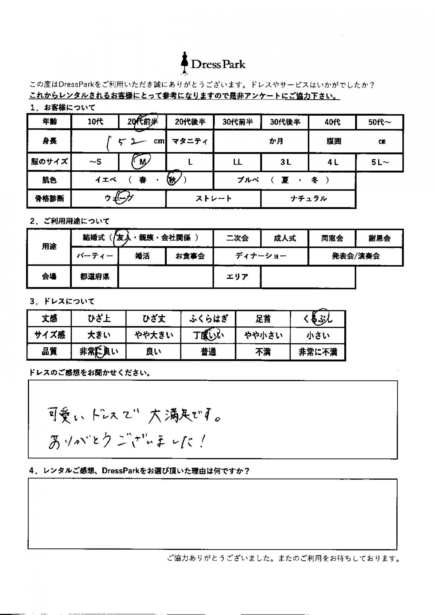 三重県 N.O様152㎝ Mサイズ #20代#M/L#150~154㎝#結婚式(友人)#三重県 ◆レンタルしたドレスはこちら ◆レンタルしたサイズは:M ◆レンタルした日付:2026/03/28 ドレスの着用感 ◆点数: (5点) ◆丈感:くるぶし ◆サイズ感:丁度いい ◆品質:非常に良い ◆肌色:イエベ ◆骨格診断:ウェーブ ドレスの感想 かわいいドレスで大満足です。ありがとうございました! CUSTOMER REVIEWS お客様の声 気になるカテゴリー別にご利用の感想をチェック! ◆AGE 年代で見る 10代 20代 30代 40代 50代~ ◆SIZE サイズで見る SS/S M/L 大きいサイズLL~ ◆HIGHT 身長で見る 140~149㎝ 150~154㎝ 155~159㎝ 160~164㎝ 165~169㎝ 170㎝以上 ◆マタニティ ~3か月 4~6か月 7~8か月 9~10か月 ◆肌色 イエベ ブルべ ◆骨格診断 ウェーブ ストレート ナチュラル ◆利用シーン 結婚式(友人) 結婚式(親族) 結婚式(会社関係) 二次会 成人式/同窓会 謝恩会 パーティー その他 CUSTOMER REVIEWS都道府県別お客様の声 都道府県別にのお客様の声をチェック! 北海道 青森県 岩手県 宮城県 秋田県 山形県 福島県 茨城県 栃木県 群馬県 埼玉県 千葉県 東京都 神奈川県 新潟県 富山県 石川県 福井県 山梨県 長野県 岐阜県 静岡県 愛知県 三重県 滋賀県 京都府 大阪府 兵庫県 奈良県 和歌山県 鳥取県 島根県 岡山県 広島県 山口県 徳島県 香川県 愛媛県 高知県 福岡県 佐賀県 長崎県 熊本県 大分県 宮崎県 鹿児島県 沖縄県 CUSTOMER REVIEWSエリア別お客様の声 都道府県別にのお客様の声をチェック! 札幌 仙台 名古屋 軽井沢 金沢 神戸・芦屋 博多 那覇 梅田・新大阪 難波・心斎橋 鎌倉・湘南 横浜・みなとみらい 舞浜・浦安・幕張 大宮・浦和 青山・表参道 六本木・麻布 渋谷・恵比寿 新宿 池袋 銀座・丸の内 お台場・汐留 鹿児島市 郡山市 福島市 東予 甲府・石和 LINEでお問い合わせ このサイトではJavaScriptを使用しています