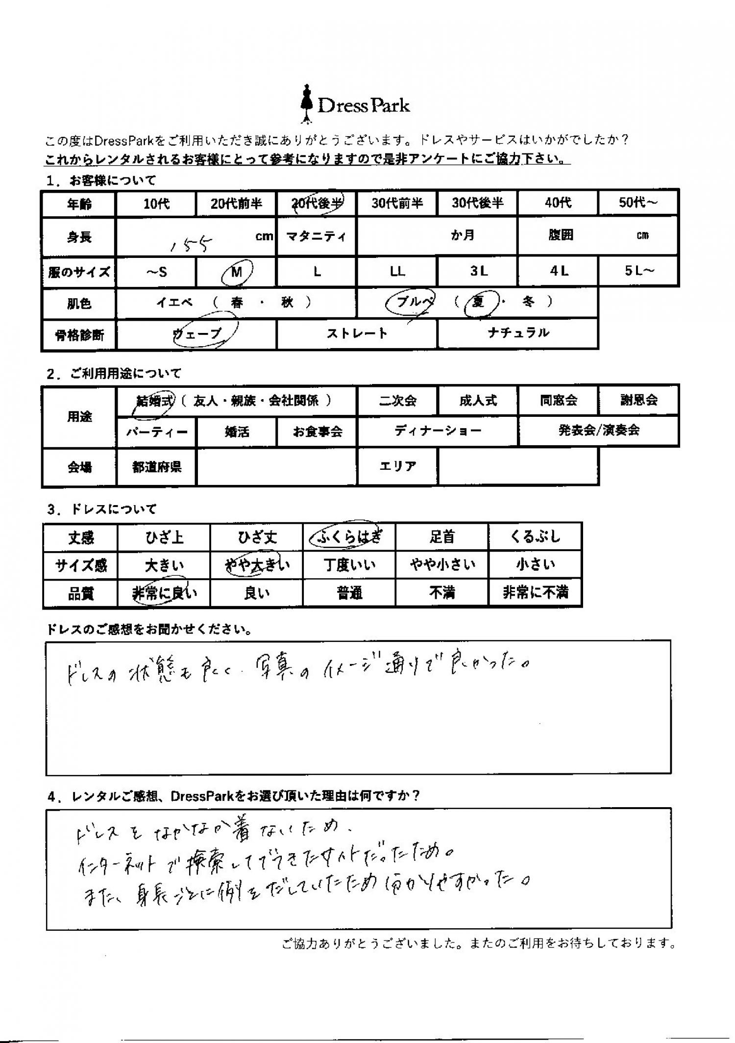 ドレスの状態も良く、写真のイメージ通りで良かった。レンタルのご感想、