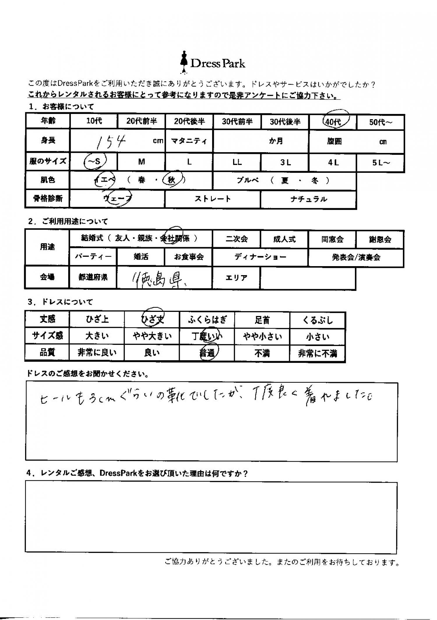 徳島県 N.N様154㎝ ~Sサイズ #40代#SS/S#150~154㎝#結婚式(会社関係)#徳島県 ◆レンタルしたドレスはこちら ◆レンタルしたサイズは:M ◆レンタルした日付:2026/03/28 ドレスの着用感 ◆点数: (4点) ◆丈感:ひざ丈 ◆サイズ感:丁度いい ◆品質:普通 ◆肌色:イエベ ◆骨格診断:ウェーブ ドレスの感想 ヒールも3センチ位の靴でしたが、ちょうどよく着られました。 CUSTOMER REVIEWS お客様の声 気になるカテゴリー別にご利用の感想をチェック! ◆AGE 年代で見る 10代 20代 30代 40代 50代~ ◆SIZE サイズで見る SS/S M/L 大きいサイズLL~ ◆HIGHT 身長で見る 140~149㎝ 150~154㎝ 155~159㎝ 160~164㎝ 165~169㎝ 170㎝以上 ◆マタニティ ~3か月 4~6か月 7~8か月 9~10か月 ◆肌色 イエベ ブルべ ◆骨格診断 ウェーブ ストレート ナチュラル ◆利用シーン 結婚式(友人) 結婚式(親族) 結婚式(会社関係) 二次会 成人式/同窓会 謝恩会 パーティー その他 CUSTOMER REVIEWS都道府県別お客様の声 都道府県別にのお客様の声をチェック! 北海道 青森県 岩手県 宮城県 秋田県 山形県 福島県 茨城県 栃木県 群馬県 埼玉県 千葉県 東京都 神奈川県 新潟県 富山県 石川県 福井県 山梨県 長野県 岐阜県 静岡県 愛知県 三重県 滋賀県 京都府 大阪府 兵庫県 奈良県 和歌山県 鳥取県 島根県 岡山県 広島県 山口県 徳島県 香川県 愛媛県 高知県 福岡県 佐賀県 長崎県 熊本県 大分県 宮崎県 鹿児島県 沖縄県 CUSTOMER REVIEWSエリア別お客様の声 都道府県別にのお客様の声をチェック! 札幌 仙台 名古屋 軽井沢 金沢 神戸・芦屋 博多 那覇 梅田・新大阪 難波・心斎橋 鎌倉・湘南 横浜・みなとみらい 舞浜・浦安・幕張 大宮・浦和 青山・表参道 六本木・麻布 渋谷・恵比寿 新宿 池袋 銀座・丸の内 お台場・汐留 鹿児島市 郡山市 福島市 東予 甲府・石和 LINEでお問い合わせ このサイトではJavaScriptを使用しています