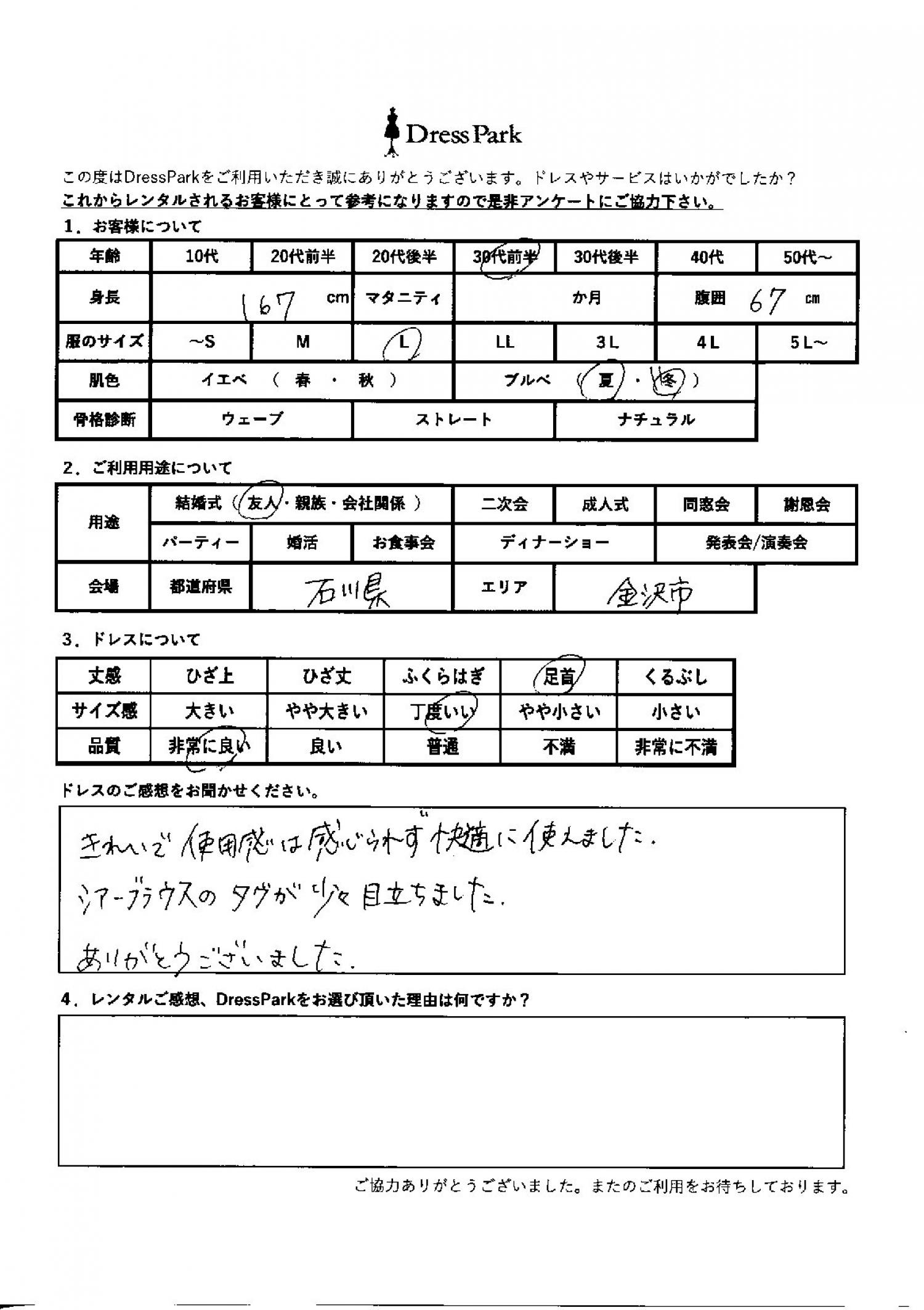 石川県 H.I様167㎝ Lサイズ金沢 #30代#M/L#165~169㎝#結婚式(友人)#石川県#金沢 ◆レンタルしたドレスはこちら ◆レンタルしたサイズは:L ◆レンタルした日付:2026/03/28 ドレスの着用感 ◆点数: (5点) ◆丈感:足首 ◆サイズ感:丁度いい ◆品質:非常に良い ◆肌色:ブルべ ドレスの感想 綺麗で使用感は感じられず、快適に使えました。シアーブラウスのタグが少々目立ちました。ありがとうございました。 CUSTOMER REVIEWS お客様の声 気になるカテゴリー別にご利用の感想をチェック! ◆AGE 年代で見る 10代 20代 30代 40代 50代~ ◆SIZE サイズで見る SS/S M/L 大きいサイズLL~ ◆HIGHT 身長で見る 140~149㎝ 150~154㎝ 155~159㎝ 160~164㎝ 165~169㎝ 170㎝以上 ◆マタニティ ~3か月 4~6か月 7~8か月 9~10か月 ◆肌色 イエベ ブルべ ◆骨格診断 ウェーブ ストレート ナチュラル ◆利用シーン 結婚式(友人) 結婚式(親族) 結婚式(会社関係) 二次会 成人式/同窓会 謝恩会 パーティー その他 CUSTOMER REVIEWS都道府県別お客様の声 都道府県別にのお客様の声をチェック! 北海道 青森県 岩手県 宮城県 秋田県 山形県 福島県 茨城県 栃木県 群馬県 埼玉県 千葉県 東京都 神奈川県 新潟県 富山県 石川県 福井県 山梨県 長野県 岐阜県 静岡県 愛知県 三重県 滋賀県 京都府 大阪府 兵庫県 奈良県 和歌山県 鳥取県 島根県 岡山県 広島県 山口県 徳島県 香川県 愛媛県 高知県 福岡県 佐賀県 長崎県 熊本県 大分県 宮崎県 鹿児島県 沖縄県 CUSTOMER REVIEWSエリア別お客様の声 都道府県別にのお客様の声をチェック! 札幌 仙台 名古屋 軽井沢 金沢 神戸・芦屋 博多 那覇 梅田・新大阪 難波・心斎橋 鎌倉・湘南 横浜・みなとみらい 舞浜・浦安・幕張 大宮・浦和 青山・表参道 六本木・麻布 渋谷・恵比寿 新宿 池袋 銀座・丸の内 お台場・汐留 鹿児島市 郡山市 福島市 東予 甲府・石和 LINEでお問い合わせ このサイトではJavaScriptを使用しています