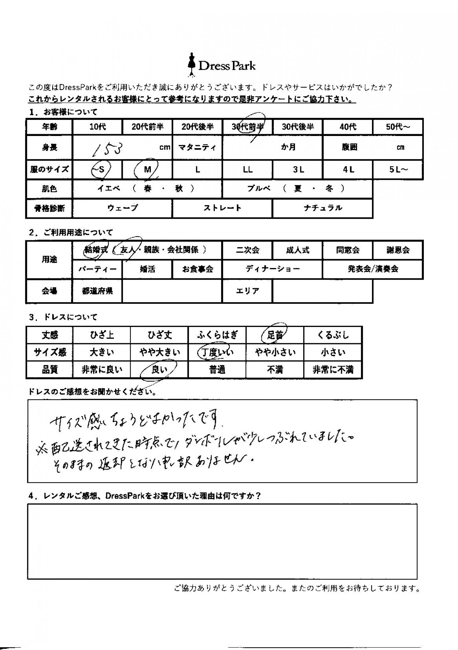 兵庫県 K.I様153㎝ Mサイズ神戸・芦屋 #30代#M/L#150~154㎝#結婚式(友人)#兵庫県#神戸・芦屋 ◆レンタルしたドレスはこちら ◆レンタルしたサイズは:M ◆レンタルした日付:2026/03/28 ドレスの着用感 ◆点数: (4点) ◆丈感:足首 ◆サイズ感:丁度いい ◆品質:良い ドレスの感想 サイズ感ちょうど良かったです。 レンタルのご感想、DressParkをお選び頂いた理由 配送されてきた時点で、段ボールが少し潰れていました。そのままの返却となり申し訳ありません。 CUSTOMER REVIEWS お客様の声 気になるカテゴリー別にご利用の感想をチェック! ◆AGE 年代で見る 10代 20代 30代 40代 50代~ ◆SIZE サイズで見る SS/S M/L 大きいサイズLL~ ◆HIGHT 身長で見る 140~149㎝ 150~154㎝ 155~159㎝ 160~164㎝ 165~169㎝ 170㎝以上 ◆マタニティ ~3か月 4~6か月 7~8か月 9~10か月 ◆肌色 イエベ ブルべ ◆骨格診断 ウェーブ ストレート ナチュラル ◆利用シーン 結婚式(友人) 結婚式(親族) 結婚式(会社関係) 二次会 成人式/同窓会 謝恩会 パーティー その他 CUSTOMER REVIEWS都道府県別お客様の声 都道府県別にのお客様の声をチェック! 北海道 青森県 岩手県 宮城県 秋田県 山形県 福島県 茨城県 栃木県 群馬県 埼玉県 千葉県 東京都 神奈川県 新潟県 富山県 石川県 福井県 山梨県 長野県 岐阜県 静岡県 愛知県 三重県 滋賀県 京都府 大阪府 兵庫県 奈良県 和歌山県 鳥取県 島根県 岡山県 広島県 山口県 徳島県 香川県 愛媛県 高知県 福岡県 佐賀県 長崎県 熊本県 大分県 宮崎県 鹿児島県 沖縄県 CUSTOMER REVIEWSエリア別お客様の声 都道府県別にのお客様の声をチェック! 札幌 仙台 名古屋 軽井沢 金沢 神戸・芦屋 博多 那覇 梅田・新大阪 難波・心斎橋 鎌倉・湘南 横浜・みなとみらい 舞浜・浦安・幕張 大宮・浦和 青山・表参道 六本木・麻布 渋谷・恵比寿 新宿 池袋 銀座・丸の内 お台場・汐留 鹿児島市 郡山市 福島市 東予 甲府・石和 LINEでお問い合わせ このサイトではJavaScriptを使用しています