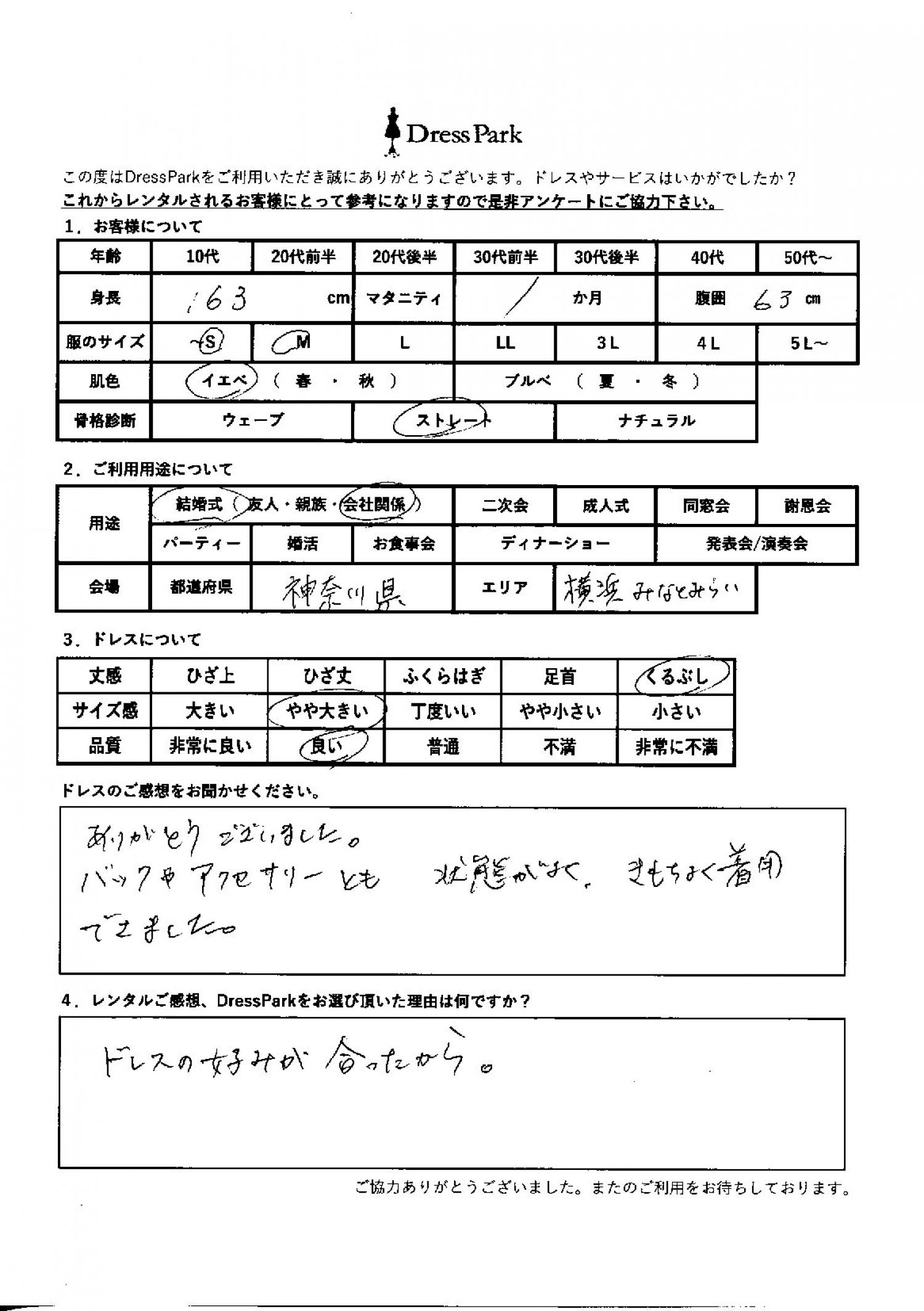 神奈川県 E.T様163㎝ ~Sサイズ横浜・みなとみらい #20代#SS/S#160~164㎝#結婚式(会社関係)#神奈川県#横浜・みなとみらい ◆レンタルしたドレスはこちら ◆レンタルしたサイズは:M ◆レンタルした日付:2026/03/28 ドレスの着用感 ◆点数: (5点) ◆丈感:くるぶし ◆サイズ感:やや大きい ◆品質:良い ◆肌色:イエベ ◆骨格診断:ストレート ドレスの感想 ありがとうございました。バッグ、アクセサリーとも状態が良く、気持ちよく着用できました。 レンタルのご感想、DressParkをお選び頂いた理由 ドレスの好みがあったから。 CUSTOMER REVIEWS お客様の声 気になるカテゴリー別にご利用の感想をチェック! ◆AGE 年代で見る 10代 20代 30代 40代 50代~ ◆SIZE サイズで見る SS/S M/L 大きいサイズLL~ ◆HIGHT 身長で見る 140~149㎝ 150~154㎝ 155~159㎝ 160~164㎝ 165~169㎝ 170㎝以上 ◆マタニティ ~3か月 4~6か月 7~8か月 9~10か月 ◆肌色 イエベ ブルべ ◆骨格診断 ウェーブ ストレート ナチュラル ◆利用シーン 結婚式(友人) 結婚式(親族) 結婚式(会社関係) 二次会 成人式/同窓会 謝恩会 パーティー その他 CUSTOMER REVIEWS都道府県別お客様の声 都道府県別にのお客様の声をチェック! 北海道 青森県 岩手県 宮城県 秋田県 山形県 福島県 茨城県 栃木県 群馬県 埼玉県 千葉県 東京都 神奈川県 新潟県 富山県 石川県 福井県 山梨県 長野県 岐阜県 静岡県 愛知県 三重県 滋賀県 京都府 大阪府 兵庫県 奈良県 和歌山県 鳥取県 島根県 岡山県 広島県 山口県 徳島県 香川県 愛媛県 高知県 福岡県 佐賀県 長崎県 熊本県 大分県 宮崎県 鹿児島県 沖縄県 CUSTOMER REVIEWSエリア別お客様の声 都道府県別にのお客様の声をチェック! 札幌 仙台 名古屋 軽井沢 金沢 神戸・芦屋 博多 那覇 梅田・新大阪 難波・心斎橋 鎌倉・湘南 横浜・みなとみらい 舞浜・浦安・幕張 大宮・浦和 青山・表参道 六本木・麻布 渋谷・恵比寿 新宿 池袋 銀座・丸の内 お台場・汐留 鹿児島市 郡山市 福島市 東予 甲府・石和 LINEでお問い合わせ このサイトではJavaScriptを使用しています