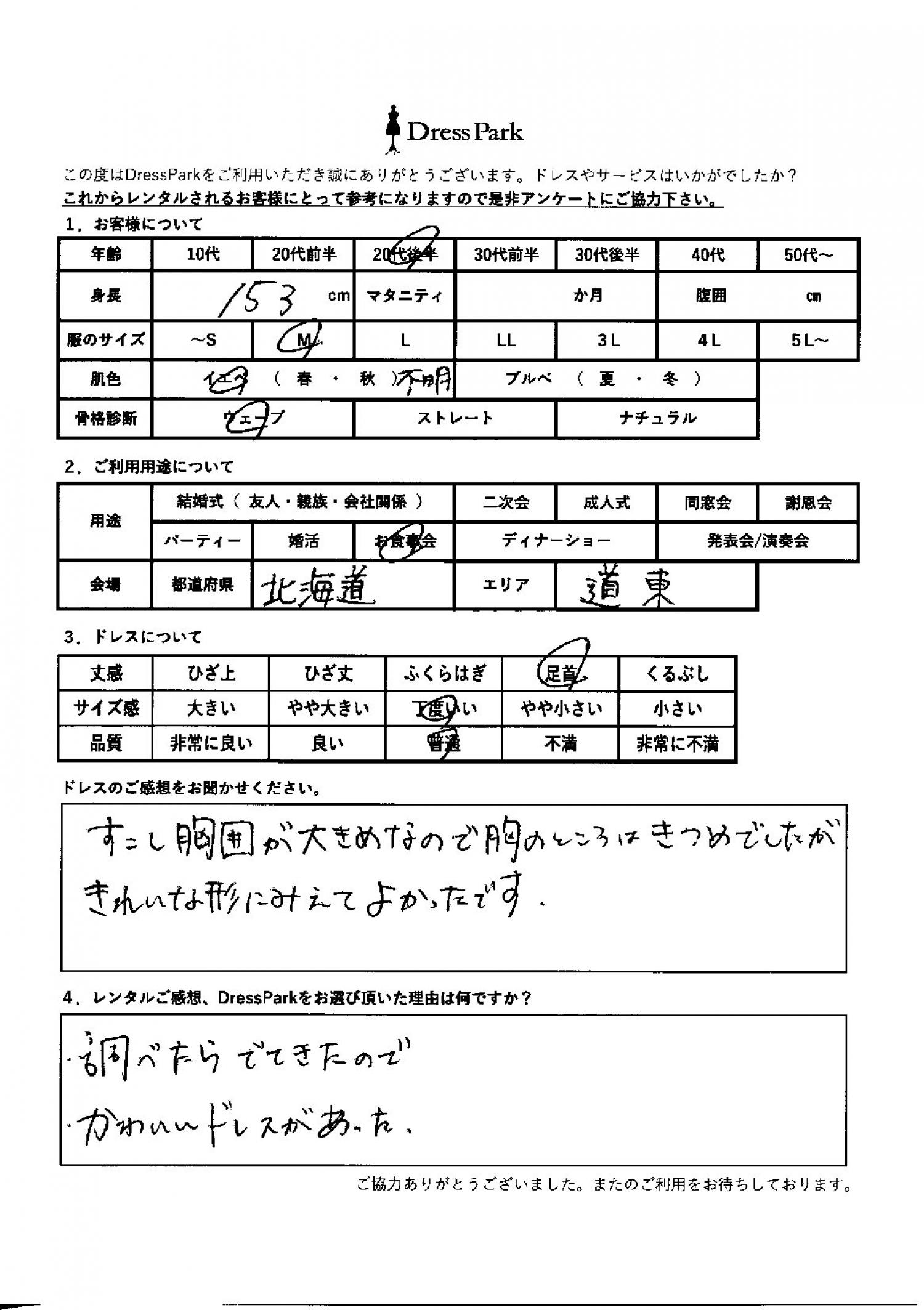 北海道 K.N様153㎝ Mサイズ #20代#M/L#150~154㎝#その他#北海道 ◆レンタルしたドレスはこちら ◆レンタルしたサイズは:M ◆レンタルした日付:2026/03/28 ドレスの着用感 ◆点数: (4点) ◆丈感:足首 ◆サイズ感:丁度いい ◆品質:普通 ◆肌色:イエベ ◆骨格診断:ウェーブ ドレスの感想 少し胸囲が大きめなので、胸のところはきつめでしたが、きれいな形に見えてよかったです。 レンタルのご感想、DressParkをお選び頂いた理由 調べたら出てきたので。かわいいドレスがあった。 CUSTOMER REVIEWS お客様の声 気になるカテゴリー別にご利用の感想をチェック! ◆AGE 年代で見る 10代 20代 30代 40代 50代~ ◆SIZE サイズで見る SS/S M/L 大きいサイズLL~ ◆HIGHT 身長で見る 140~149㎝ 150~154㎝ 155~159㎝ 160~164㎝ 165~169㎝ 170㎝以上 ◆マタニティ ~3か月 4~6か月 7~8か月 9~10か月 ◆肌色 イエベ ブルべ ◆骨格診断 ウェーブ ストレート ナチュラル ◆利用シーン 結婚式(友人) 結婚式(親族) 結婚式(会社関係) 二次会 成人式/同窓会 謝恩会 パーティー その他 CUSTOMER REVIEWS都道府県別お客様の声 都道府県別にのお客様の声をチェック! 北海道 青森県 岩手県 宮城県 秋田県 山形県 福島県 茨城県 栃木県 群馬県 埼玉県 千葉県 東京都 神奈川県 新潟県 富山県 石川県 福井県 山梨県 長野県 岐阜県 静岡県 愛知県 三重県 滋賀県 京都府 大阪府 兵庫県 奈良県 和歌山県 鳥取県 島根県 岡山県 広島県 山口県 徳島県 香川県 愛媛県 高知県 福岡県 佐賀県 長崎県 熊本県 大分県 宮崎県 鹿児島県 沖縄県 CUSTOMER REVIEWSエリア別お客様の声 都道府県別にのお客様の声をチェック! 札幌 仙台 名古屋 軽井沢 金沢 神戸・芦屋 博多 那覇 梅田・新大阪 難波・心斎橋 鎌倉・湘南 横浜・みなとみらい 舞浜・浦安・幕張 大宮・浦和 青山・表参道 六本木・麻布 渋谷・恵比寿 新宿 池袋 銀座・丸の内 お台場・汐留 鹿児島市 郡山市 福島市 東予 甲府・石和 LINEでお問い合わせ このサイトではJavaScriptを使用しています