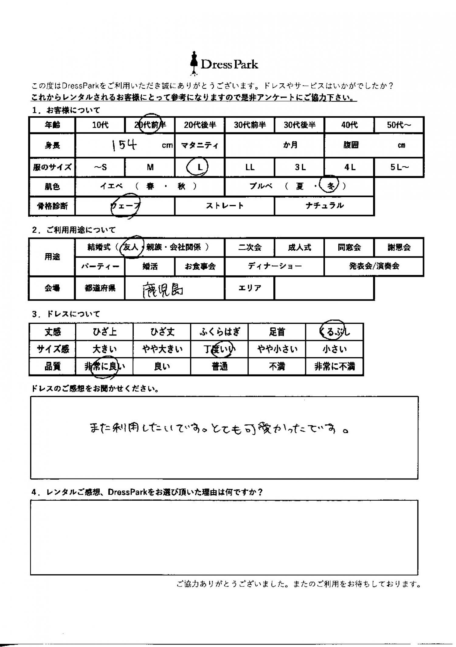 鹿児島県 H.S様154㎝ Lサイズ #20代#M/L#150~154㎝#結婚式(友人)#鹿児島県 ◆レンタルしたドレスはこちら ◆レンタルしたサイズは:L ◆レンタルした日付:2026/03/28 ドレスの着用感 ◆点数: (5点) ◆丈感:くるぶし ◆サイズ感:丁度いい ◆品質:非常に良い ◆肌色:ブルべ ◆骨格診断:ウェーブ ドレスの感想 また利用したいです。とても可愛かったです。 CUSTOMER REVIEWS お客様の声 気になるカテゴリー別にご利用の感想をチェック! ◆AGE 年代で見る 10代 20代 30代 40代 50代~ ◆SIZE サイズで見る SS/S M/L 大きいサイズLL~ ◆HIGHT 身長で見る 140~149㎝ 150~154㎝ 155~159㎝ 160~164㎝ 165~169㎝ 170㎝以上 ◆マタニティ ~3か月 4~6か月 7~8か月 9~10か月 ◆肌色 イエベ ブルべ ◆骨格診断 ウェーブ ストレート ナチュラル ◆利用シーン 結婚式(友人) 結婚式(親族) 結婚式(会社関係) 二次会 成人式/同窓会 謝恩会 パーティー その他 CUSTOMER REVIEWS都道府県別お客様の声 都道府県別にのお客様の声をチェック! 北海道 青森県 岩手県 宮城県 秋田県 山形県 福島県 茨城県 栃木県 群馬県 埼玉県 千葉県 東京都 神奈川県 新潟県 富山県 石川県 福井県 山梨県 長野県 岐阜県 静岡県 愛知県 三重県 滋賀県 京都府 大阪府 兵庫県 奈良県 和歌山県 鳥取県 島根県 岡山県 広島県 山口県 徳島県 香川県 愛媛県 高知県 福岡県 佐賀県 長崎県 熊本県 大分県 宮崎県 鹿児島県 沖縄県 CUSTOMER REVIEWSエリア別お客様の声 都道府県別にのお客様の声をチェック! 札幌 仙台 名古屋 軽井沢 金沢 神戸・芦屋 博多 那覇 梅田・新大阪 難波・心斎橋 鎌倉・湘南 横浜・みなとみらい 舞浜・浦安・幕張 大宮・浦和 青山・表参道 六本木・麻布 渋谷・恵比寿 新宿 池袋 銀座・丸の内 お台場・汐留 鹿児島市 郡山市 福島市 東予 甲府・石和 LINEでお問い合わせ このサイトではJavaScriptを使用しています