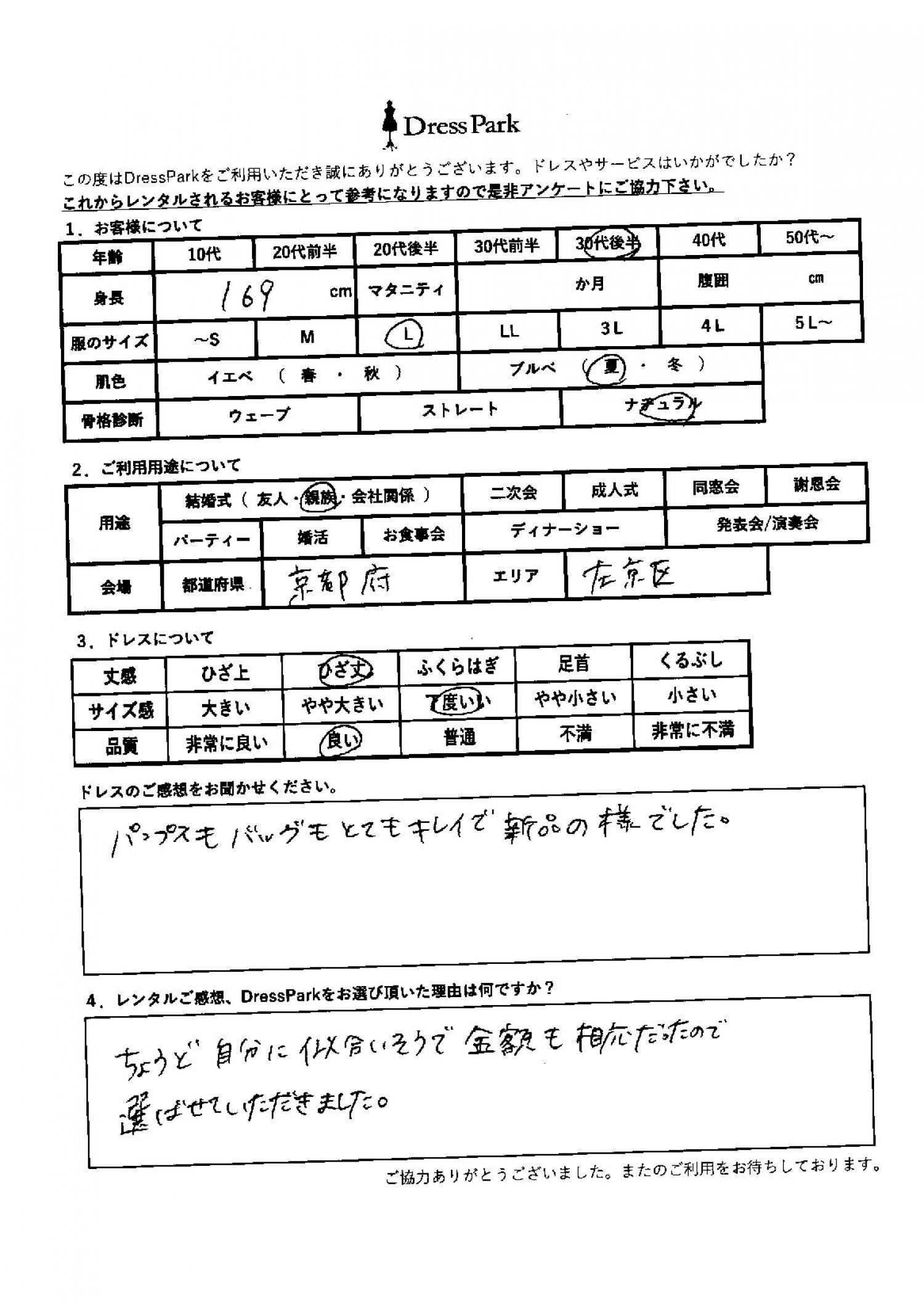京都府 A.K様169㎝ Lサイズ #30代#M/L#165~169㎝#結婚式(親族)#京都府 ◆レンタルしたドレスはこちら ◆レンタルしたサイズは:L ◆レンタルした日付:2026/04/05 ドレスの着用感 ◆点数: (4点) ◆丈感:ひざ丈 ◆サイズ感:丁度いい ◆品質:良い ◆肌色:ブルべ ◆骨格診断:ナチュラル ドレスの感想 パンプスもバッグもとてもキレイで新品の様でした。 レンタルのご感想、DressParkをお選び頂いた理由 ちょうど自分に似合いそうで金額も相応だったので選ばせていただきました。 CUSTOMER REVIEWS お客様の声 気になるカテゴリー別にご利用の感想をチェック! ◆AGE 年代で見る 10代 20代 30代 40代 50代~ ◆SIZE サイズで見る SS/S M/L 大きいサイズLL~ ◆HIGHT 身長で見る 140~149㎝ 150~154㎝ 155~159㎝ 160~164㎝ 165~169㎝ 170㎝以上 ◆マタニティ ~3か月 4~6か月 7~8か月 9~10か月 ◆肌色 イエベ ブルべ ◆骨格診断 ウェーブ ストレート ナチュラル ◆利用シーン 結婚式(友人) 結婚式(親族) 結婚式(会社関係) 二次会 成人式/同窓会 謝恩会 パーティー その他 CUSTOMER REVIEWS都道府県別お客様の声 都道府県別にのお客様の声をチェック! 北海道 青森県 岩手県 宮城県 秋田県 山形県 福島県 茨城県 栃木県 群馬県 埼玉県 千葉県 東京都 神奈川県 新潟県 富山県 石川県 福井県 山梨県 長野県 岐阜県 静岡県 愛知県 三重県 滋賀県 京都府 大阪府 兵庫県 奈良県 和歌山県 鳥取県 島根県 岡山県 広島県 山口県 徳島県 香川県 愛媛県 高知県 福岡県 佐賀県 長崎県 熊本県 大分県 宮崎県 鹿児島県 沖縄県 CUSTOMER REVIEWSエリア別お客様の声 都道府県別にのお客様の声をチェック! 札幌 仙台 名古屋 軽井沢 金沢 神戸・芦屋 博多 那覇 梅田・新大阪 難波・心斎橋 鎌倉・湘南 横浜・みなとみらい 舞浜・浦安・幕張 大宮・浦和 青山・表参道 六本木・麻布 渋谷・恵比寿 新宿 池袋 銀座・丸の内 お台場・汐留 鹿児島市 郡山市 福島市 東予 甲府・石和 LINEでお問い合わせ このサイトではJavaScriptを使用しています