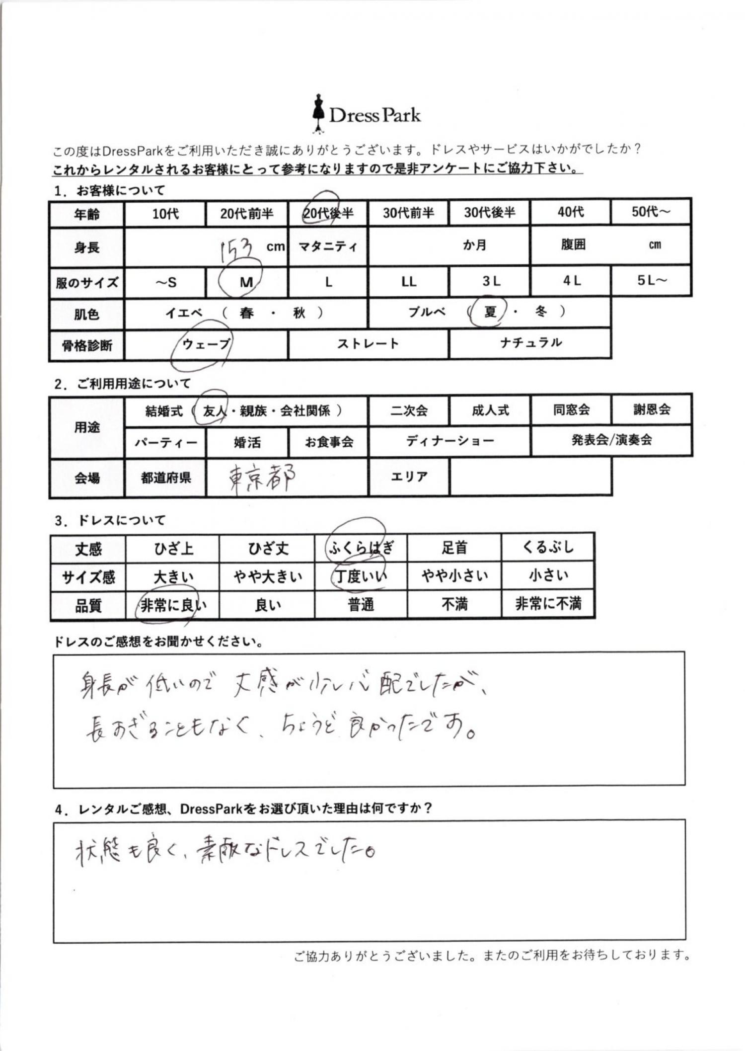 東京都 M.E様153㎝ Mサイズ #20代#M/L#150~154㎝#結婚式(友人)#東京都 ◆レンタルしたドレスはこちら ◆レンタルしたサイズは:L ◆レンタルした日付:2026/04/05 ドレスの着用感 ◆点数: (5点) ◆丈感:ふくらはぎ ◆サイズ感:丁度いい ◆品質:非常に良い ◆肌色:ブルべ ◆骨格診断:ウェーブ ドレスの感想 身長が低いので、丈感が少し心配でしたが、長すぎることもなくちょうど良かったです。 レンタルのご感想、DressParkをお選び頂いた理由 状態も良く素敵なドレスでした。 CUSTOMER REVIEWS お客様の声 気になるカテゴリー別にご利用の感想をチェック! ◆AGE 年代で見る 10代 20代 30代 40代 50代~ ◆SIZE サイズで見る SS/S M/L 大きいサイズLL~ ◆HIGHT 身長で見る 140~149㎝ 150~154㎝ 155~159㎝ 160~164㎝ 165~169㎝ 170㎝以上 ◆マタニティ ~3か月 4~6か月 7~8か月 9~10か月 ◆肌色 イエベ ブルべ ◆骨格診断 ウェーブ ストレート ナチュラル ◆利用シーン 結婚式(友人) 結婚式(親族) 結婚式(会社関係) 二次会 成人式/同窓会 謝恩会 パーティー その他 CUSTOMER REVIEWS都道府県別お客様の声 都道府県別にのお客様の声をチェック! 北海道 青森県 岩手県 宮城県 秋田県 山形県 福島県 茨城県 栃木県 群馬県 埼玉県 千葉県 東京都 神奈川県 新潟県 富山県 石川県 福井県 山梨県 長野県 岐阜県 静岡県 愛知県 三重県 滋賀県 京都府 大阪府 兵庫県 奈良県 和歌山県 鳥取県 島根県 岡山県 広島県 山口県 徳島県 香川県 愛媛県 高知県 福岡県 佐賀県 長崎県 熊本県 大分県 宮崎県 鹿児島県 沖縄県 CUSTOMER REVIEWSエリア別お客様の声 都道府県別にのお客様の声をチェック! 札幌 仙台 名古屋 軽井沢 金沢 神戸・芦屋 博多 那覇 梅田・新大阪 難波・心斎橋 鎌倉・湘南 横浜・みなとみらい 舞浜・浦安・幕張 大宮・浦和 青山・表参道 六本木・麻布 渋谷・恵比寿 新宿 池袋 銀座・丸の内 お台場・汐留 鹿児島市 郡山市 福島市 東予 甲府・石和 LINEでお問い合わせ このサイトではJavaScriptを使用しています