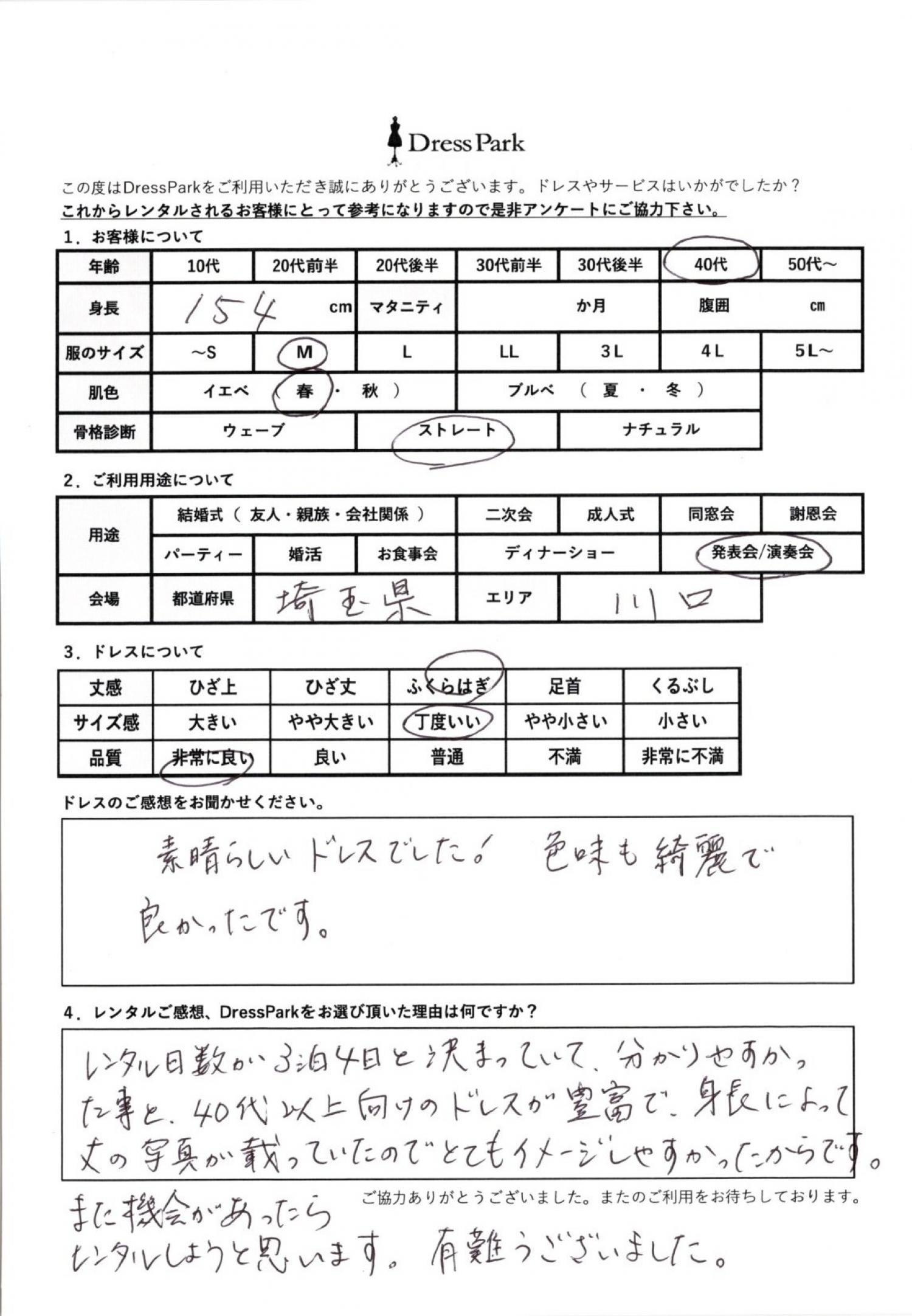 レンタル日数が3泊4日と決まっていてわかりやすかったことと、40代以上向けのドレスが豊富で、身長によって丈の写真が載っていたので、とてもイメージしやすかったからです。機会があったらレンタルしようと思います。ありがとうございました。