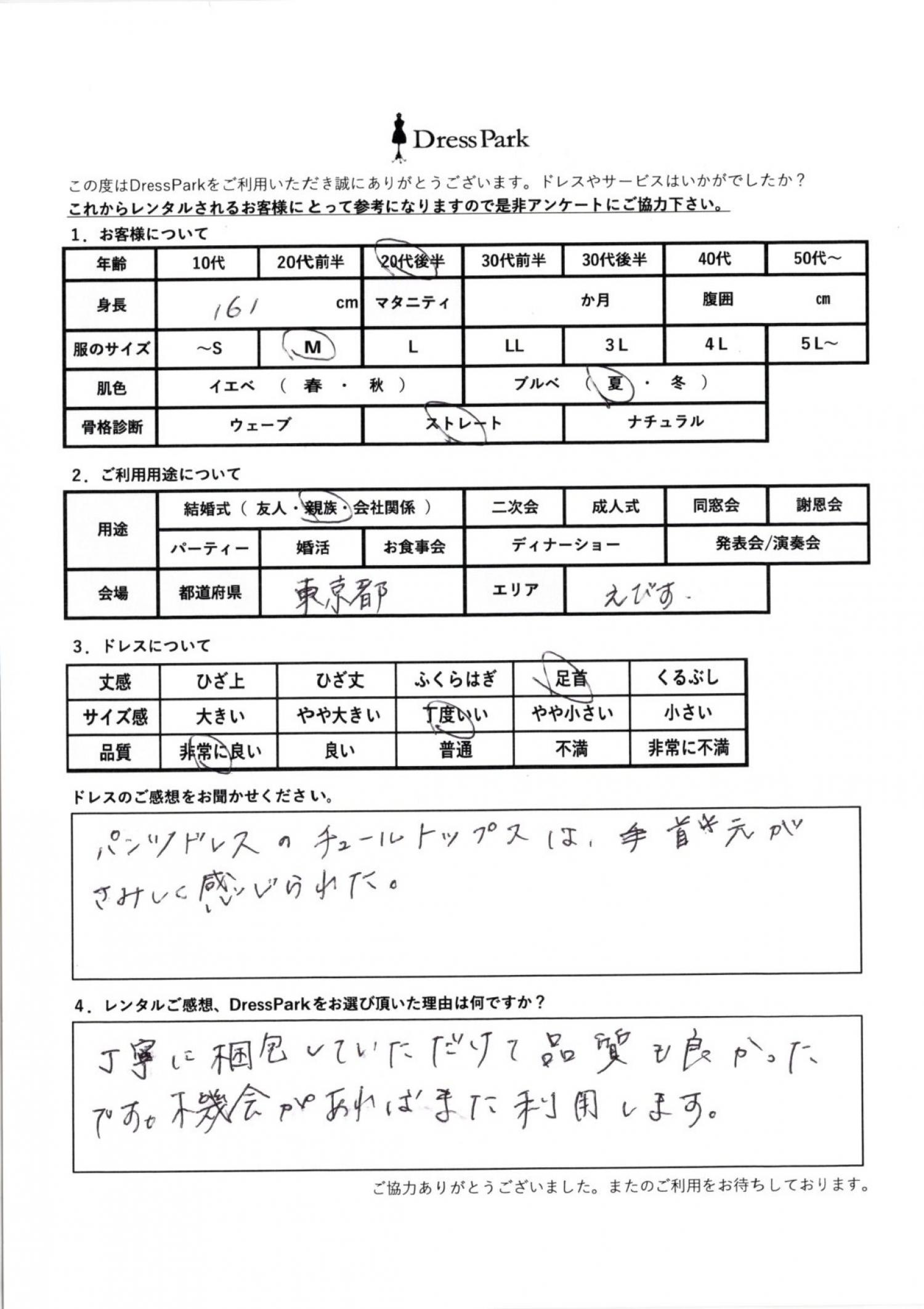 東京都 A.I様161㎝ Mサイズ渋谷・恵比寿 #20代#M/L#160~164㎝#結婚式(親族)#東京都#渋谷・恵比寿 ◆レンタルしたドレスはこちら ◆レンタルしたサイズは:M ◆レンタルした日付:2026/04/04 ドレスの着用感 ◆点数: (5点) ◆丈感:足首 ◆サイズ感:丁度いい ◆品質:非常に良い ◆肌色:ブルべ ◆骨格診断:ストレート ドレスの感想 パンツドレスのチュールトップスは、手首が寂しく感じられた。 レンタルのご感想、DressParkをお選び頂いた理由 丁寧に梱包していただけて品質も良かったです。機会があればまた利用します。 CUSTOMER REVIEWS お客様の声 気になるカテゴリー別にご利用の感想をチェック! ◆AGE 年代で見る 10代 20代 30代 40代 50代~ ◆SIZE サイズで見る SS/S M/L 大きいサイズLL~ ◆HIGHT 身長で見る 140~149㎝ 150~154㎝ 155~159㎝ 160~164㎝ 165~169㎝ 170㎝以上 ◆マタニティ ~3か月 4~6か月 7~8か月 9~10か月 ◆肌色 イエベ ブルべ ◆骨格診断 ウェーブ ストレート ナチュラル ◆利用シーン 結婚式(友人) 結婚式(親族) 結婚式(会社関係) 二次会 成人式/同窓会 謝恩会 パーティー その他 CUSTOMER REVIEWS都道府県別お客様の声 都道府県別にのお客様の声をチェック! 北海道 青森県 岩手県 宮城県 秋田県 山形県 福島県 茨城県 栃木県 群馬県 埼玉県 千葉県 東京都 神奈川県 新潟県 富山県 石川県 福井県 山梨県 長野県 岐阜県 静岡県 愛知県 三重県 滋賀県 京都府 大阪府 兵庫県 奈良県 和歌山県 鳥取県 島根県 岡山県 広島県 山口県 徳島県 香川県 愛媛県 高知県 福岡県 佐賀県 長崎県 熊本県 大分県 宮崎県 鹿児島県 沖縄県 CUSTOMER REVIEWSエリア別お客様の声 都道府県別にのお客様の声をチェック! 札幌 仙台 名古屋 軽井沢 金沢 神戸・芦屋 博多 那覇 梅田・新大阪 難波・心斎橋 鎌倉・湘南 横浜・みなとみらい 舞浜・浦安・幕張 大宮・浦和 青山・表参道 六本木・麻布 渋谷・恵比寿 新宿 池袋 銀座・丸の内 お台場・汐留 鹿児島市 郡山市 福島市 東予 甲府・石和 LINEでお問い合わせ このサイトではJavaScriptを使用しています