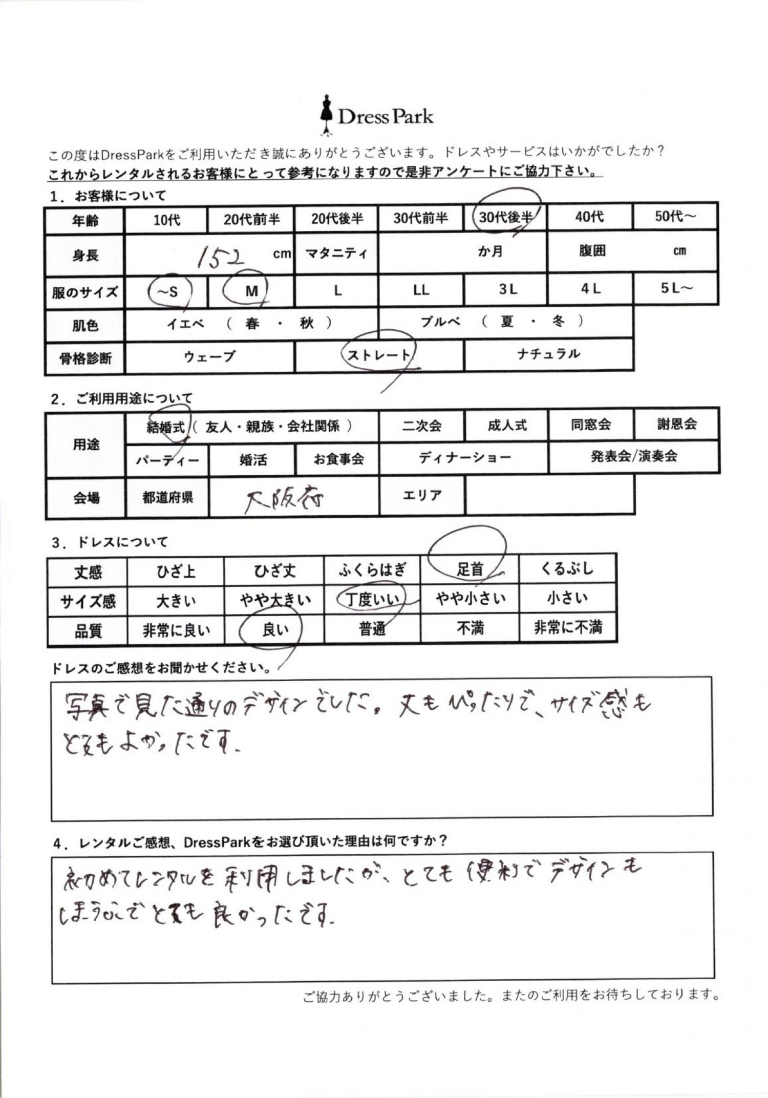 大阪府 N.A様152㎝ Mサイズ #30代#M/L#150~154㎝#結婚式(友人)#大阪府 ◆レンタルしたドレスはこちら ◆レンタルしたサイズは:M ◆レンタルした日付:2026/04/04 ドレスの着用感 ◆点数: (4点) ◆丈感:足首 ◆サイズ感:丁度いい ◆品質:良い ◆骨格診断:ストレート ドレスの感想 写真で見た通りのデザインでした。丈もぴったりでサイズ感もとても良かったです。 レンタルのご感想、DressParkをお選び頂いた理由 初めてレンタルを利用しましたが、とても便利で、デザインも豊富でとても良かったです。 CUSTOMER REVIEWS お客様の声 気になるカテゴリー別にご利用の感想をチェック! ◆AGE 年代で見る 10代 20代 30代 40代 50代~ ◆SIZE サイズで見る SS/S M/L 大きいサイズLL~ ◆HIGHT 身長で見る 140~149㎝ 150~154㎝ 155~159㎝ 160~164㎝ 165~169㎝ 170㎝以上 ◆マタニティ ~3か月 4~6か月 7~8か月 9~10か月 ◆肌色 イエベ ブルべ ◆骨格診断 ウェーブ ストレート ナチュラル ◆利用シーン 結婚式(友人) 結婚式(親族) 結婚式(会社関係) 二次会 成人式/同窓会 謝恩会 パーティー その他 CUSTOMER REVIEWS都道府県別お客様の声 都道府県別にのお客様の声をチェック! 北海道 青森県 岩手県 宮城県 秋田県 山形県 福島県 茨城県 栃木県 群馬県 埼玉県 千葉県 東京都 神奈川県 新潟県 富山県 石川県 福井県 山梨県 長野県 岐阜県 静岡県 愛知県 三重県 滋賀県 京都府 大阪府 兵庫県 奈良県 和歌山県 鳥取県 島根県 岡山県 広島県 山口県 徳島県 香川県 愛媛県 高知県 福岡県 佐賀県 長崎県 熊本県 大分県 宮崎県 鹿児島県 沖縄県 CUSTOMER REVIEWSエリア別お客様の声 都道府県別にのお客様の声をチェック! 札幌 仙台 名古屋 軽井沢 金沢 神戸・芦屋 博多 那覇 梅田・新大阪 難波・心斎橋 鎌倉・湘南 横浜・みなとみらい 舞浜・浦安・幕張 大宮・浦和 青山・表参道 六本木・麻布 渋谷・恵比寿 新宿 池袋 銀座・丸の内 お台場・汐留 鹿児島市 郡山市 福島市 東予 甲府・石和 LINEでお問い合わせ このサイトではJavaScriptを使用しています