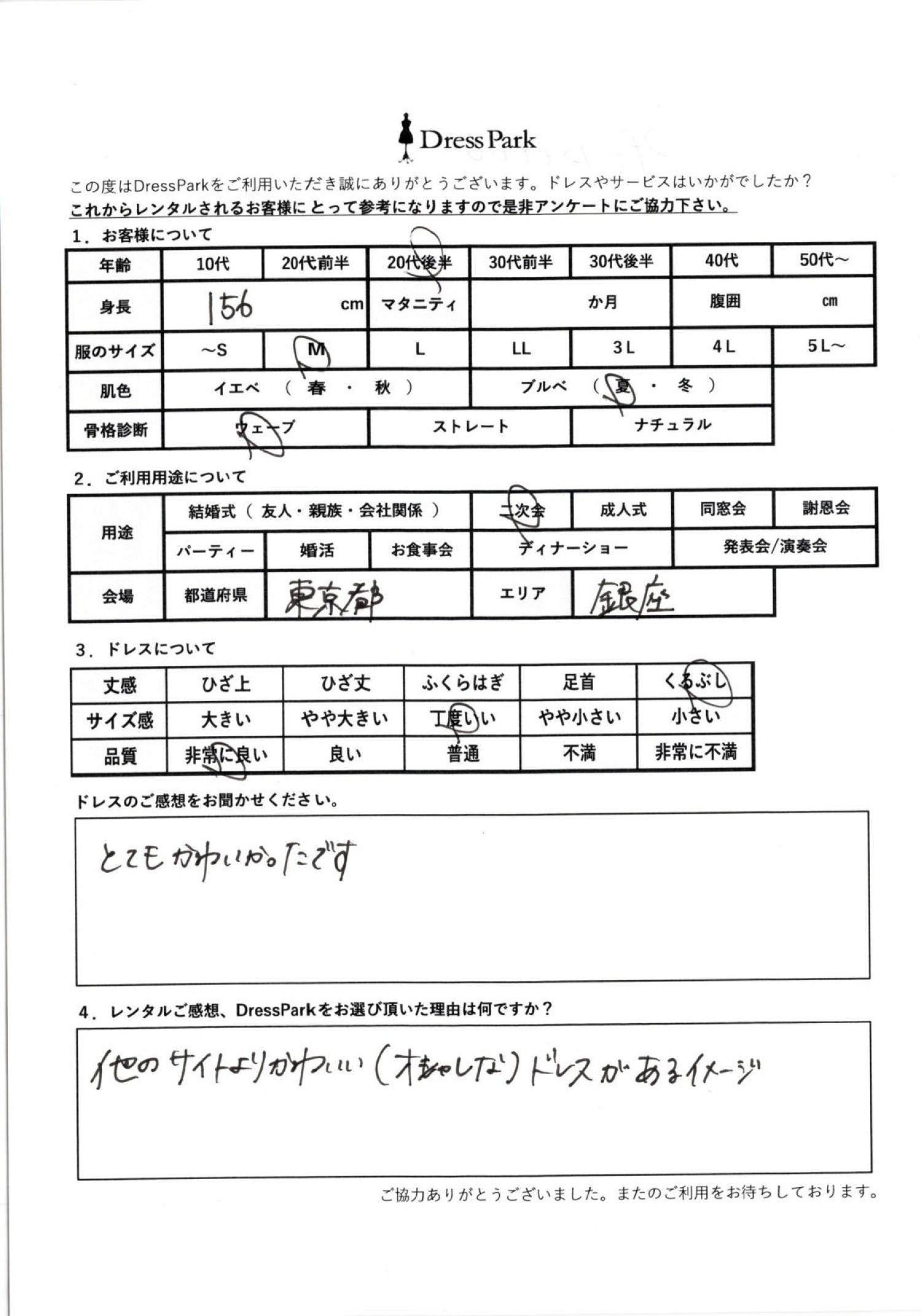 東京都 A.K様156㎝ Mサイズ銀座・丸の内 #20代#M/L#155~159㎝#二次会#東京都#銀座・丸の内 ◆レンタルしたドレスはこちら ◆レンタルしたサイズは:M ◆レンタルした日付:2026/04/04 ドレスの着用感 ◆点数: (5点) ◆丈感:くるぶし ◆サイズ感:丁度いい ◆品質:非常に良い ◆肌色:ブルべ ◆骨格診断:ウェーブ ドレスの感想 とても可愛かったです。 レンタルのご感想、DressParkをお選び頂いた理由 他のサイトより可愛い(おしゃれな)ドレスがあるイメージ。 CUSTOMER REVIEWS お客様の声 気になるカテゴリー別にご利用の感想をチェック! ◆AGE 年代で見る 10代 20代 30代 40代 50代~ ◆SIZE サイズで見る SS/S M/L 大きいサイズLL~ ◆HIGHT 身長で見る 140~149㎝ 150~154㎝ 155~159㎝ 160~164㎝ 165~169㎝ 170㎝以上 ◆マタニティ ~3か月 4~6か月 7~8か月 9~10か月 ◆肌色 イエベ ブルべ ◆骨格診断 ウェーブ ストレート ナチュラル ◆利用シーン 結婚式(友人) 結婚式(親族) 結婚式(会社関係) 二次会 成人式/同窓会 謝恩会 パーティー その他 CUSTOMER REVIEWS都道府県別お客様の声 都道府県別にのお客様の声をチェック! 北海道 青森県 岩手県 宮城県 秋田県 山形県 福島県 茨城県 栃木県 群馬県 埼玉県 千葉県 東京都 神奈川県 新潟県 富山県 石川県 福井県 山梨県 長野県 岐阜県 静岡県 愛知県 三重県 滋賀県 京都府 大阪府 兵庫県 奈良県 和歌山県 鳥取県 島根県 岡山県 広島県 山口県 徳島県 香川県 愛媛県 高知県 福岡県 佐賀県 長崎県 熊本県 大分県 宮崎県 鹿児島県 沖縄県 CUSTOMER REVIEWSエリア別お客様の声 都道府県別にのお客様の声をチェック! 札幌 仙台 名古屋 軽井沢 金沢 神戸・芦屋 博多 那覇 梅田・新大阪 難波・心斎橋 鎌倉・湘南 横浜・みなとみらい 舞浜・浦安・幕張 大宮・浦和 青山・表参道 六本木・麻布 渋谷・恵比寿 新宿 池袋 銀座・丸の内 お台場・汐留 鹿児島市 郡山市 福島市 東予 甲府・石和 LINEでお問い合わせ このサイトではJavaScriptを使用しています