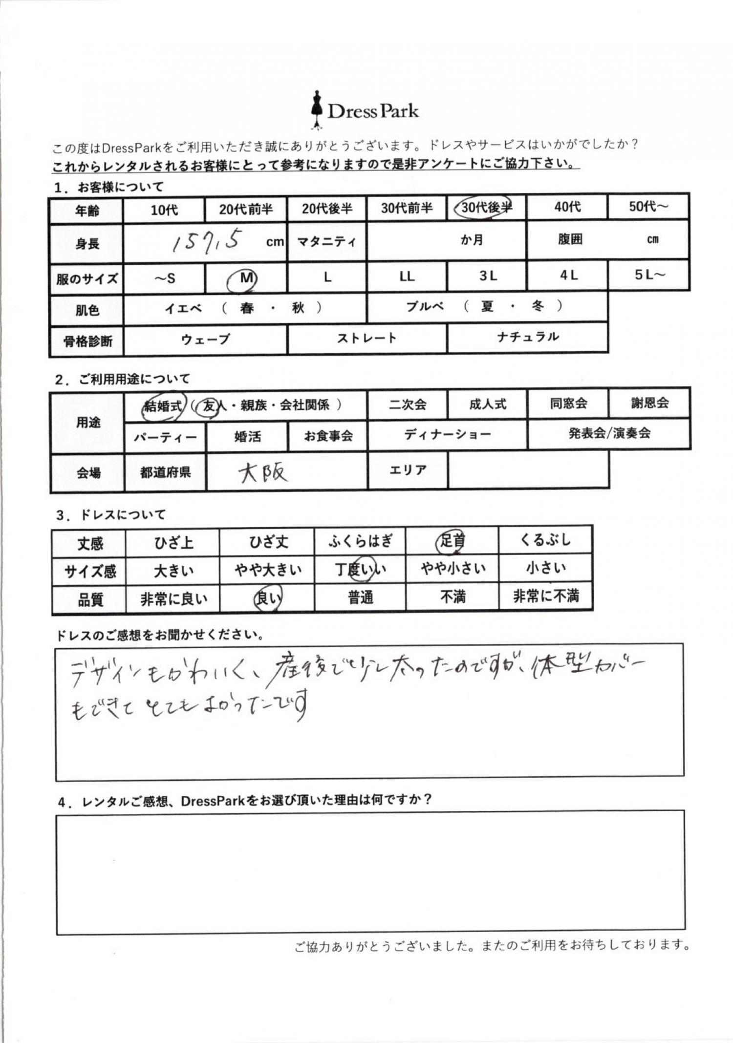 大阪府 S.H様157㎝ Mサイズ #30代#M/L#155~159㎝#結婚式(友人)#大阪府 ◆レンタルしたドレスはこちら ◆レンタルしたサイズは:M ◆レンタルした日付:2026/04/04 ドレスの着用感 ◆点数: (4点) ◆丈感:足首 ◆サイズ感:丁度いい ◆品質:良い ドレスの感想 デザインも可愛く産後で少し太ったのですが、体型カバーもできとてもよかったです。 CUSTOMER REVIEWS お客様の声 気になるカテゴリー別にご利用の感想をチェック! ◆AGE 年代で見る 10代 20代 30代 40代 50代~ ◆SIZE サイズで見る SS/S M/L 大きいサイズLL~ ◆HIGHT 身長で見る 140~149㎝ 150~154㎝ 155~159㎝ 160~164㎝ 165~169㎝ 170㎝以上 ◆マタニティ ~3か月 4~6か月 7~8か月 9~10か月 ◆肌色 イエベ ブルべ ◆骨格診断 ウェーブ ストレート ナチュラル ◆利用シーン 結婚式(友人) 結婚式(親族) 結婚式(会社関係) 二次会 成人式/同窓会 謝恩会 パーティー その他 CUSTOMER REVIEWS都道府県別お客様の声 都道府県別にのお客様の声をチェック! 北海道 青森県 岩手県 宮城県 秋田県 山形県 福島県 茨城県 栃木県 群馬県 埼玉県 千葉県 東京都 神奈川県 新潟県 富山県 石川県 福井県 山梨県 長野県 岐阜県 静岡県 愛知県 三重県 滋賀県 京都府 大阪府 兵庫県 奈良県 和歌山県 鳥取県 島根県 岡山県 広島県 山口県 徳島県 香川県 愛媛県 高知県 福岡県 佐賀県 長崎県 熊本県 大分県 宮崎県 鹿児島県 沖縄県 CUSTOMER REVIEWSエリア別お客様の声 都道府県別にのお客様の声をチェック! 札幌 仙台 名古屋 軽井沢 金沢 神戸・芦屋 博多 那覇 梅田・新大阪 難波・心斎橋 鎌倉・湘南 横浜・みなとみらい 舞浜・浦安・幕張 大宮・浦和 青山・表参道 六本木・麻布 渋谷・恵比寿 新宿 池袋 銀座・丸の内 お台場・汐留 鹿児島市 郡山市 福島市 東予 甲府・石和 LINEでお問い合わせ このサイトではJavaScriptを使用しています