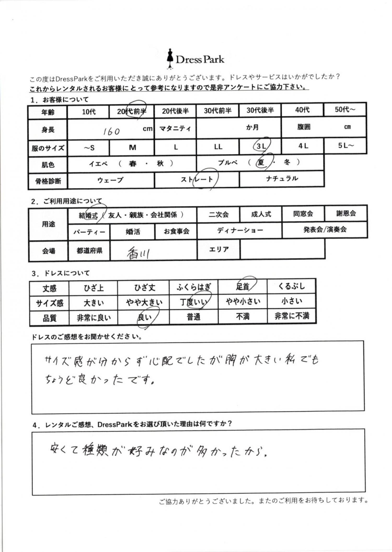 香川県 A.K様160㎝ 3Lサイズ #20代#大きいサイズLL~#160~164㎝#結婚式(友人)#香川県 ◆レンタルしたドレスはこちら ◆レンタルしたサイズは:3L ◆レンタルした日付:2026/04/04 ドレスの着用感 ◆点数: (4点) ◆丈感:足首 ◆サイズ感:丁度いい ◆品質:良い ◆肌色:ブルべ ◆骨格診断:ストレート ドレスの感想 サイズ感がわからず心配でしたが、胸が大きい私でもちょうど良かったです。 レンタルのご感想、DressParkをお選び頂いた理由 安くて種類が好みなのが多かったから。 CUSTOMER REVIEWS お客様の声 気になるカテゴリー別にご利用の感想をチェック! ◆AGE 年代で見る 10代 20代 30代 40代 50代~ ◆SIZE サイズで見る SS/S M/L 大きいサイズLL~ ◆HIGHT 身長で見る 140~149㎝ 150~154㎝ 155~159㎝ 160~164㎝ 165~169㎝ 170㎝以上 ◆マタニティ ~3か月 4~6か月 7~8か月 9~10か月 ◆肌色 イエベ ブルべ ◆骨格診断 ウェーブ ストレート ナチュラル ◆利用シーン 結婚式(友人) 結婚式(親族) 結婚式(会社関係) 二次会 成人式/同窓会 謝恩会 パーティー その他 CUSTOMER REVIEWS都道府県別お客様の声 都道府県別にのお客様の声をチェック! 北海道 青森県 岩手県 宮城県 秋田県 山形県 福島県 茨城県 栃木県 群馬県 埼玉県 千葉県 東京都 神奈川県 新潟県 富山県 石川県 福井県 山梨県 長野県 岐阜県 静岡県 愛知県 三重県 滋賀県 京都府 大阪府 兵庫県 奈良県 和歌山県 鳥取県 島根県 岡山県 広島県 山口県 徳島県 香川県 愛媛県 高知県 福岡県 佐賀県 長崎県 熊本県 大分県 宮崎県 鹿児島県 沖縄県 CUSTOMER REVIEWSエリア別お客様の声 都道府県別にのお客様の声をチェック! 札幌 仙台 名古屋 軽井沢 金沢 神戸・芦屋 博多 那覇 梅田・新大阪 難波・心斎橋 鎌倉・湘南 横浜・みなとみらい 舞浜・浦安・幕張 大宮・浦和 青山・表参道 六本木・麻布 渋谷・恵比寿 新宿 池袋 銀座・丸の内 お台場・汐留 鹿児島市 郡山市 福島市 東予 甲府・石和 LINEでお問い合わせ このサイトではJavaScriptを使用しています