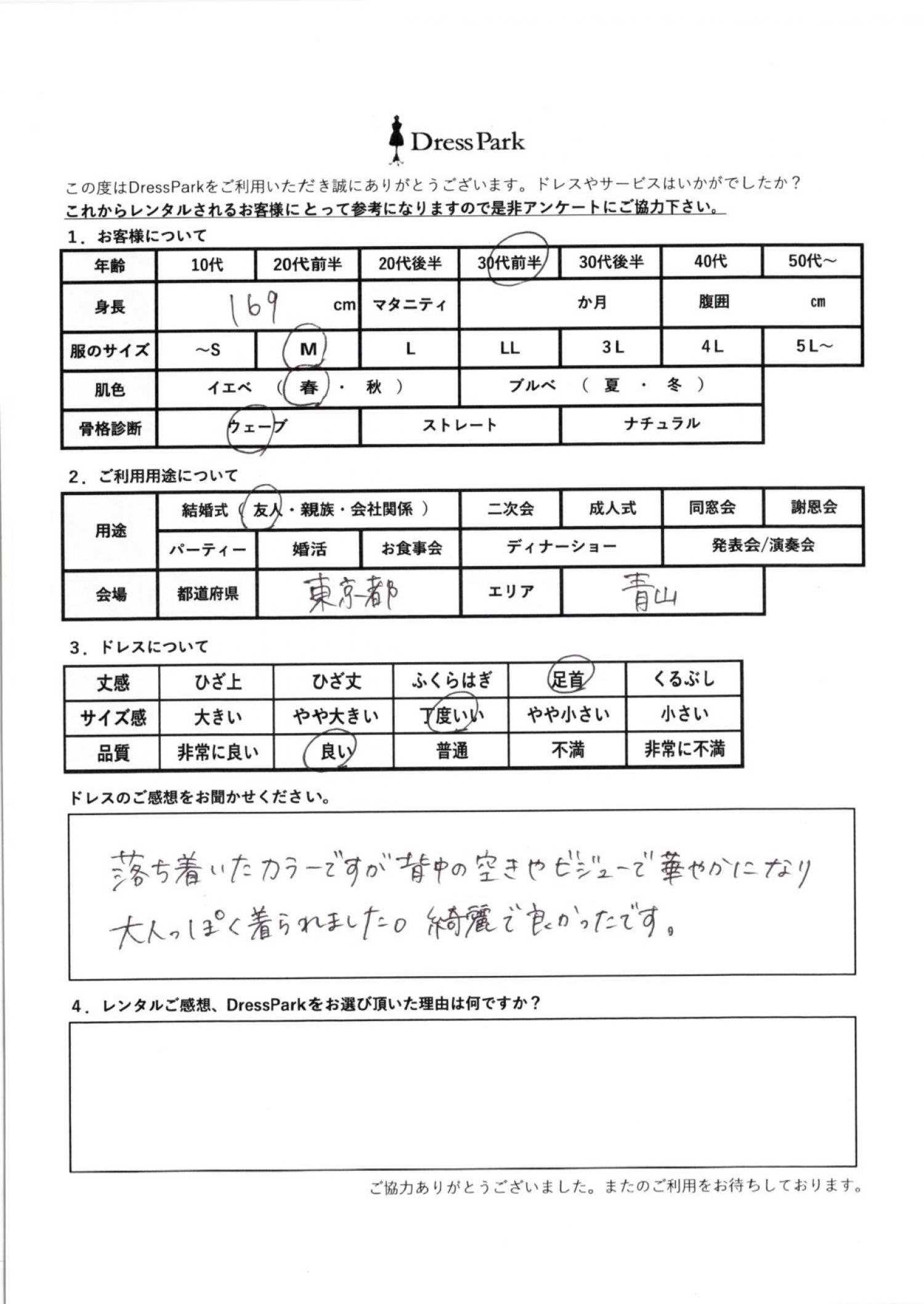 東京都 H.H様169㎝ Mサイズ青山・表参道 #30代#M/L#165~169㎝#結婚式(友人)#東京都#青山・表参道 ◆レンタルしたドレスはこちら ◆レンタルしたサイズは:M ◆レンタルした日付:2026/04/05 ドレスの着用感 ◆点数: (4点) ◆丈感:足首 ◆サイズ感:丁度いい ◆品質:良い ◆肌色:イエベ ◆骨格診断:ウェーブ ドレスの感想 落ち着いたカラーですが、背中の開き具合やビジューで華やかになり大人っぽく着られました。きれいでよかったです。 CUSTOMER REVIEWS お客様の声 気になるカテゴリー別にご利用の感想をチェック! ◆AGE 年代で見る 10代 20代 30代 40代 50代~ ◆SIZE サイズで見る SS/S M/L 大きいサイズLL~ ◆HIGHT 身長で見る 140~149㎝ 150~154㎝ 155~159㎝ 160~164㎝ 165~169㎝ 170㎝以上 ◆マタニティ ~3か月 4~6か月 7~8か月 9~10か月 ◆肌色 イエベ ブルべ ◆骨格診断 ウェーブ ストレート ナチュラル ◆利用シーン 結婚式(友人) 結婚式(親族) 結婚式(会社関係) 二次会 成人式/同窓会 謝恩会 パーティー その他 CUSTOMER REVIEWS都道府県別お客様の声 都道府県別にのお客様の声をチェック! 北海道 青森県 岩手県 宮城県 秋田県 山形県 福島県 茨城県 栃木県 群馬県 埼玉県 千葉県 東京都 神奈川県 新潟県 富山県 石川県 福井県 山梨県 長野県 岐阜県 静岡県 愛知県 三重県 滋賀県 京都府 大阪府 兵庫県 奈良県 和歌山県 鳥取県 島根県 岡山県 広島県 山口県 徳島県 香川県 愛媛県 高知県 福岡県 佐賀県 長崎県 熊本県 大分県 宮崎県 鹿児島県 沖縄県 CUSTOMER REVIEWSエリア別お客様の声 都道府県別にのお客様の声をチェック! 札幌 仙台 名古屋 軽井沢 金沢 神戸・芦屋 博多 那覇 梅田・新大阪 難波・心斎橋 鎌倉・湘南 横浜・みなとみらい 舞浜・浦安・幕張 大宮・浦和 青山・表参道 六本木・麻布 渋谷・恵比寿 新宿 池袋 銀座・丸の内 お台場・汐留 鹿児島市 郡山市 福島市 東予 甲府・石和 LINEでお問い合わせ このサイトではJavaScriptを使用しています