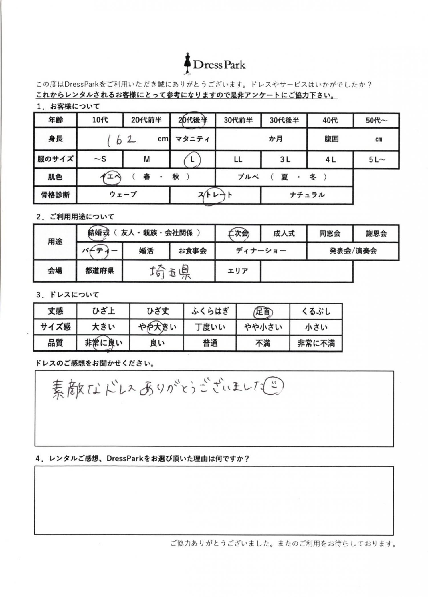 埼玉県 M.I様162㎝ Lサイズ #20代#M/L#160~164㎝#二次会#埼玉県 ◆レンタルしたドレスはこちら ◆レンタルしたサイズは:L ◆レンタルした日付:2026/04/11 ドレスの着用感 ◆点数: (5点) ◆丈感:足首 ◆サイズ感:やや大きい ◆品質:非常に良い ◆肌色:イエベ ◆骨格診断:ストレート ドレスの感想 素敵なドレスありがとうございました。 CUSTOMER REVIEWS お客様の声 気になるカテゴリー別にご利用の感想をチェック! ◆AGE 年代で見る 10代 20代 30代 40代 50代~ ◆SIZE サイズで見る SS/S M/L 大きいサイズLL~ ◆HIGHT 身長で見る 140~149㎝ 150~154㎝ 155~159㎝ 160~164㎝ 165~169㎝ 170㎝以上 ◆マタニティ ~3か月 4~6か月 7~8か月 9~10か月 ◆肌色 イエベ ブルべ ◆骨格診断 ウェーブ ストレート ナチュラル ◆利用シーン 結婚式(友人) 結婚式(親族) 結婚式(会社関係) 二次会 成人式/同窓会 謝恩会 パーティー その他 CUSTOMER REVIEWS都道府県別お客様の声 都道府県別にのお客様の声をチェック! 北海道 青森県 岩手県 宮城県 秋田県 山形県 福島県 茨城県 栃木県 群馬県 埼玉県 千葉県 東京都 神奈川県 新潟県 富山県 石川県 福井県 山梨県 長野県 岐阜県 静岡県 愛知県 三重県 滋賀県 京都府 大阪府 兵庫県 奈良県 和歌山県 鳥取県 島根県 岡山県 広島県 山口県 徳島県 香川県 愛媛県 高知県 福岡県 佐賀県 長崎県 熊本県 大分県 宮崎県 鹿児島県 沖縄県 CUSTOMER REVIEWSエリア別お客様の声 都道府県別にのお客様の声をチェック! 札幌 仙台 名古屋 軽井沢 金沢 神戸・芦屋 博多 那覇 梅田・新大阪 難波・心斎橋 鎌倉・湘南 横浜・みなとみらい 舞浜・浦安・幕張 大宮・浦和 青山・表参道 六本木・麻布 渋谷・恵比寿 新宿 池袋 銀座・丸の内 お台場・汐留 鹿児島市 郡山市 福島市 東予 甲府・石和 LINEでお問い合わせ このサイトではJavaScriptを使用しています