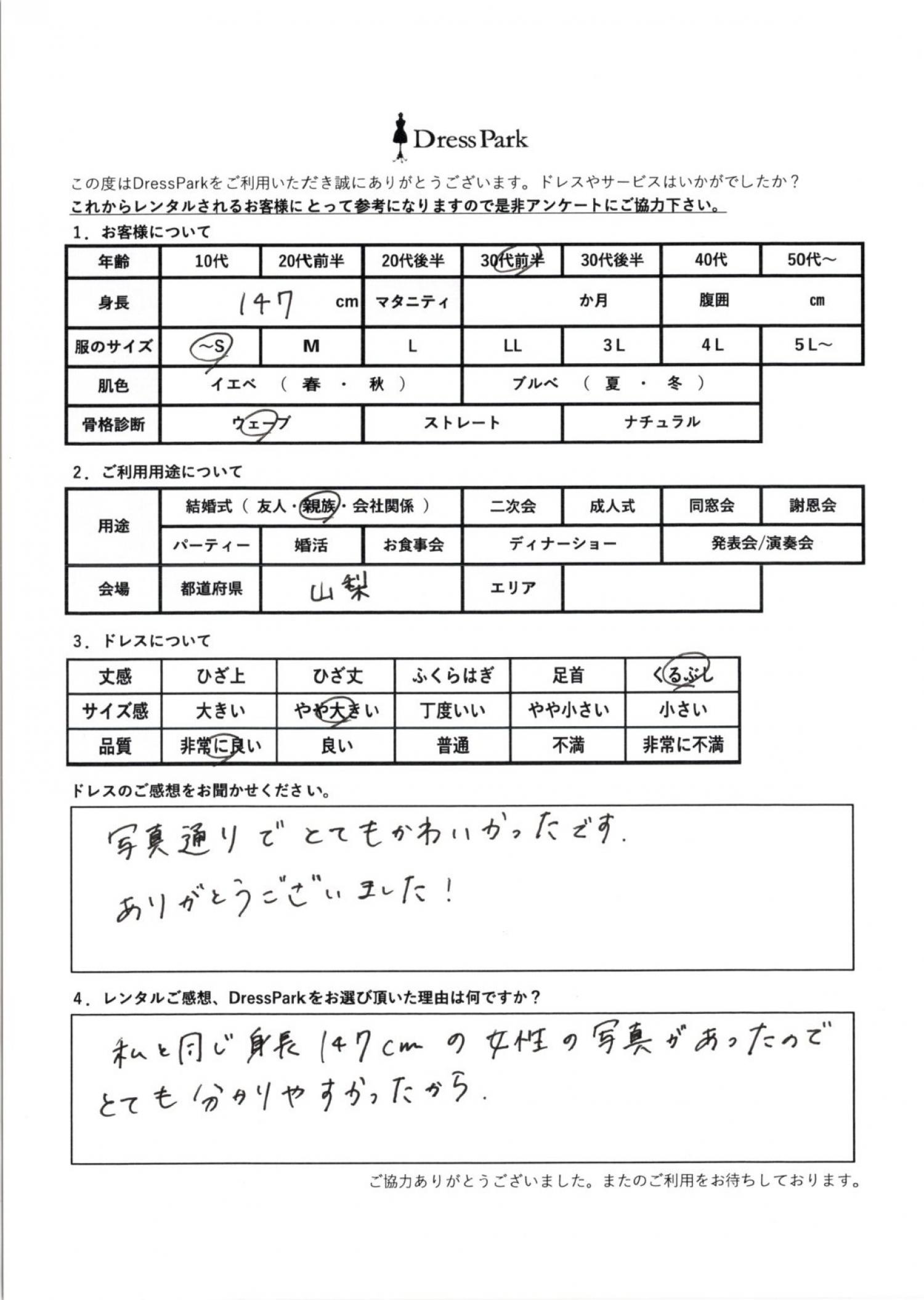 山梨県 K.Y様147㎝ ~Sサイズ #30代#SS/S#140~149㎝#結婚式(親族)#山梨県 ◆レンタルしたドレスはこちら ◆レンタルしたサイズは:M ◆レンタルした日付:2026/04/12 ドレスの着用感 ◆点数: (5点) ◆丈感:くるぶし ◆サイズ感:やや大きい ◆品質:非常に良い ◆骨格診断:ウェーブ ドレスの感想 写真通りでとても可愛かったです。ありがとうございました! レンタルのご感想、DressParkをお選び頂いた理由 私と同じ身長147cmの女性の写真があったので、とてもわかりやすかったから。 CUSTOMER REVIEWS お客様の声 気になるカテゴリー別にご利用の感想をチェック! ◆AGE 年代で見る 10代 20代 30代 40代 50代~ ◆SIZE サイズで見る SS/S M/L 大きいサイズLL~ ◆HIGHT 身長で見る 140~149㎝ 150~154㎝ 155~159㎝ 160~164㎝ 165~169㎝ 170㎝以上 ◆マタニティ ~3か月 4~6か月 7~8か月 9~10か月 ◆肌色 イエベ ブルべ ◆骨格診断 ウェーブ ストレート ナチュラル ◆利用シーン 結婚式(友人) 結婚式(親族) 結婚式(会社関係) 二次会 成人式/同窓会 謝恩会 パーティー その他 CUSTOMER REVIEWS都道府県別お客様の声 都道府県別にのお客様の声をチェック! 北海道 青森県 岩手県 宮城県 秋田県 山形県 福島県 茨城県 栃木県 群馬県 埼玉県 千葉県 東京都 神奈川県 新潟県 富山県 石川県 福井県 山梨県 長野県 岐阜県 静岡県 愛知県 三重県 滋賀県 京都府 大阪府 兵庫県 奈良県 和歌山県 鳥取県 島根県 岡山県 広島県 山口県 徳島県 香川県 愛媛県 高知県 福岡県 佐賀県 長崎県 熊本県 大分県 宮崎県 鹿児島県 沖縄県 CUSTOMER REVIEWSエリア別お客様の声 都道府県別にのお客様の声をチェック! 札幌 仙台 名古屋 軽井沢 金沢 神戸・芦屋 博多 那覇 梅田・新大阪 難波・心斎橋 鎌倉・湘南 横浜・みなとみらい 舞浜・浦安・幕張 大宮・浦和 青山・表参道 六本木・麻布 渋谷・恵比寿 新宿 池袋 銀座・丸の内 お台場・汐留 鹿児島市 郡山市 福島市 東予 甲府・石和 LINEでお問い合わせ このサイトではJavaScriptを使用しています