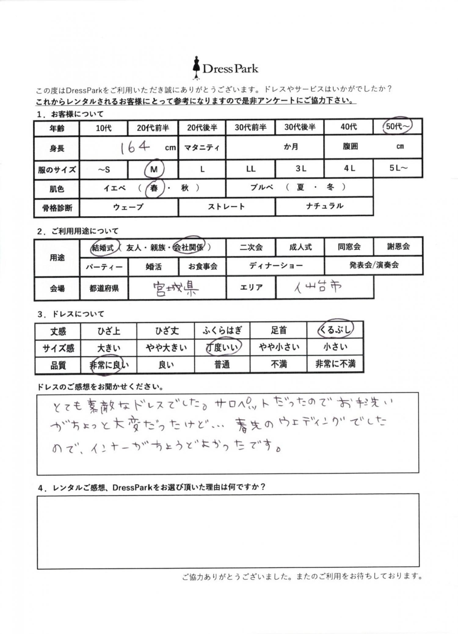 宮城県 K.W様164㎝ Mサイズ仙台 #50代~#M/L#160~164㎝#結婚式(会社関係)#宮城県#仙台 ◆レンタルしたドレスはこちら ◆レンタルしたサイズは:M ◆レンタルした日付:2026/04/11 ドレスの着用感 ◆点数: (5点) ◆丈感:くるぶし ◆サイズ感:丁度いい ◆品質:非常に良い ◆肌色:イエベ ドレスの感想 とても素敵なドレスでした。サロペットだったので、お手洗いがちょっと大変だったけど…春先のウェディングでしたので、インナーがちょうど良かったです。 CUSTOMER REVIEWS お客様の声 気になるカテゴリー別にご利用の感想をチェック! ◆AGE 年代で見る 10代 20代 30代 40代 50代~ ◆SIZE サイズで見る SS/S M/L 大きいサイズLL~ ◆HIGHT 身長で見る 140~149㎝ 150~154㎝ 155~159㎝ 160~164㎝ 165~169㎝ 170㎝以上 ◆マタニティ ~3か月 4~6か月 7~8か月 9~10か月 ◆肌色 イエベ ブルべ ◆骨格診断 ウェーブ ストレート ナチュラル ◆利用シーン 結婚式(友人) 結婚式(親族) 結婚式(会社関係) 二次会 成人式/同窓会 謝恩会 パーティー その他 CUSTOMER REVIEWS都道府県別お客様の声 都道府県別にのお客様の声をチェック! 北海道 青森県 岩手県 宮城県 秋田県 山形県 福島県 茨城県 栃木県 群馬県 埼玉県 千葉県 東京都 神奈川県 新潟県 富山県 石川県 福井県 山梨県 長野県 岐阜県 静岡県 愛知県 三重県 滋賀県 京都府 大阪府 兵庫県 奈良県 和歌山県 鳥取県 島根県 岡山県 広島県 山口県 徳島県 香川県 愛媛県 高知県 福岡県 佐賀県 長崎県 熊本県 大分県 宮崎県 鹿児島県 沖縄県 CUSTOMER REVIEWSエリア別お客様の声 都道府県別にのお客様の声をチェック! 札幌 仙台 名古屋 軽井沢 金沢 神戸・芦屋 博多 那覇 梅田・新大阪 難波・心斎橋 鎌倉・湘南 横浜・みなとみらい 舞浜・浦安・幕張 大宮・浦和 青山・表参道 六本木・麻布 渋谷・恵比寿 新宿 池袋 銀座・丸の内 お台場・汐留 鹿児島市 郡山市 福島市 東予 甲府・石和 LINEでお問い合わせ このサイトではJavaScriptを使用しています