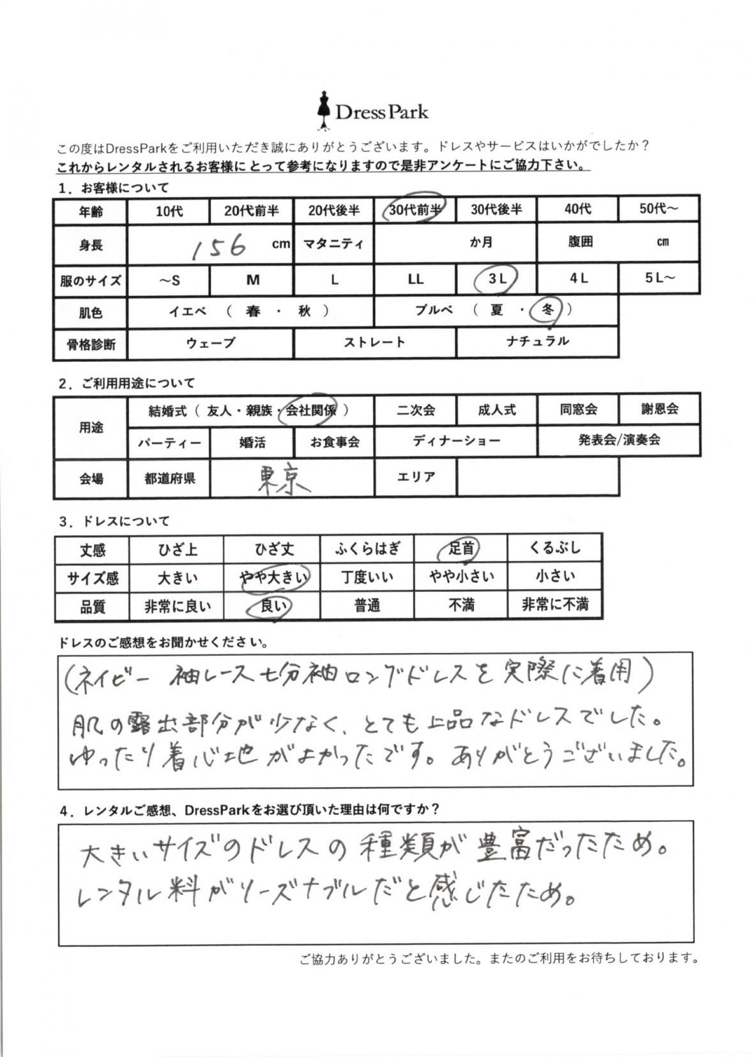肌の露出部分が少なく、とても上品なドレスでした。ゆったり着心地が良かったです。ありがとうございました。レンタルのご感想、