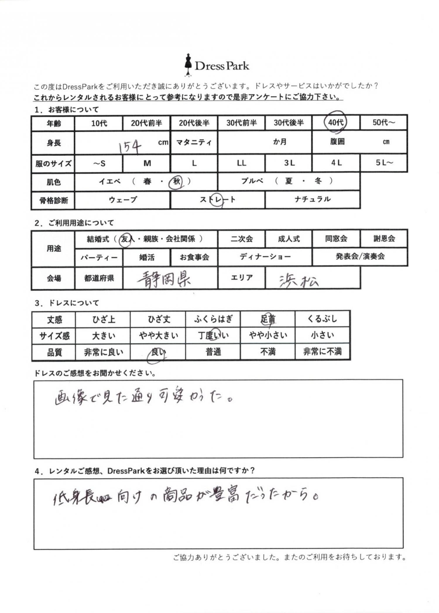 静岡県 Y.I様154㎝ Mサイズ #40代#M/L#150~154㎝#結婚式(友人)#静岡県 ◆レンタルしたドレスはこちら ◆レンタルしたサイズは:M ◆レンタルした日付:2026/04/11 ドレスの着用感 ◆点数: (4点) ◆丈感:足首 ◆サイズ感:丁度いい ◆品質:良い ◆肌色:イエベ ◆骨格診断:ストレート ドレスの感想 画像で見た通り可愛かった。 レンタルのご感想、DressParkをお選び頂いた理由 低身長向けの商品が豊富だったから。 CUSTOMER REVIEWS お客様の声 気になるカテゴリー別にご利用の感想をチェック! ◆AGE 年代で見る 10代 20代 30代 40代 50代~ ◆SIZE サイズで見る SS/S M/L 大きいサイズLL~ ◆HIGHT 身長で見る 140~149㎝ 150~154㎝ 155~159㎝ 160~164㎝ 165~169㎝ 170㎝以上 ◆マタニティ ~3か月 4~6か月 7~8か月 9~10か月 ◆肌色 イエベ ブルべ ◆骨格診断 ウェーブ ストレート ナチュラル ◆利用シーン 結婚式(友人) 結婚式(親族) 結婚式(会社関係) 二次会 成人式/同窓会 謝恩会 パーティー その他 CUSTOMER REVIEWS都道府県別お客様の声 都道府県別にのお客様の声をチェック! 北海道 青森県 岩手県 宮城県 秋田県 山形県 福島県 茨城県 栃木県 群馬県 埼玉県 千葉県 東京都 神奈川県 新潟県 富山県 石川県 福井県 山梨県 長野県 岐阜県 静岡県 愛知県 三重県 滋賀県 京都府 大阪府 兵庫県 奈良県 和歌山県 鳥取県 島根県 岡山県 広島県 山口県 徳島県 香川県 愛媛県 高知県 福岡県 佐賀県 長崎県 熊本県 大分県 宮崎県 鹿児島県 沖縄県 CUSTOMER REVIEWSエリア別お客様の声 都道府県別にのお客様の声をチェック! 札幌 仙台 名古屋 軽井沢 金沢 神戸・芦屋 博多 那覇 梅田・新大阪 難波・心斎橋 鎌倉・湘南 横浜・みなとみらい 舞浜・浦安・幕張 大宮・浦和 青山・表参道 六本木・麻布 渋谷・恵比寿 新宿 池袋 銀座・丸の内 お台場・汐留 鹿児島市 郡山市 福島市 東予 甲府・石和 LINEでお問い合わせ このサイトではJavaScriptを使用しています