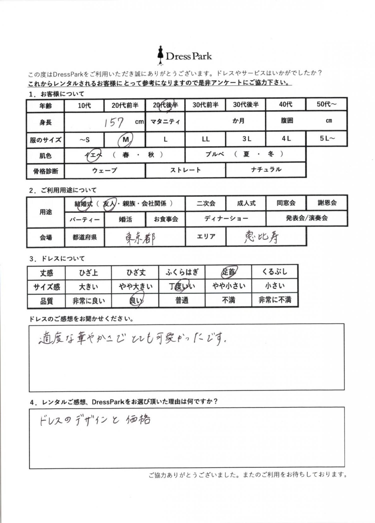 東京都 Y.N様157㎝ Mサイズ渋谷・恵比寿 #20代#M/L#155~159㎝#結婚式(友人)#東京都#渋谷・恵比寿 ◆レンタルしたドレスはこちら ◆レンタルしたサイズは:M ◆レンタルした日付:2026/04/11 ドレスの着用感 ◆点数: (4点) ◆丈感:足首 ◆サイズ感:丁度いい ◆品質:良い ◆肌色:イエベ ドレスの感想 適度の華やかさでとても可愛かったです。 レンタルのご感想、DressParkをお選び頂いた理由 ドレスのデザインと価格 CUSTOMER REVIEWS お客様の声 気になるカテゴリー別にご利用の感想をチェック! ◆AGE 年代で見る 10代 20代 30代 40代 50代~ ◆SIZE サイズで見る SS/S M/L 大きいサイズLL~ ◆HIGHT 身長で見る 140~149㎝ 150~154㎝ 155~159㎝ 160~164㎝ 165~169㎝ 170㎝以上 ◆マタニティ ~3か月 4~6か月 7~8か月 9~10か月 ◆肌色 イエベ ブルべ ◆骨格診断 ウェーブ ストレート ナチュラル ◆利用シーン 結婚式(友人) 結婚式(親族) 結婚式(会社関係) 二次会 成人式/同窓会 謝恩会 パーティー その他 CUSTOMER REVIEWS都道府県別お客様の声 都道府県別にのお客様の声をチェック! 北海道 青森県 岩手県 宮城県 秋田県 山形県 福島県 茨城県 栃木県 群馬県 埼玉県 千葉県 東京都 神奈川県 新潟県 富山県 石川県 福井県 山梨県 長野県 岐阜県 静岡県 愛知県 三重県 滋賀県 京都府 大阪府 兵庫県 奈良県 和歌山県 鳥取県 島根県 岡山県 広島県 山口県 徳島県 香川県 愛媛県 高知県 福岡県 佐賀県 長崎県 熊本県 大分県 宮崎県 鹿児島県 沖縄県 CUSTOMER REVIEWSエリア別お客様の声 都道府県別にのお客様の声をチェック! 札幌 仙台 名古屋 軽井沢 金沢 神戸・芦屋 博多 那覇 梅田・新大阪 難波・心斎橋 鎌倉・湘南 横浜・みなとみらい 舞浜・浦安・幕張 大宮・浦和 青山・表参道 六本木・麻布 渋谷・恵比寿 新宿 池袋 銀座・丸の内 お台場・汐留 鹿児島市 郡山市 福島市 東予 甲府・石和 LINEでお問い合わせ このサイトではJavaScriptを使用しています