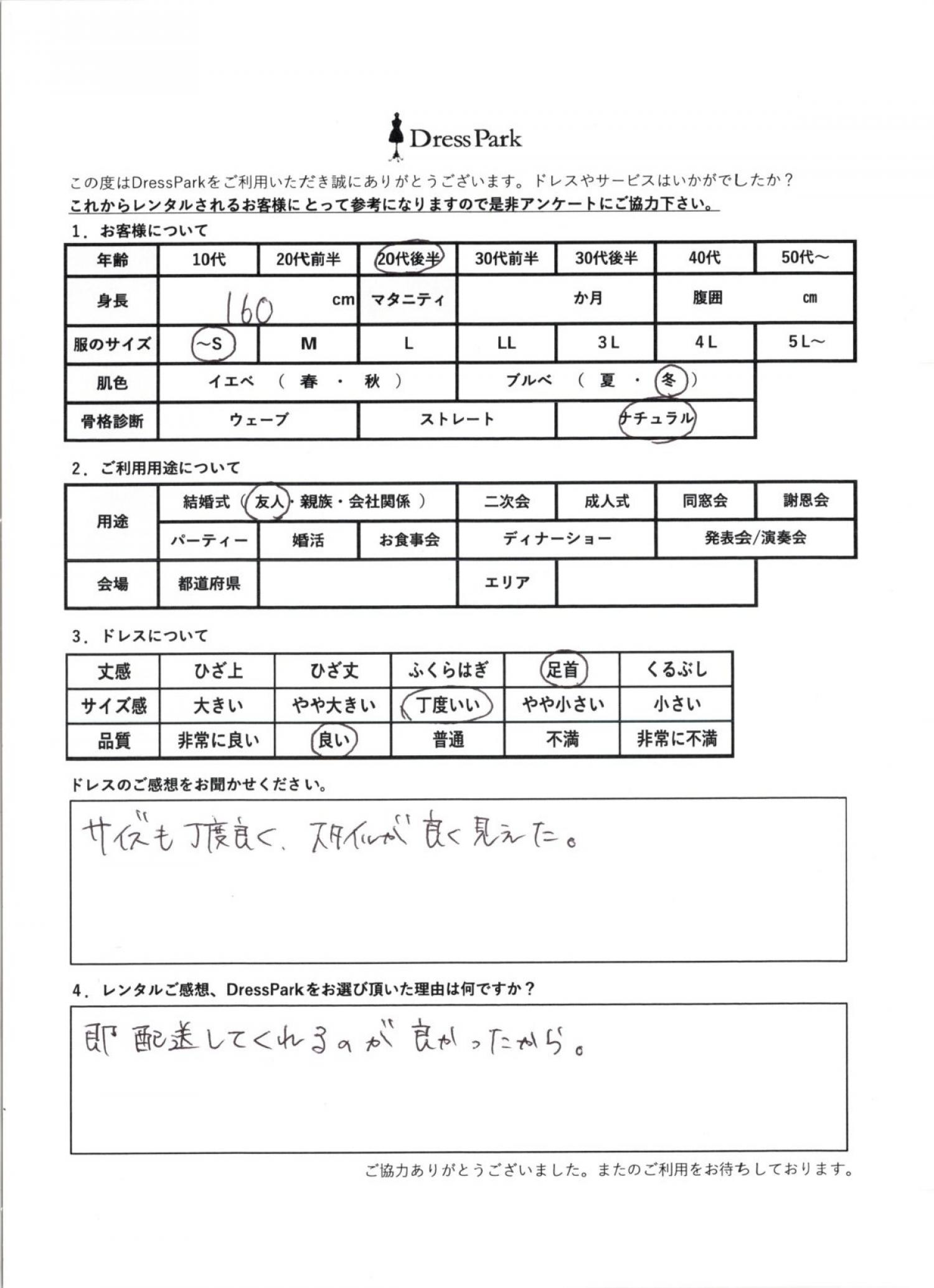 千葉県 M.K様160㎝ ~Sサイズ #20代#SS/S#160~164㎝#結婚式(友人)#千葉県 ◆レンタルしたドレスはこちら ◆レンタルしたサイズは:M ◆レンタルした日付:2026/04/11 ドレスの着用感 ◆点数: (4点) ◆丈感:足首 ◆サイズ感:丁度いい ◆品質:良い ◆肌色:ブルべ ◆骨格診断:ナチュラル ドレスの感想 サイズもちょうど良くスタイルがよく見えた。 レンタルのご感想、DressParkをお選び頂いた理由 即配送してくれるのが良かったから。 CUSTOMER REVIEWS お客様の声 気になるカテゴリー別にご利用の感想をチェック! ◆AGE 年代で見る 10代 20代 30代 40代 50代~ ◆SIZE サイズで見る SS/S M/L 大きいサイズLL~ ◆HIGHT 身長で見る 140~149㎝ 150~154㎝ 155~159㎝ 160~164㎝ 165~169㎝ 170㎝以上 ◆マタニティ ~3か月 4~6か月 7~8か月 9~10か月 ◆肌色 イエベ ブルべ ◆骨格診断 ウェーブ ストレート ナチュラル ◆利用シーン 結婚式(友人) 結婚式(親族) 結婚式(会社関係) 二次会 成人式/同窓会 謝恩会 パーティー その他 CUSTOMER REVIEWS都道府県別お客様の声 都道府県別にのお客様の声をチェック! 北海道 青森県 岩手県 宮城県 秋田県 山形県 福島県 茨城県 栃木県 群馬県 埼玉県 千葉県 東京都 神奈川県 新潟県 富山県 石川県 福井県 山梨県 長野県 岐阜県 静岡県 愛知県 三重県 滋賀県 京都府 大阪府 兵庫県 奈良県 和歌山県 鳥取県 島根県 岡山県 広島県 山口県 徳島県 香川県 愛媛県 高知県 福岡県 佐賀県 長崎県 熊本県 大分県 宮崎県 鹿児島県 沖縄県 CUSTOMER REVIEWSエリア別お客様の声 都道府県別にのお客様の声をチェック! 札幌 仙台 名古屋 軽井沢 金沢 神戸・芦屋 博多 那覇 梅田・新大阪 難波・心斎橋 鎌倉・湘南 横浜・みなとみらい 舞浜・浦安・幕張 大宮・浦和 青山・表参道 六本木・麻布 渋谷・恵比寿 新宿 池袋 銀座・丸の内 お台場・汐留 鹿児島市 郡山市 福島市 東予 甲府・石和 LINEでお問い合わせ このサイトではJavaScriptを使用しています