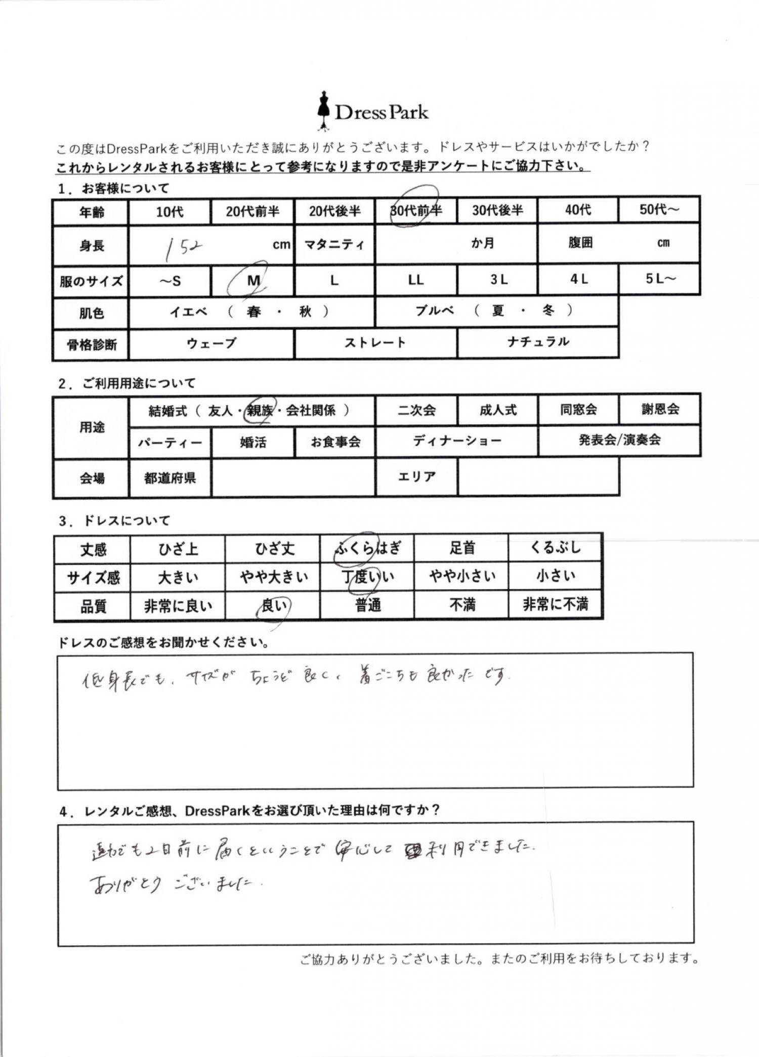 広島県 M.O様152㎝ Mサイズ #30代#M/L#150~154㎝#結婚式(親族)#広島県 ◆レンタルしたドレスはこちら ◆レンタルしたサイズは:M ◆レンタルした日付:2026/04/12 ドレスの着用感 ◆点数: (4点) ◆丈感:ふくらはぎ ◆サイズ感:丁度いい ◆品質:良い ドレスの感想 低身長でもサイズがちょうど良く着心地も良かったです。 レンタルのご感想、DressParkをお選び頂いた理由 遠方でも2日前に届くということで、安心して利用できました。ありがとうございました。 CUSTOMER REVIEWS お客様の声 気になるカテゴリー別にご利用の感想をチェック! ◆AGE 年代で見る 10代 20代 30代 40代 50代~ ◆SIZE サイズで見る SS/S M/L 大きいサイズLL~ ◆HIGHT 身長で見る 140~149㎝ 150~154㎝ 155~159㎝ 160~164㎝ 165~169㎝ 170㎝以上 ◆マタニティ ~3か月 4~6か月 7~8か月 9~10か月 ◆肌色 イエベ ブルべ ◆骨格診断 ウェーブ ストレート ナチュラル ◆利用シーン 結婚式(友人) 結婚式(親族) 結婚式(会社関係) 二次会 成人式/同窓会 謝恩会 パーティー その他 CUSTOMER REVIEWS都道府県別お客様の声 都道府県別にのお客様の声をチェック! 北海道 青森県 岩手県 宮城県 秋田県 山形県 福島県 茨城県 栃木県 群馬県 埼玉県 千葉県 東京都 神奈川県 新潟県 富山県 石川県 福井県 山梨県 長野県 岐阜県 静岡県 愛知県 三重県 滋賀県 京都府 大阪府 兵庫県 奈良県 和歌山県 鳥取県 島根県 岡山県 広島県 山口県 徳島県 香川県 愛媛県 高知県 福岡県 佐賀県 長崎県 熊本県 大分県 宮崎県 鹿児島県 沖縄県 CUSTOMER REVIEWSエリア別お客様の声 都道府県別にのお客様の声をチェック! 札幌 仙台 名古屋 軽井沢 金沢 神戸・芦屋 博多 那覇 梅田・新大阪 難波・心斎橋 鎌倉・湘南 横浜・みなとみらい 舞浜・浦安・幕張 大宮・浦和 青山・表参道 六本木・麻布 渋谷・恵比寿 新宿 池袋 銀座・丸の内 お台場・汐留 鹿児島市 郡山市 福島市 東予 甲府・石和 LINEでお問い合わせ このサイトではJavaScriptを使用しています