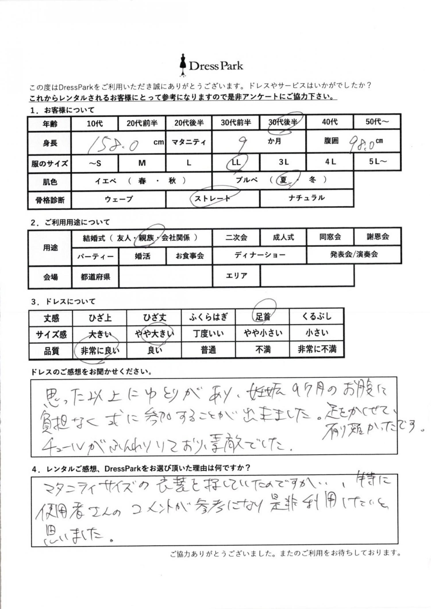 思った以上にゆとりがあり、妊娠9ヶ月のお腹に負担なく、式に参加することができました。足を隠せてありがたかったです。チュールがふんわりしており素敵でした。レンタルのご感想、